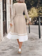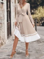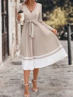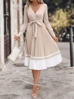 Be the first to review “SMY Clasi Women’s Elegant Fitted Knit V-Neck Contrast Color Pleated Hem Dress” Cancel reply