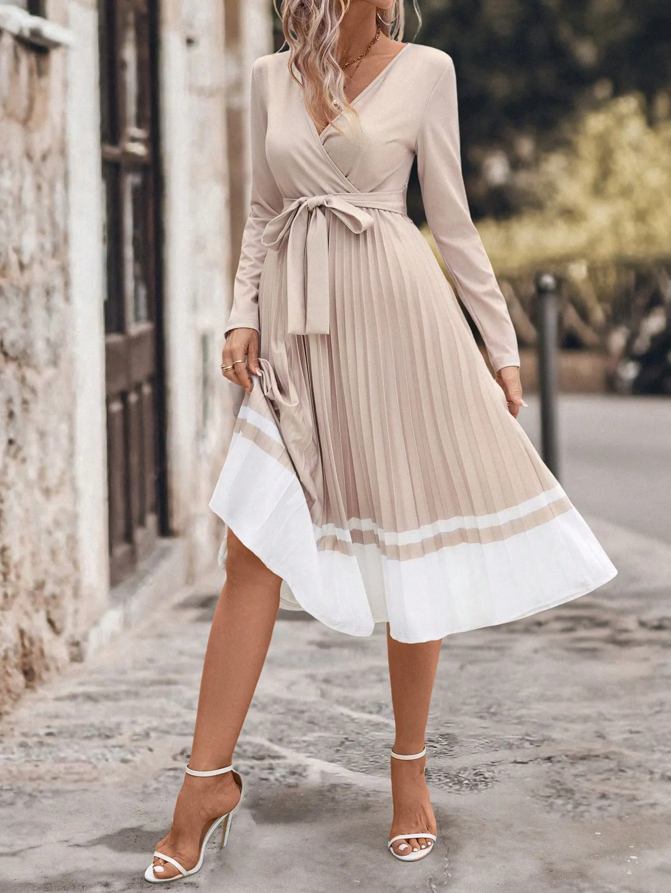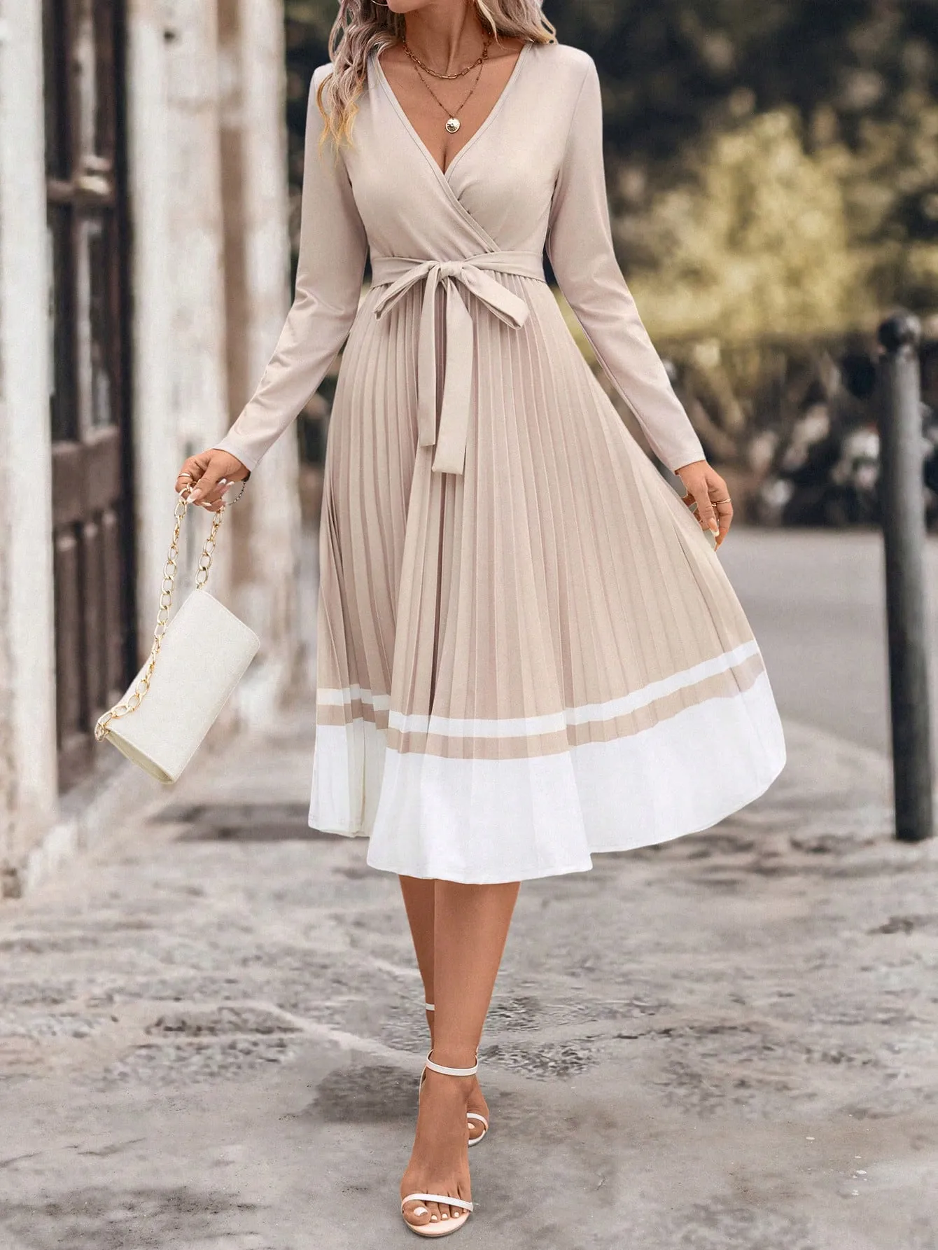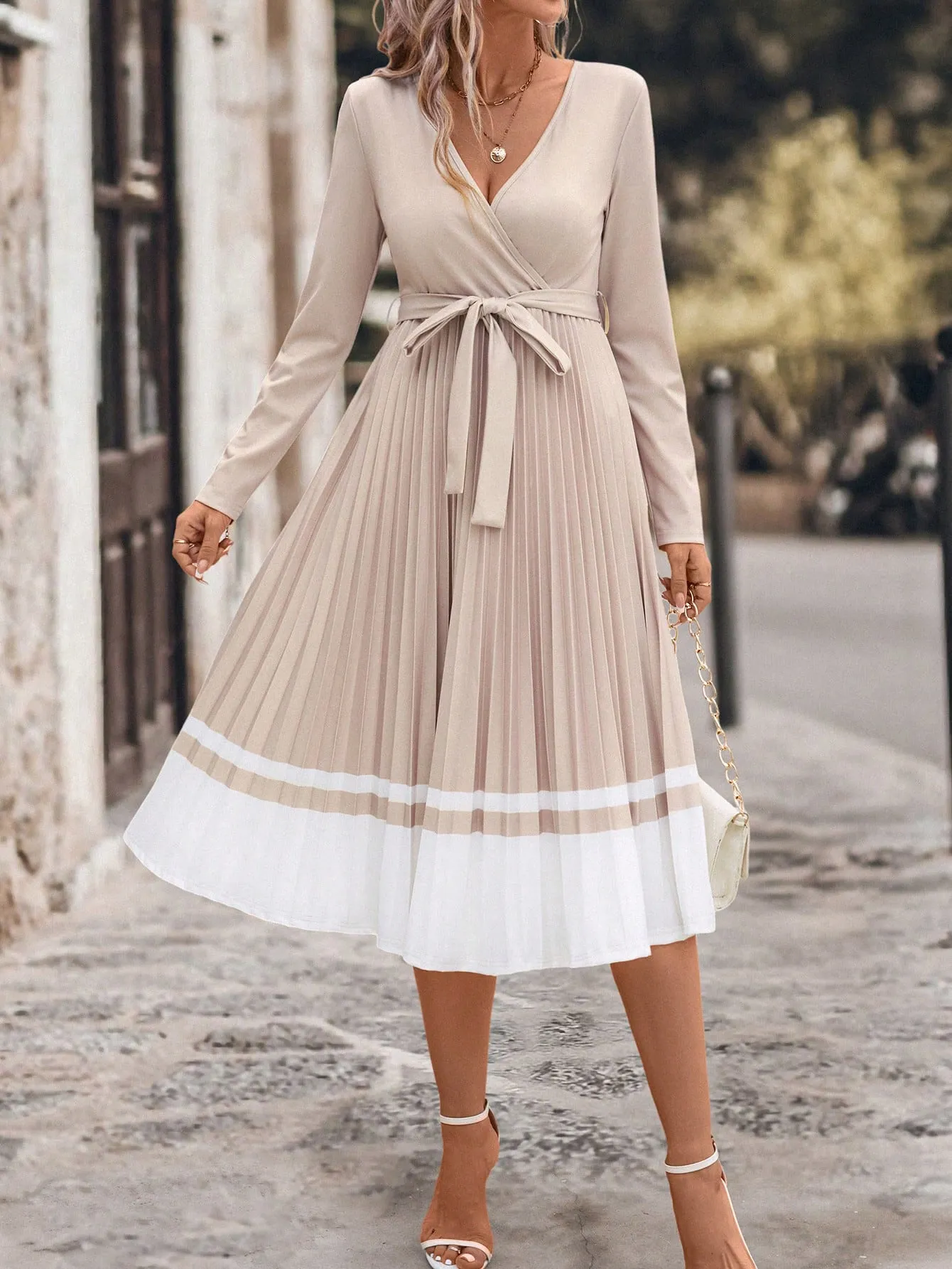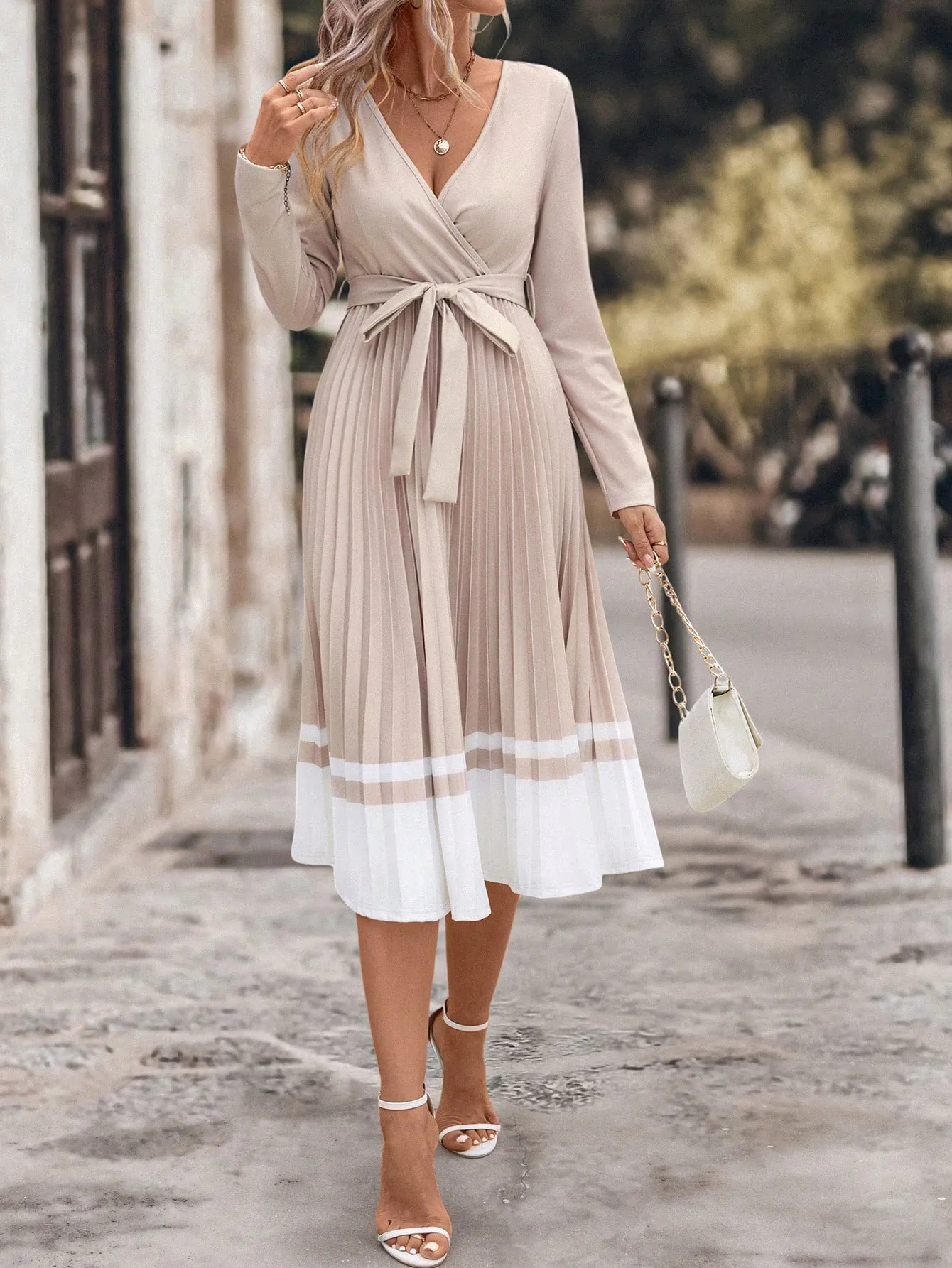 SMY Clasi Women’s Elegant Fitted Knit V-Neck Contrast Color Pleated Hem Dress