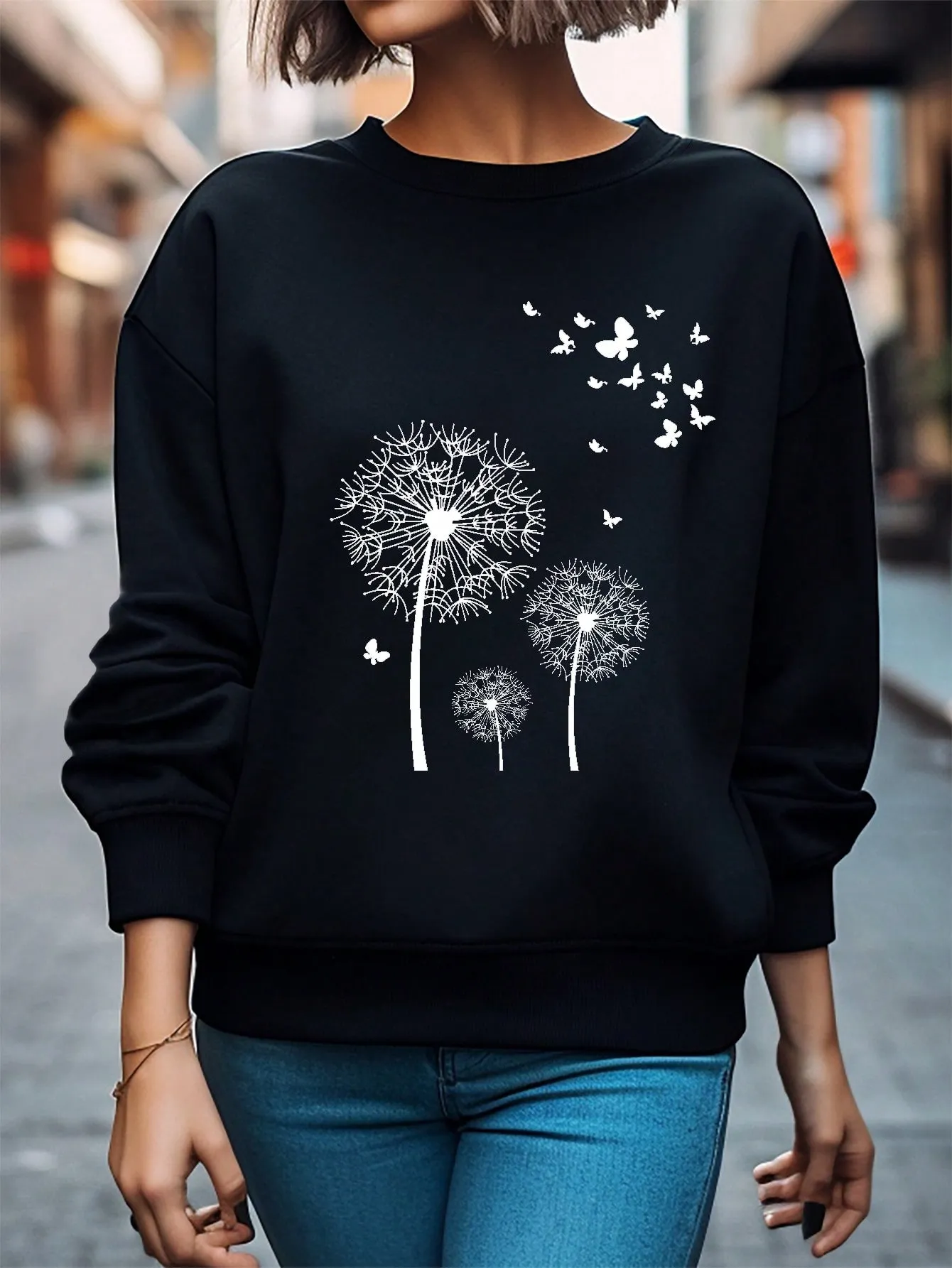 SMY Dandelion & Butterfly Print Drop Shoulder Sweatshirt