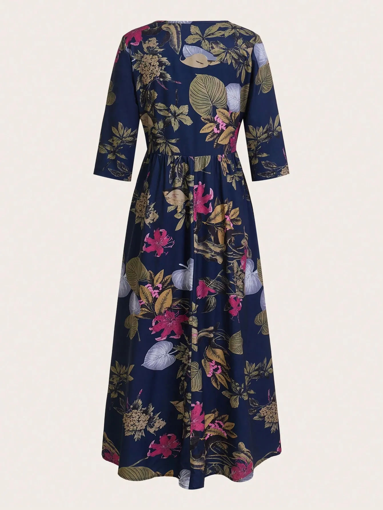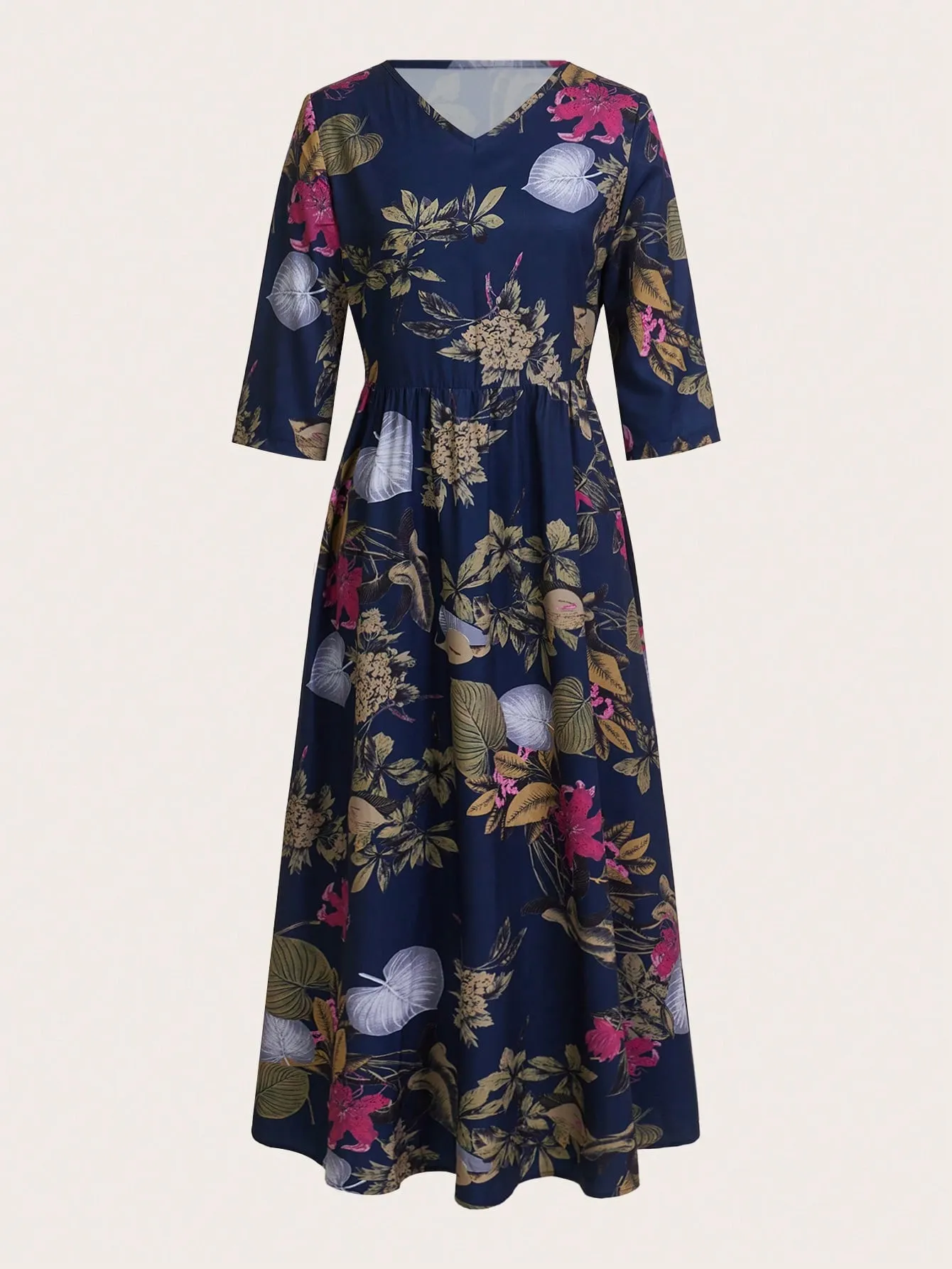 SMY Plus Size Women’s Digital Floral Print V-Neck Flare Hem Dress, Casual Style