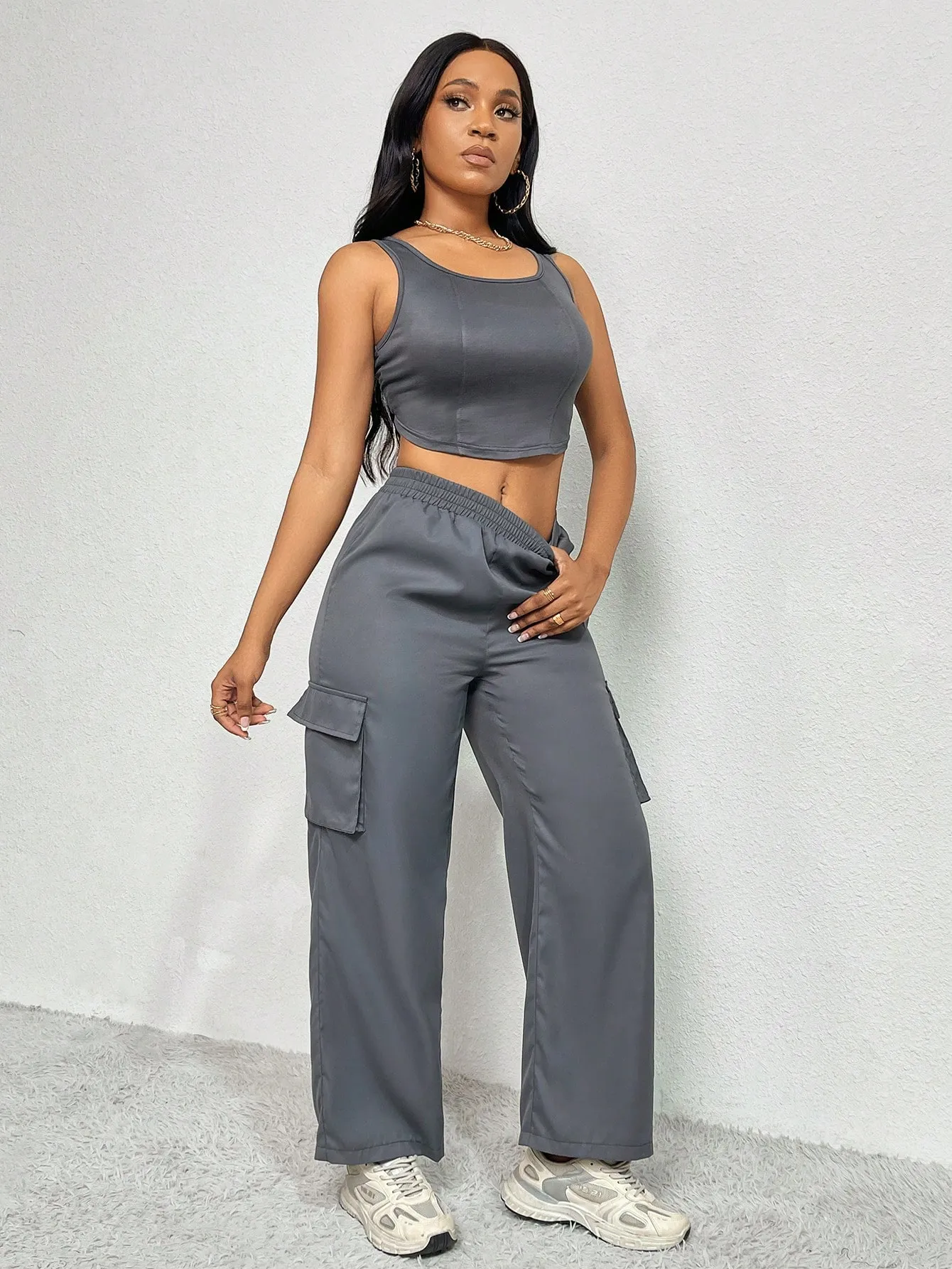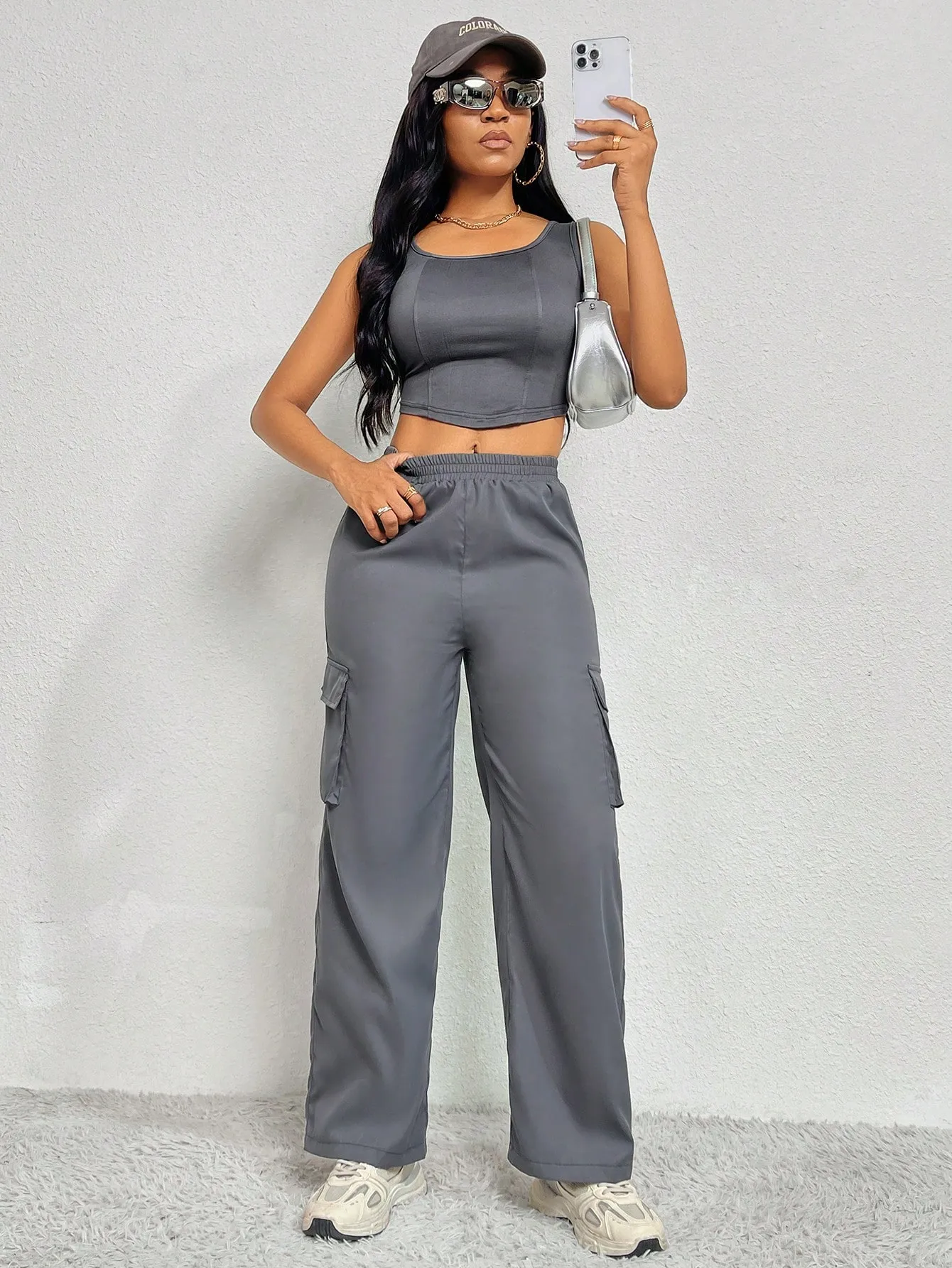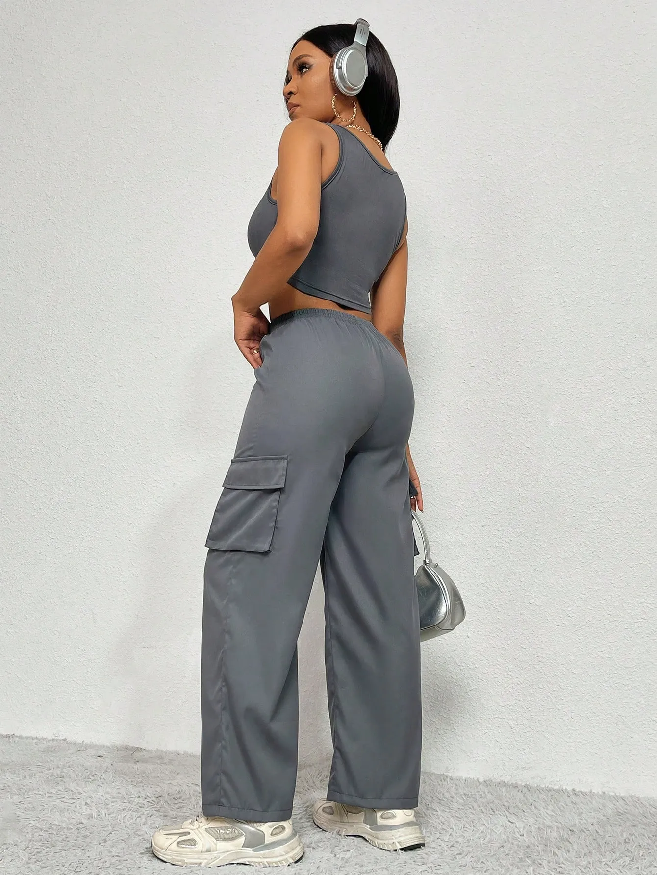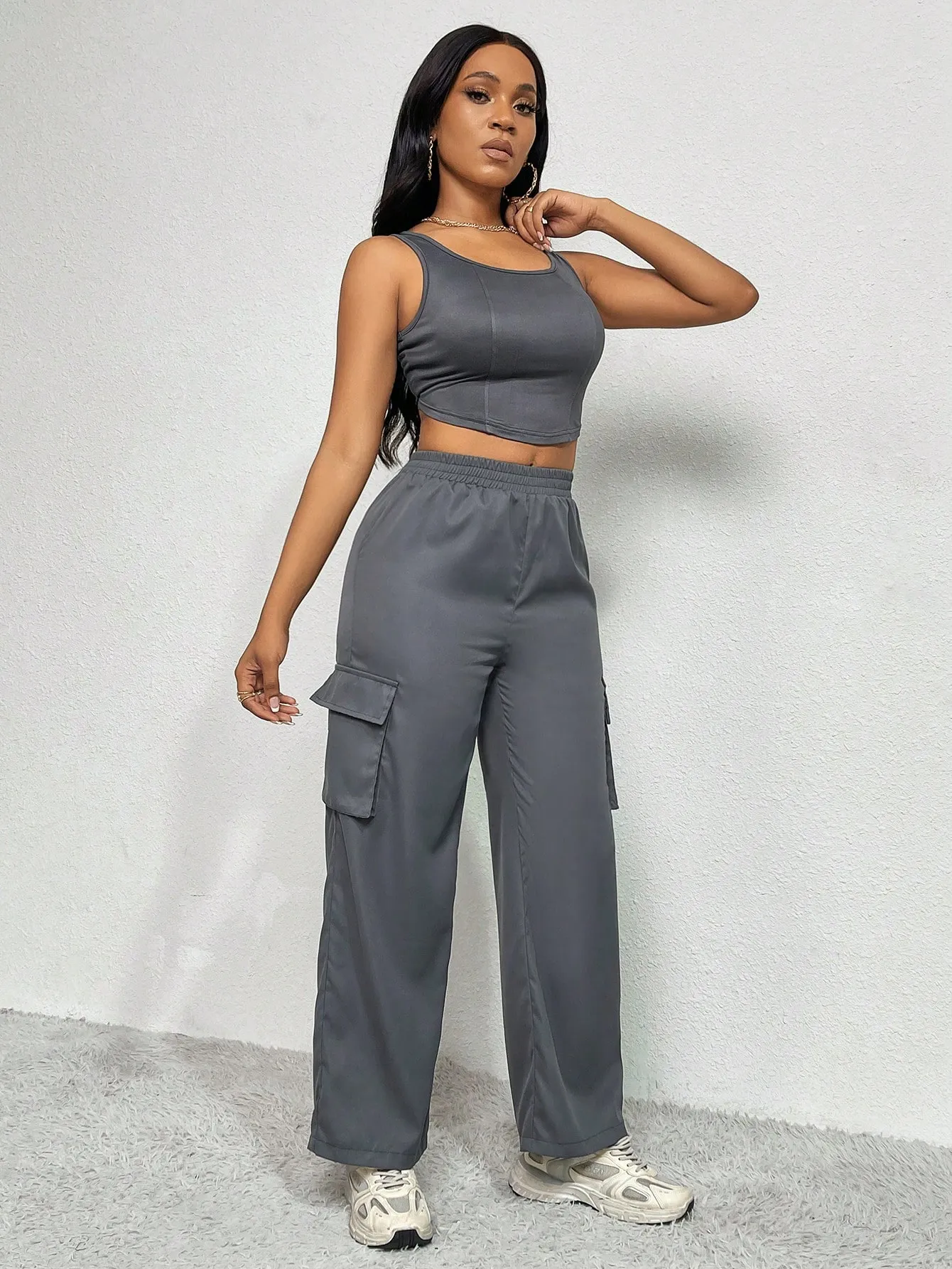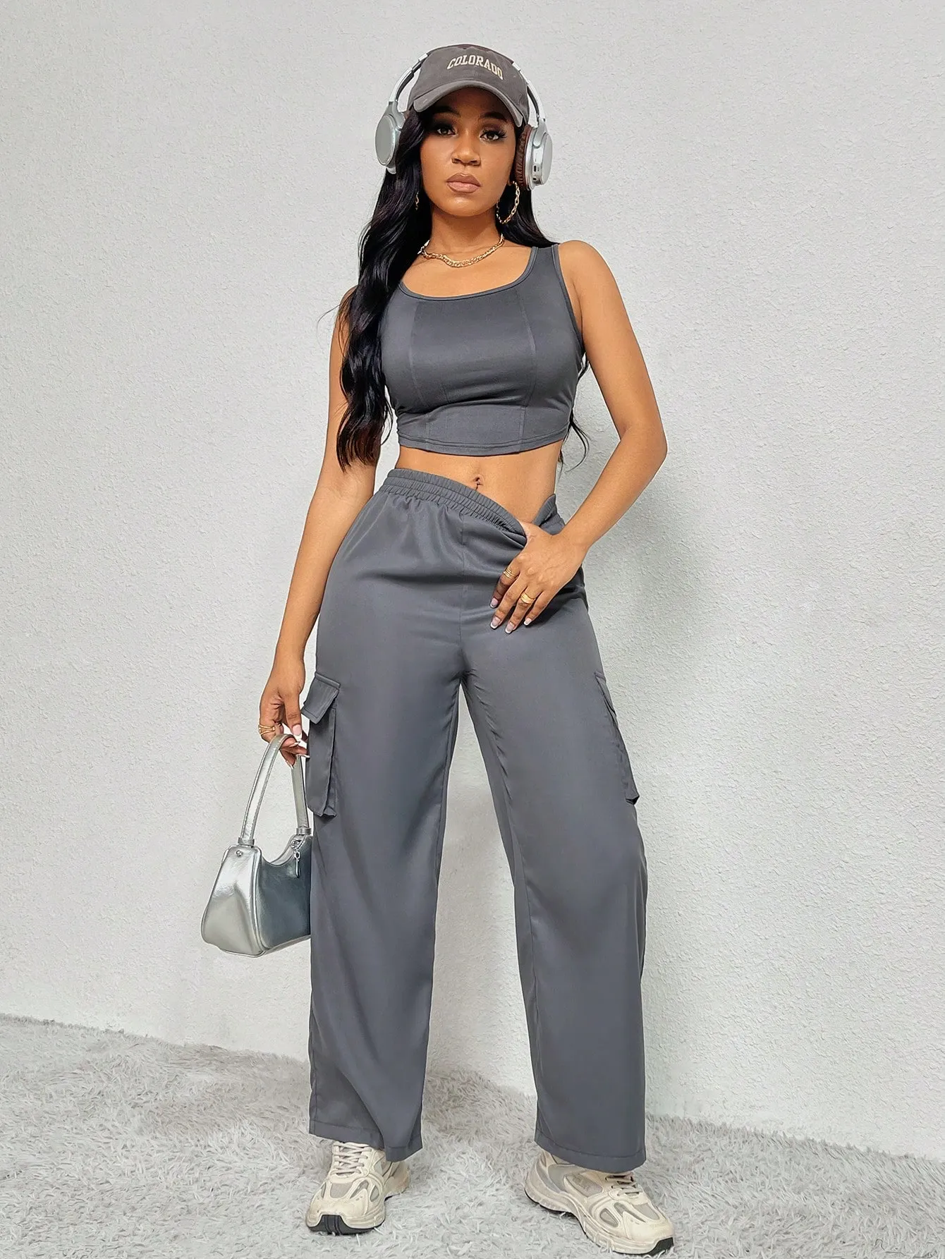 SMY Slayr 2pcs Women Casual Sleeveless Crew Neck Tank Top And Pocketed Long Pants Sports Suit