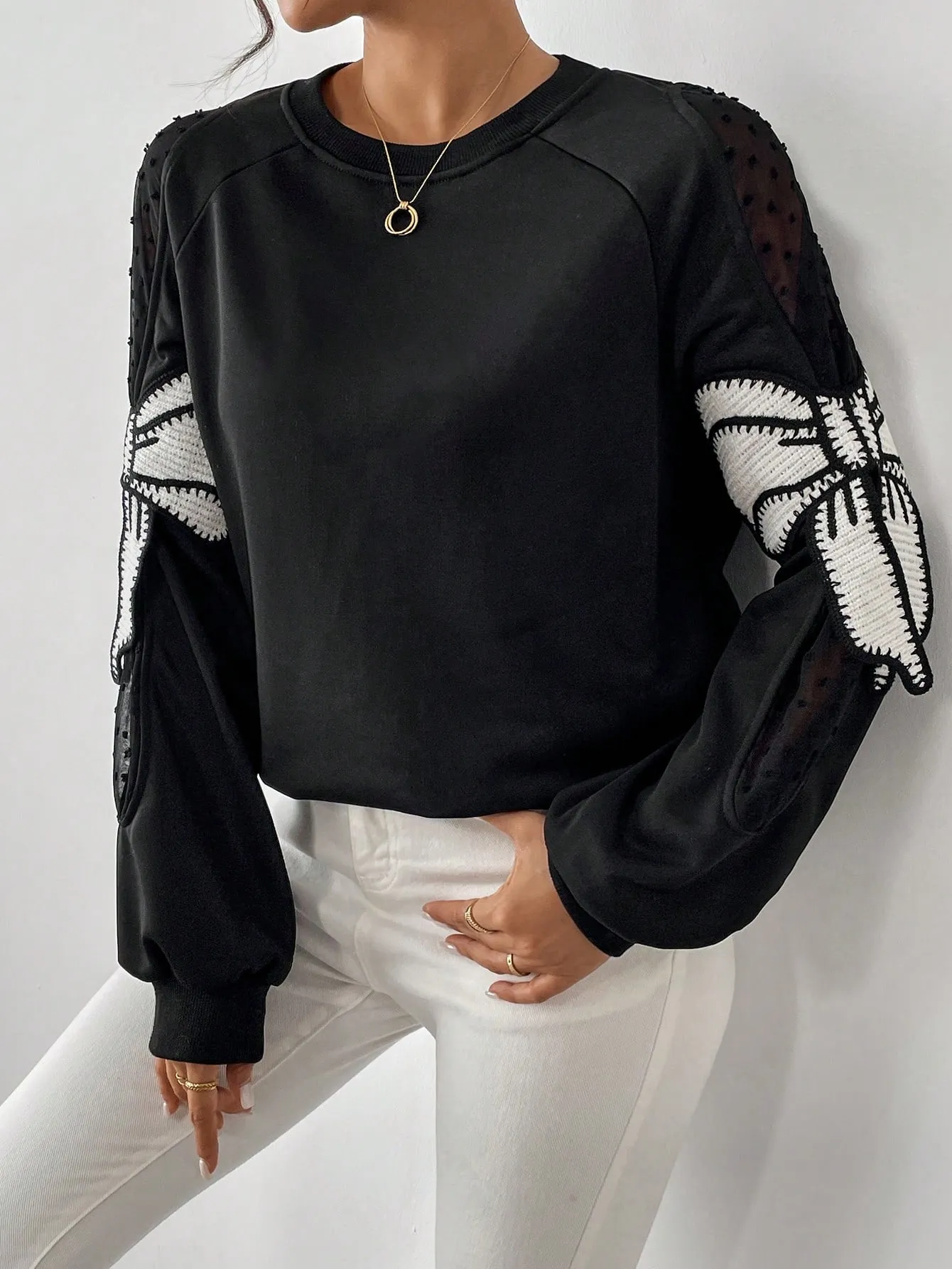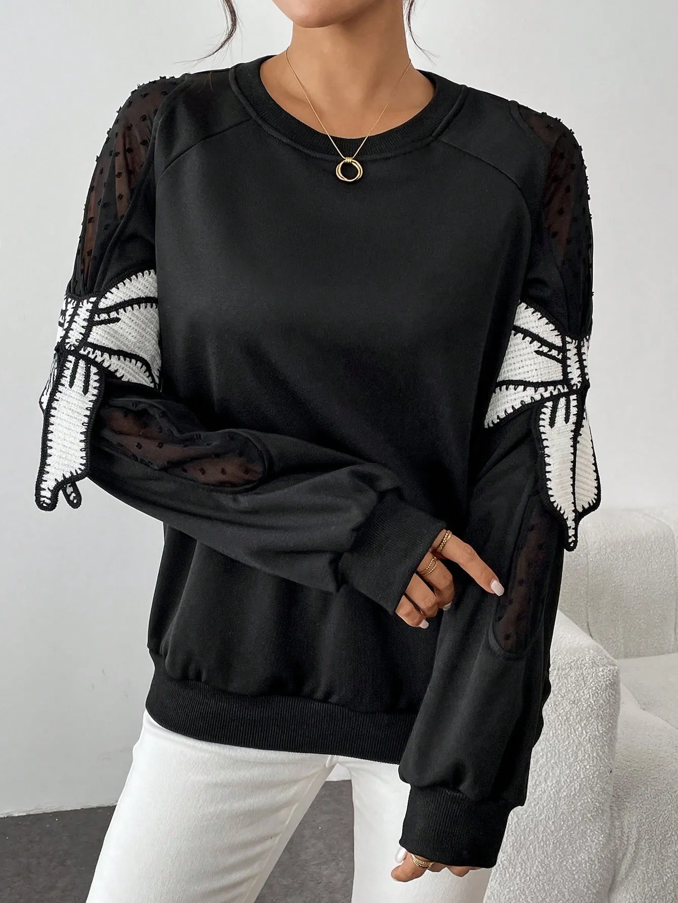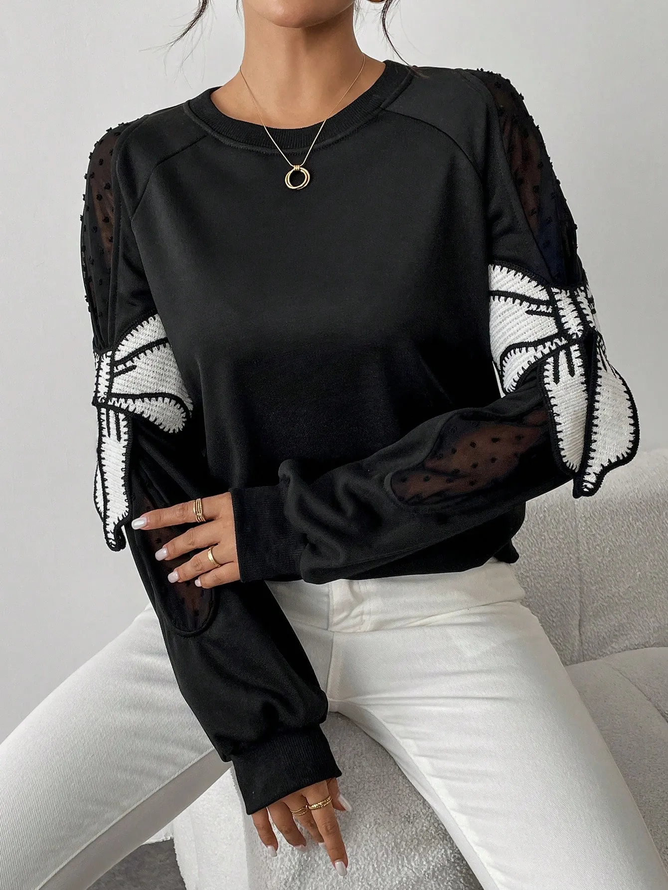 SMY 1pc Women Stylish Elegant Black Mesh Polka Dot Sleeve Rhinestone Decorated Sweatshirt