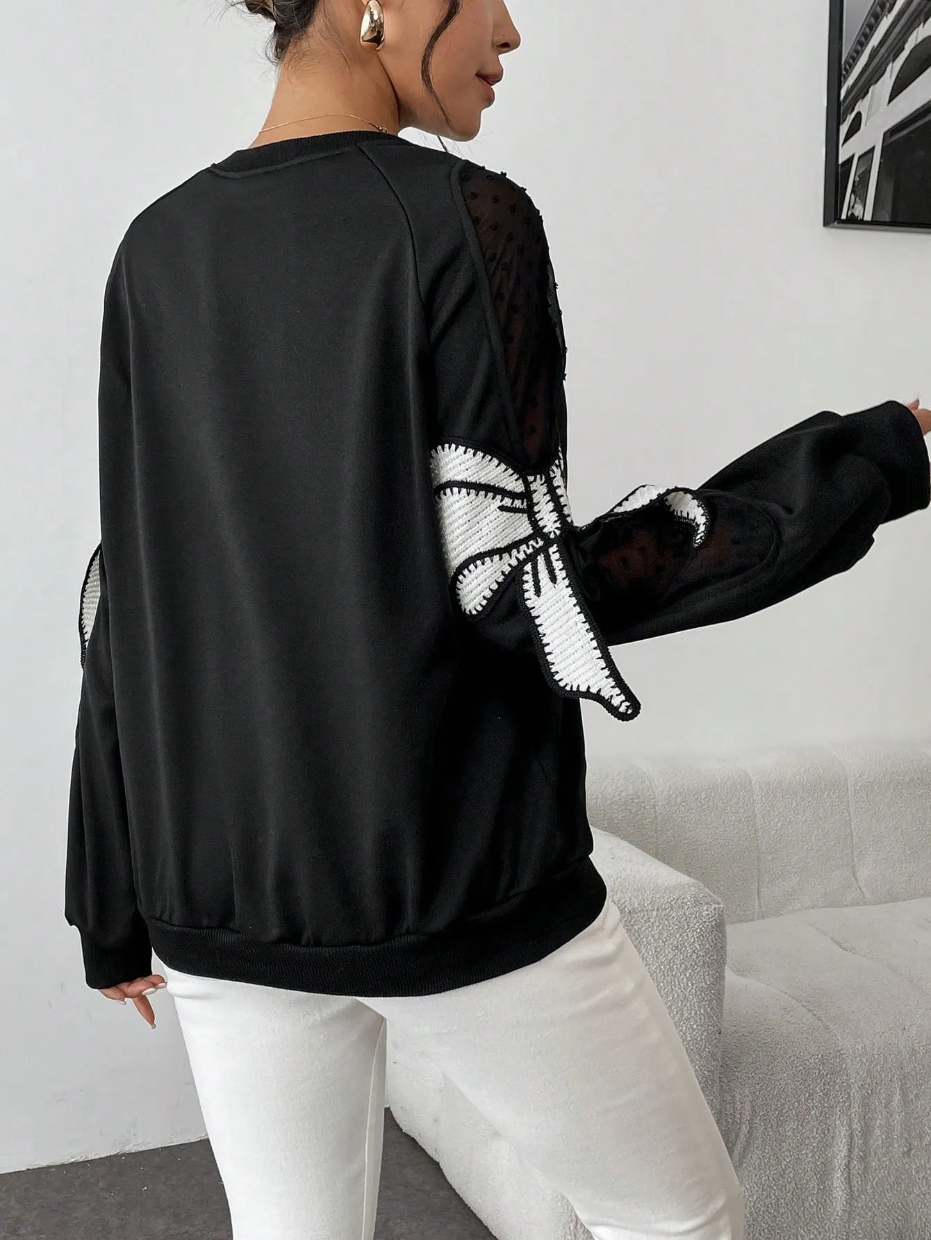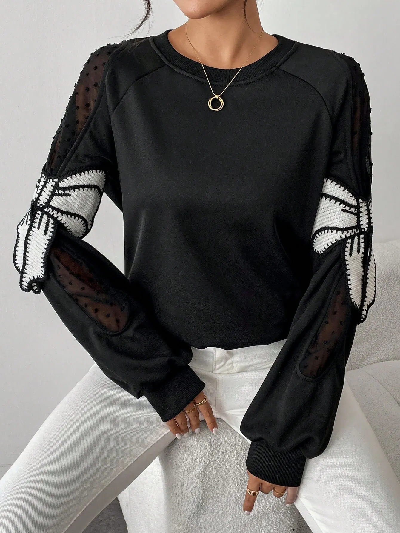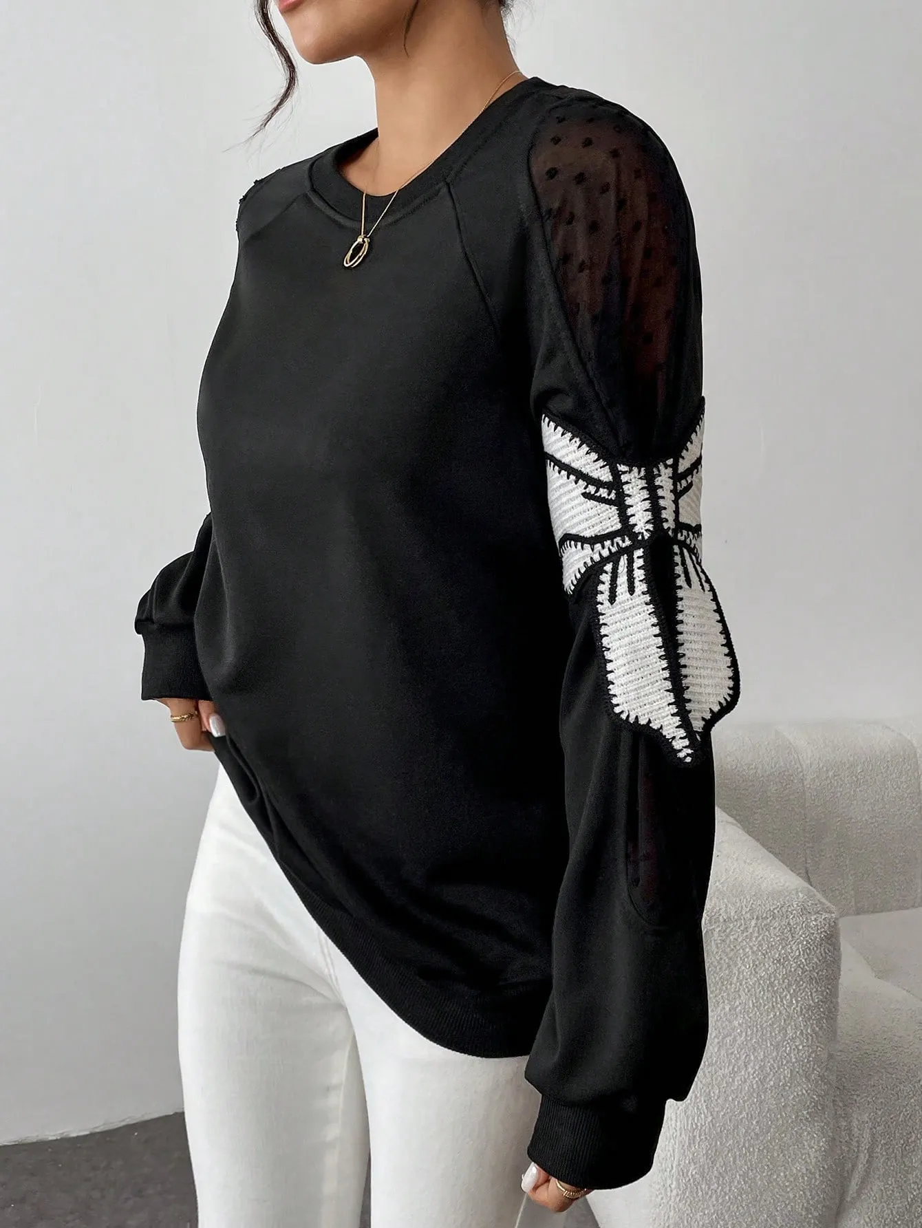 SMY 1pc Women Stylish Elegant Black Mesh Polka Dot Sleeve Rhinestone Decorated Sweatshirt