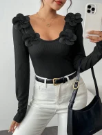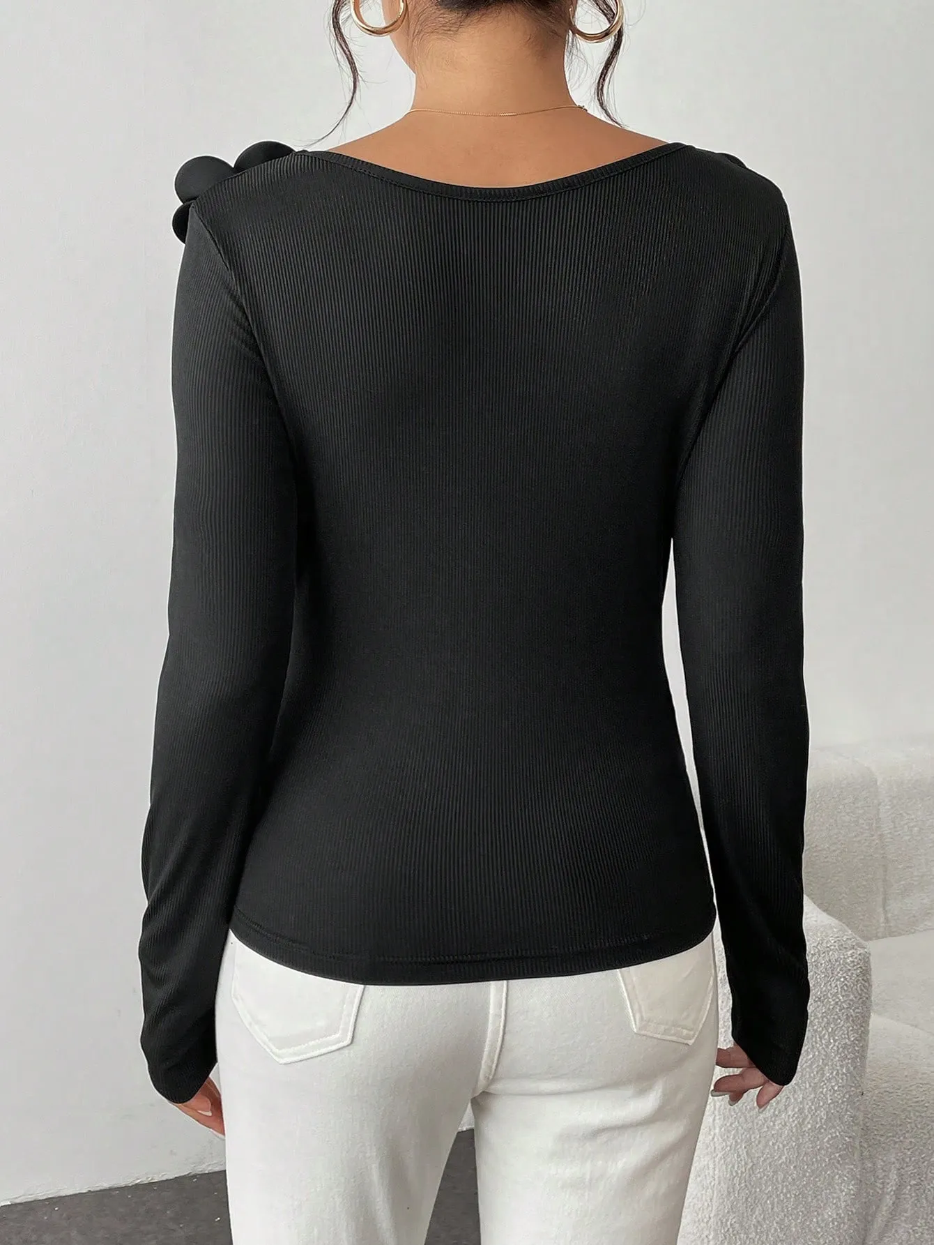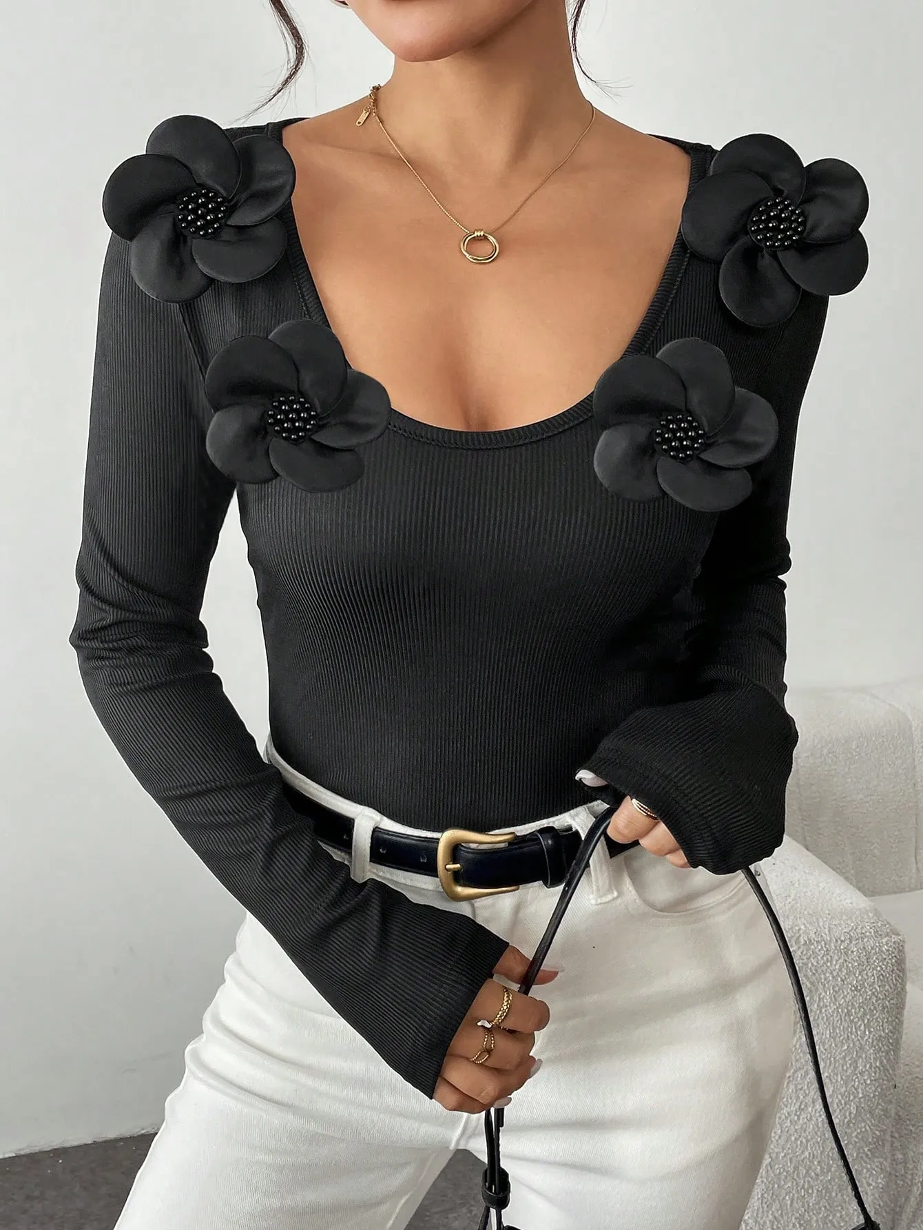 SMY 1pc Women’s Fashionable Elegant Black 3D Floral Knit Ribbed T-Shirt
