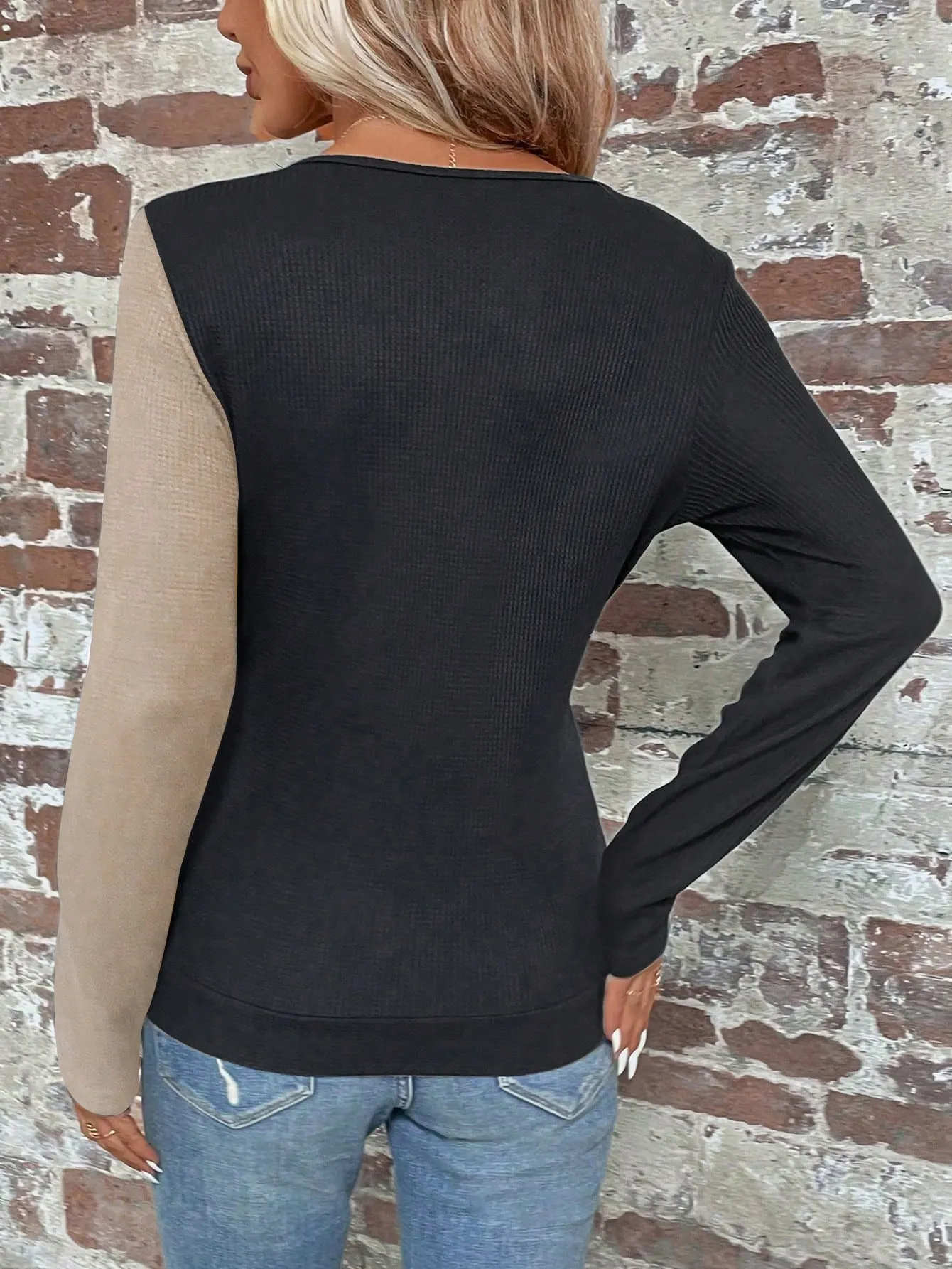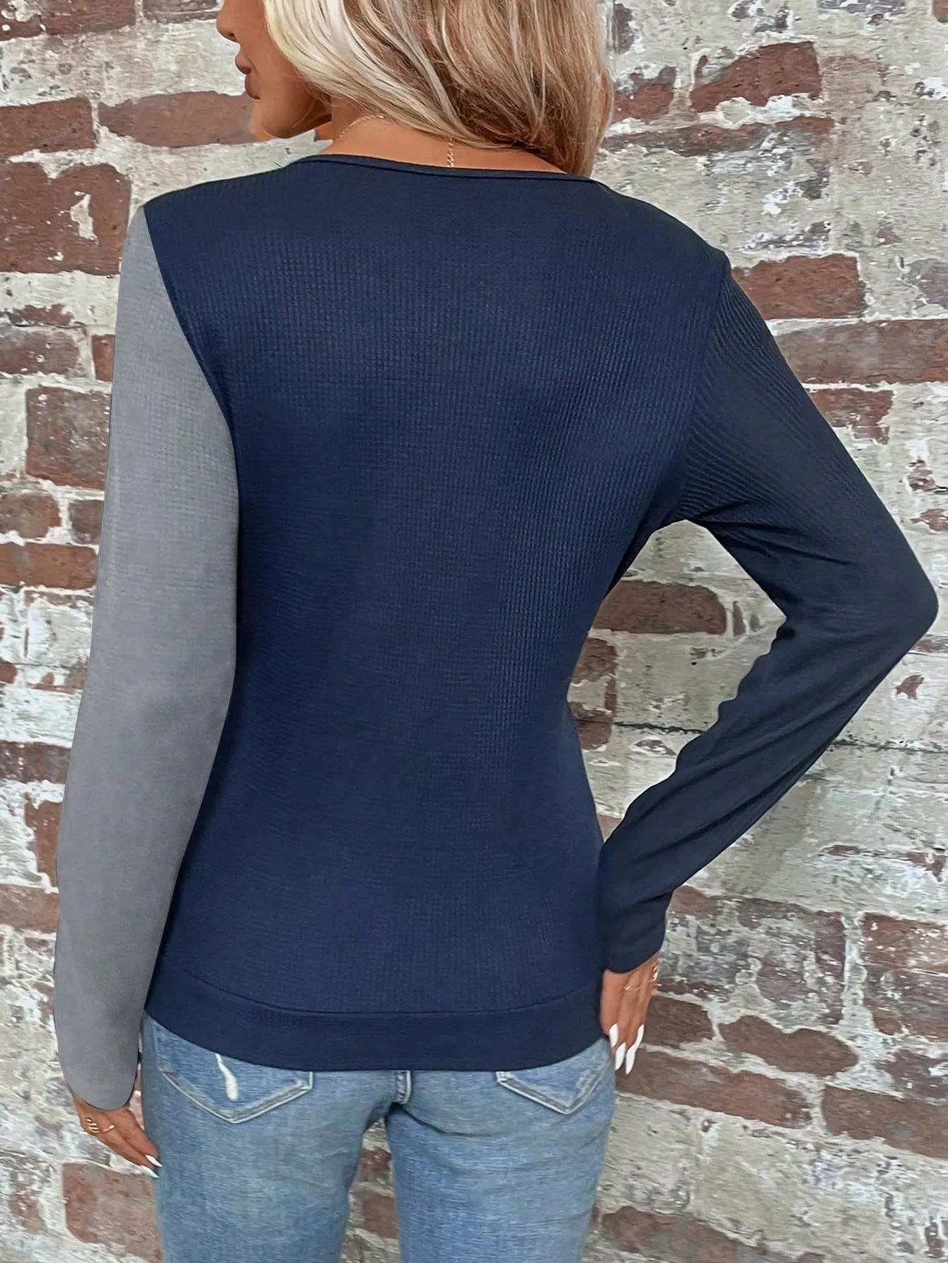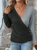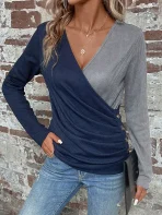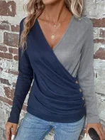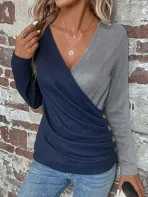SMY Women’s V-neck Button Decoration Patchwork Long Sleeve Casual T-shirt