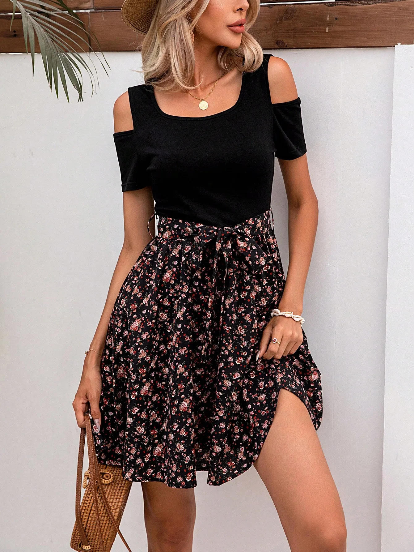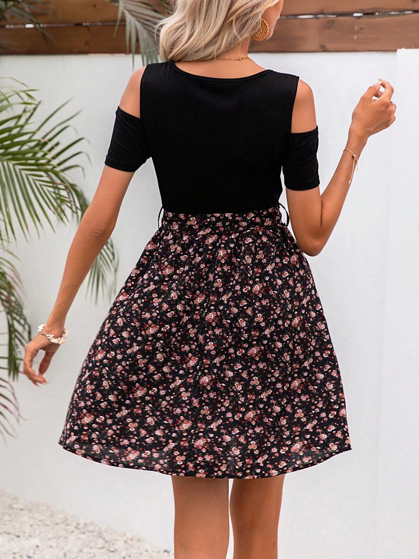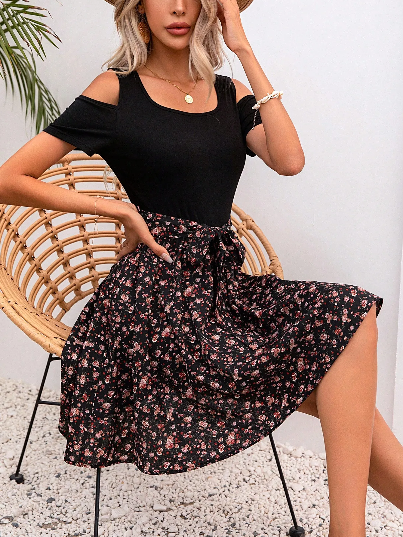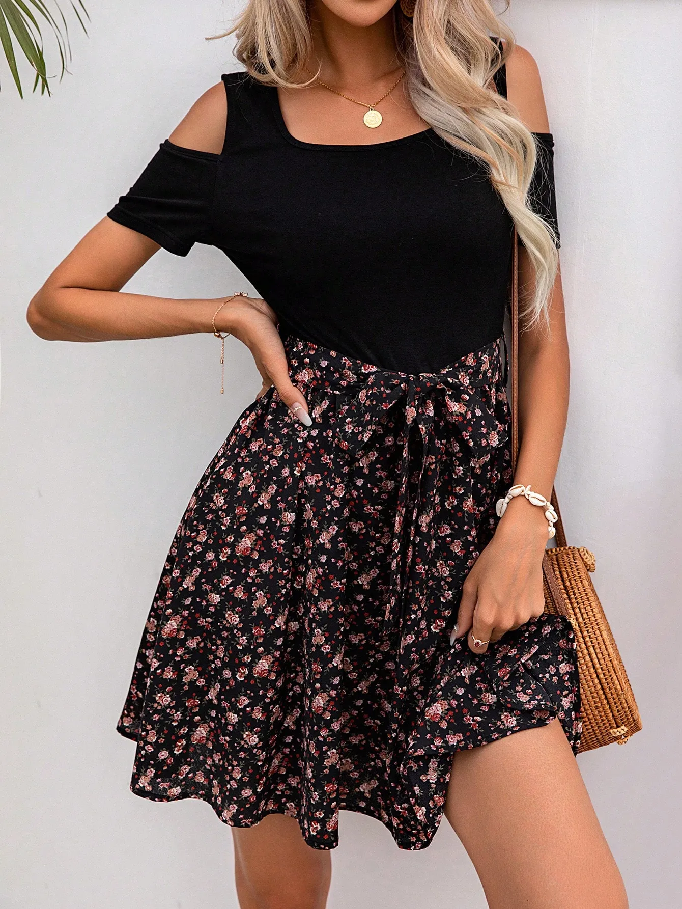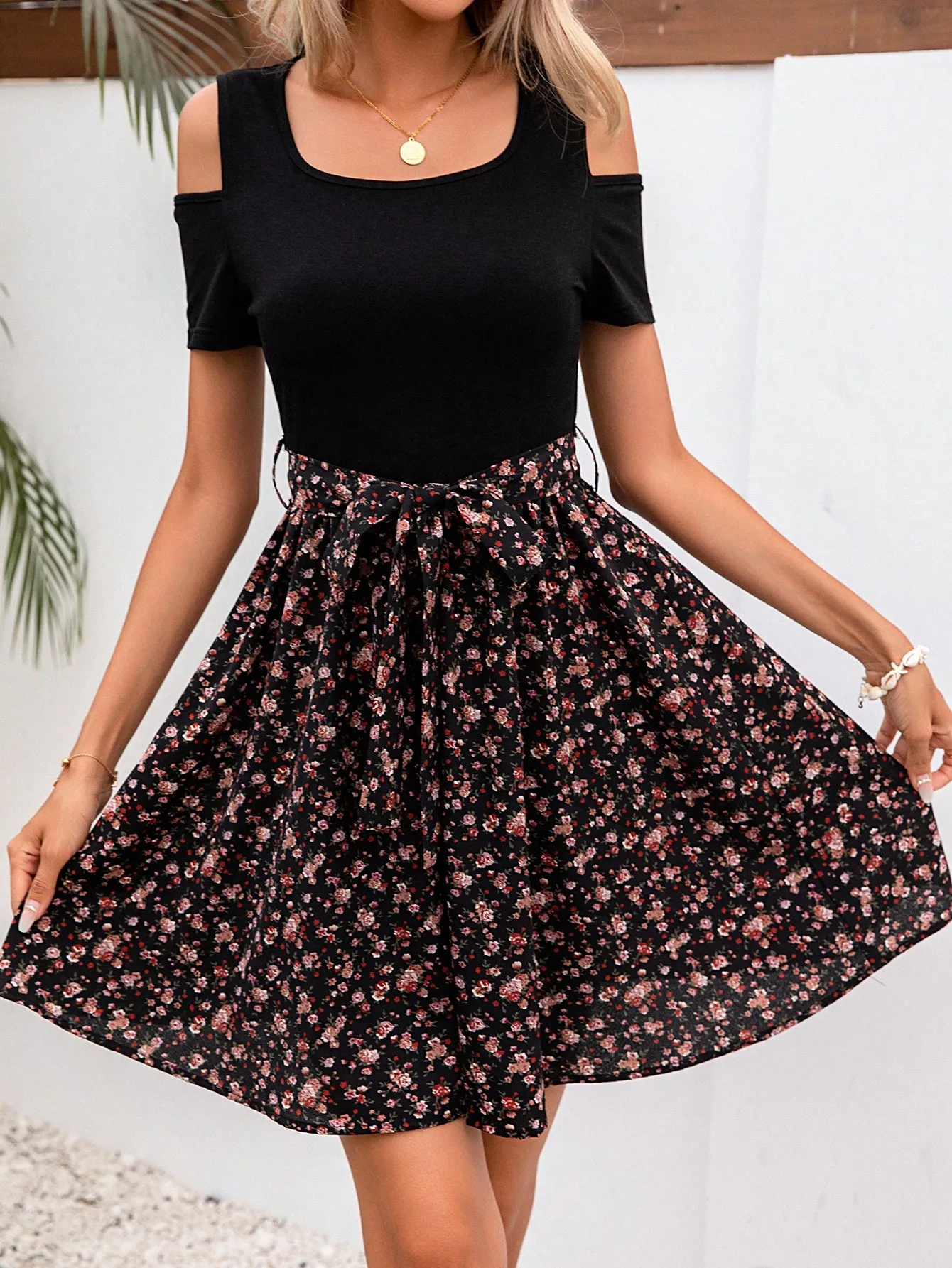 SMY Women’s Patchwork Plant Printed Short Flying Sleeve A-Line Dress