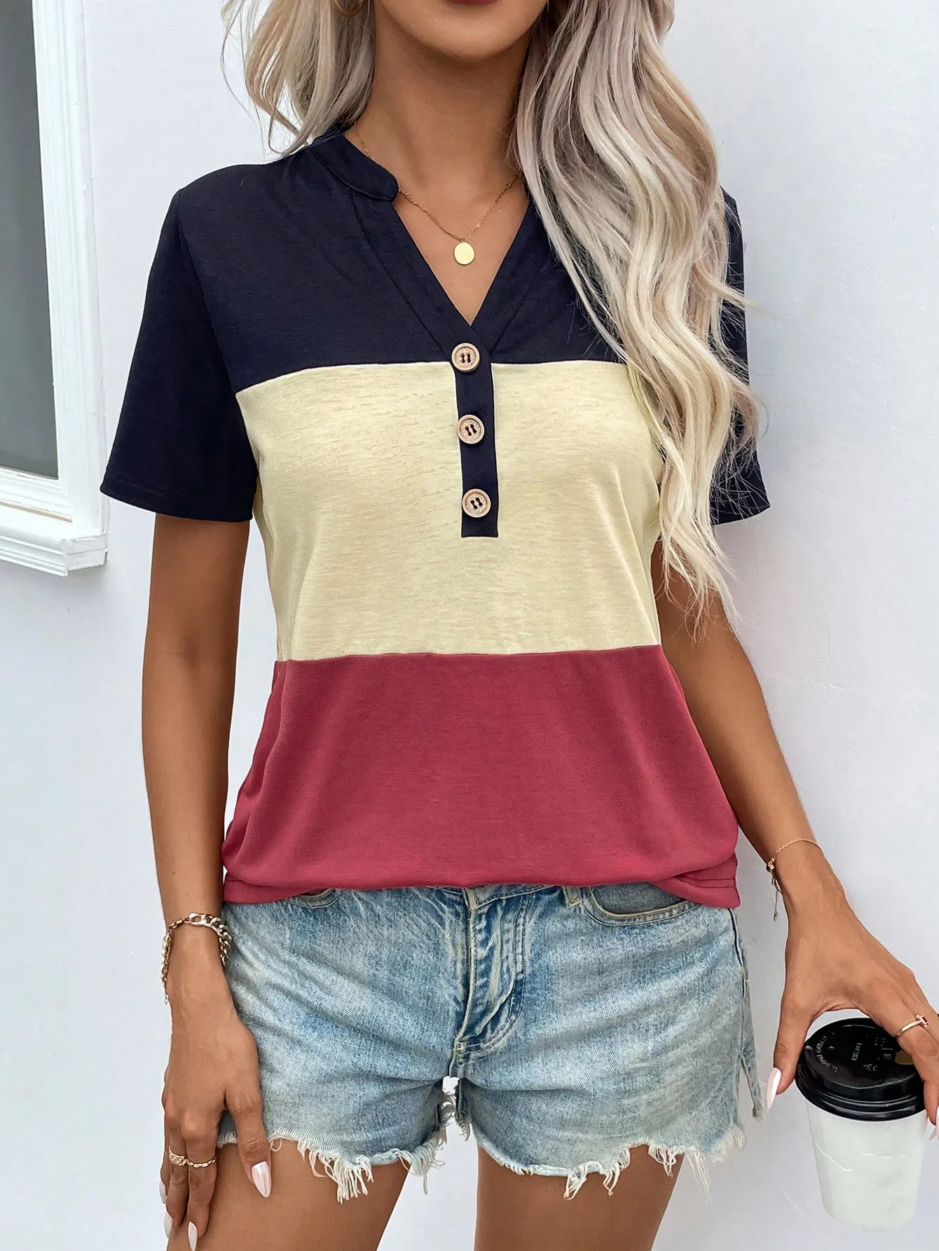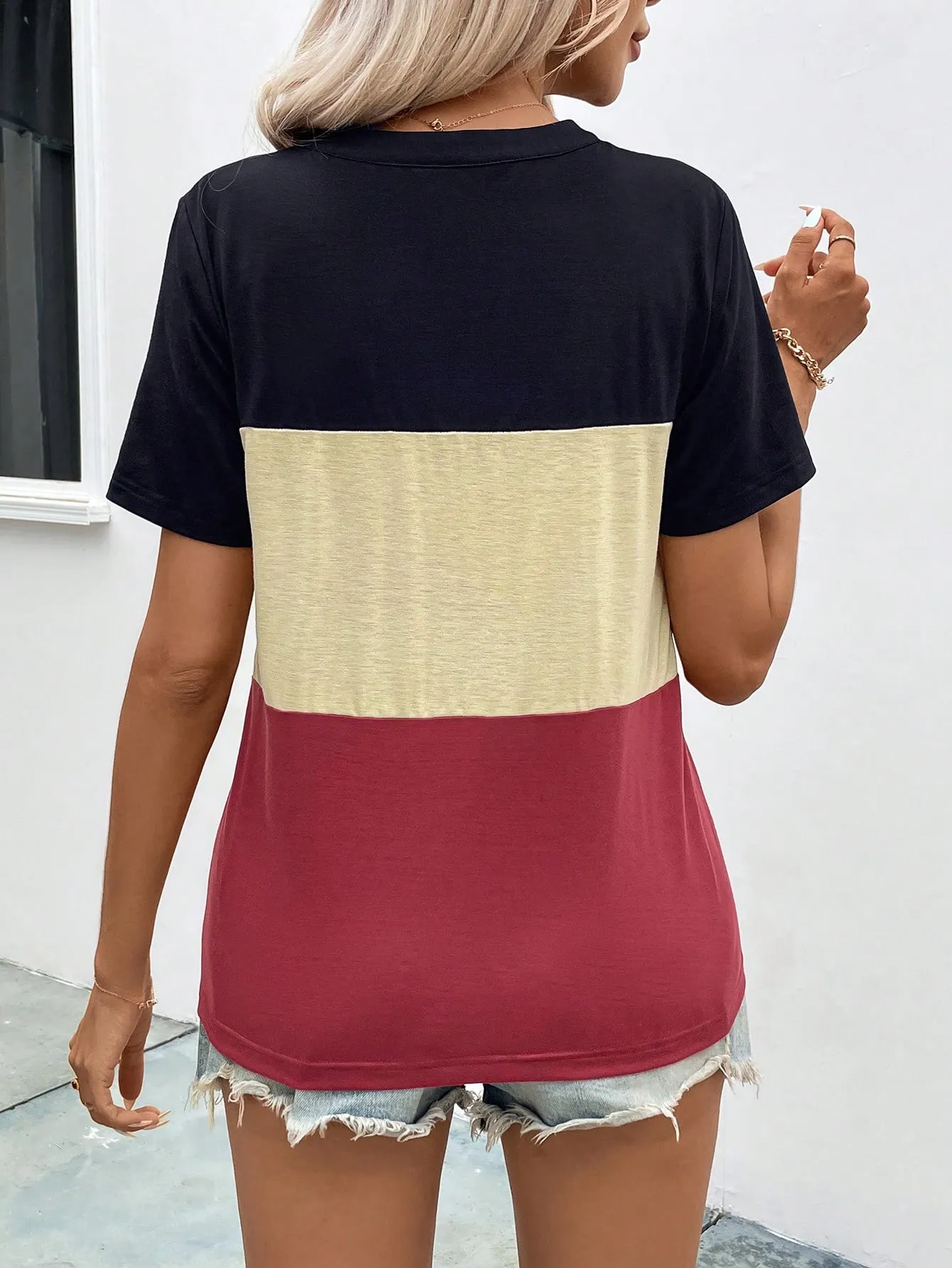 SMY Casual Color Block Trend Gap V-Neck T-Shirt