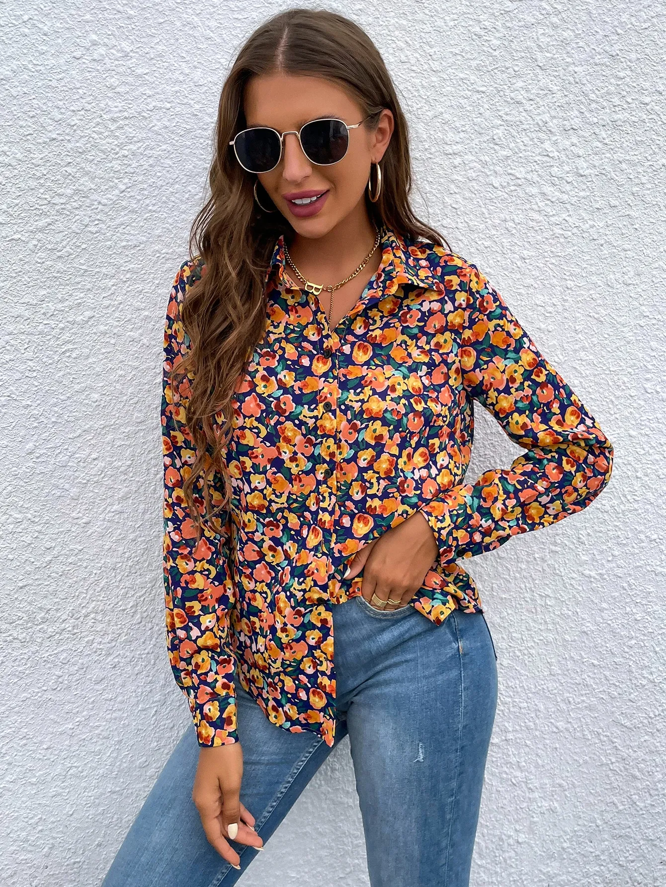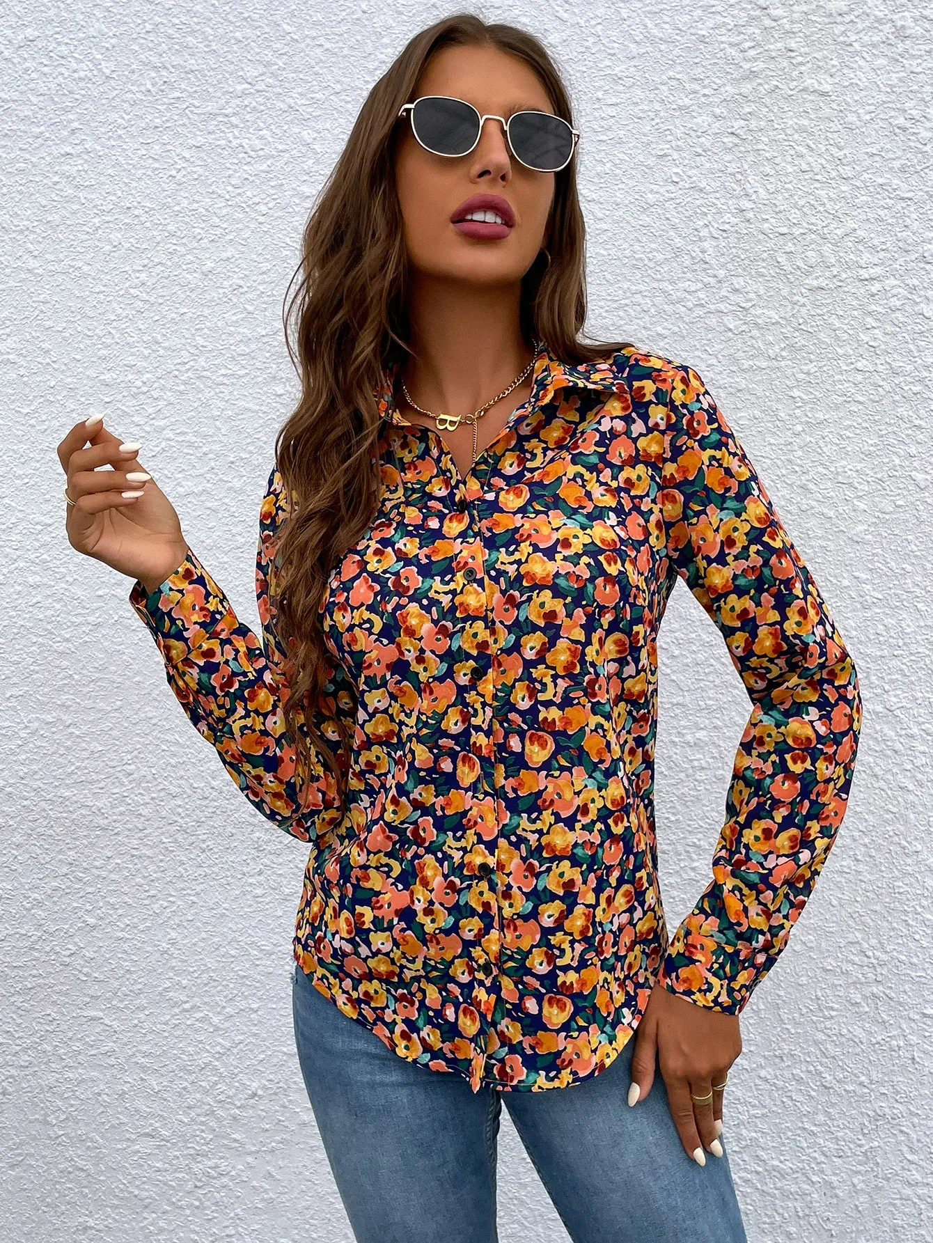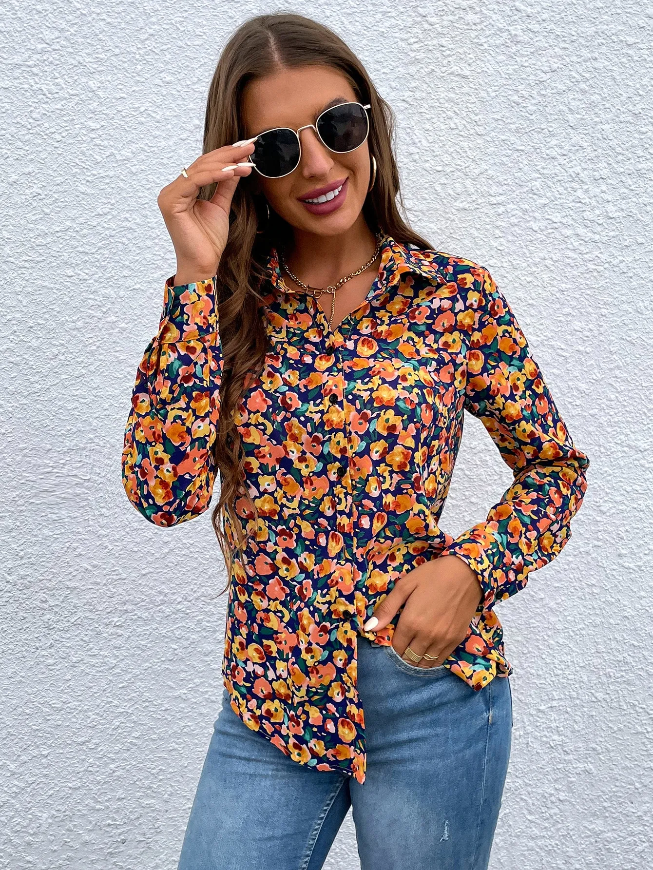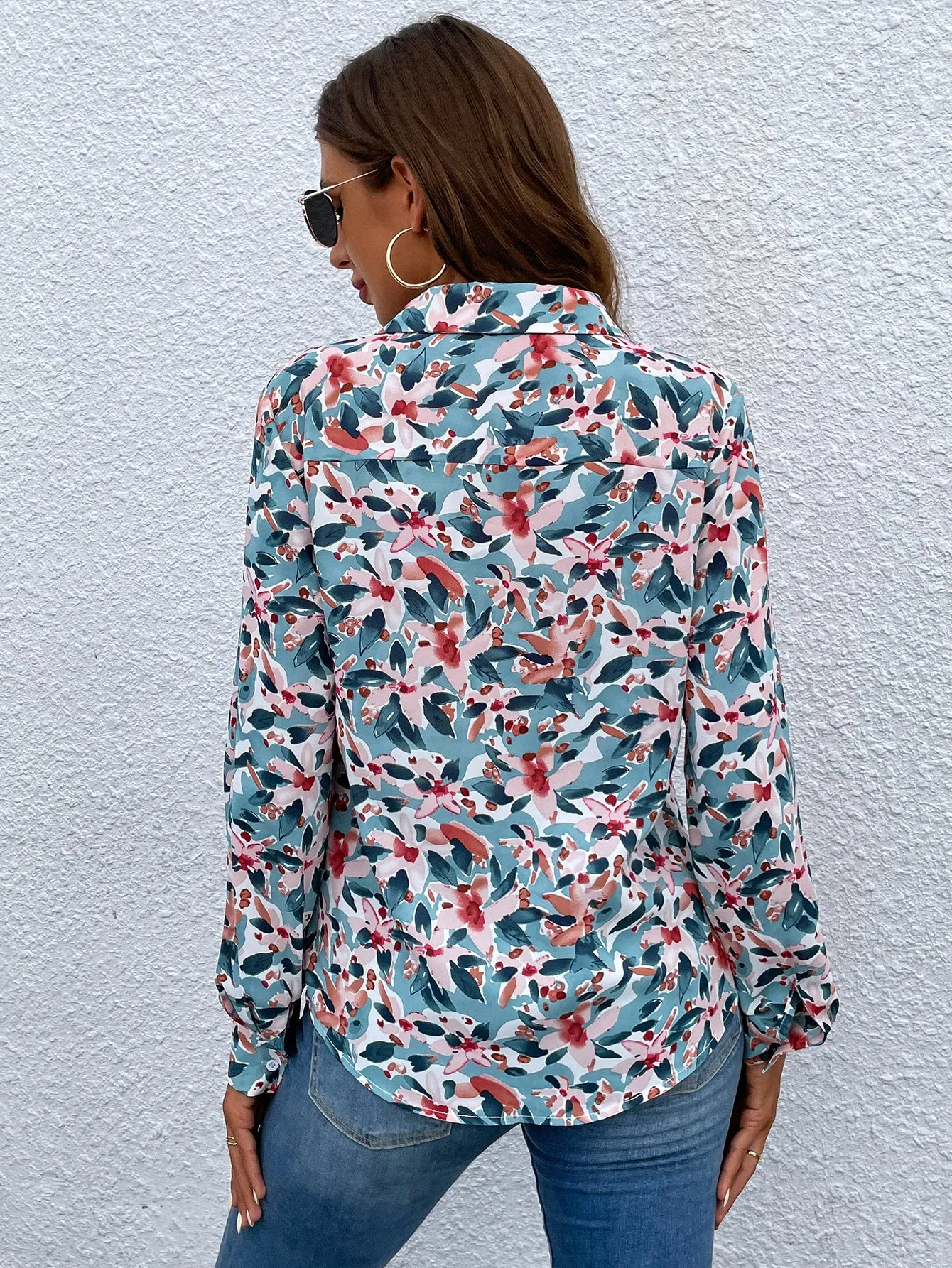 SMY Casual Floral Print Collar Long Sleeved Shirt , Suitable For Work And Casual Wear