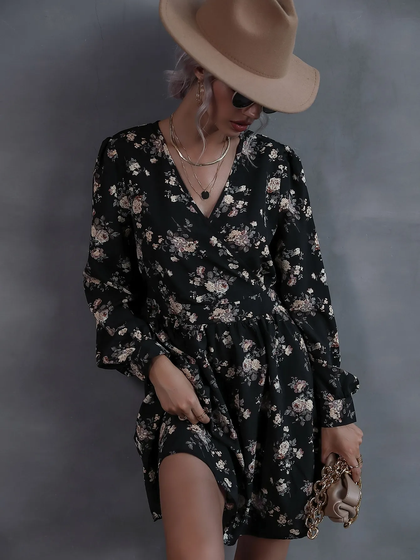 SMY Casual Floral Print V-Neck Long Sleeved Dress