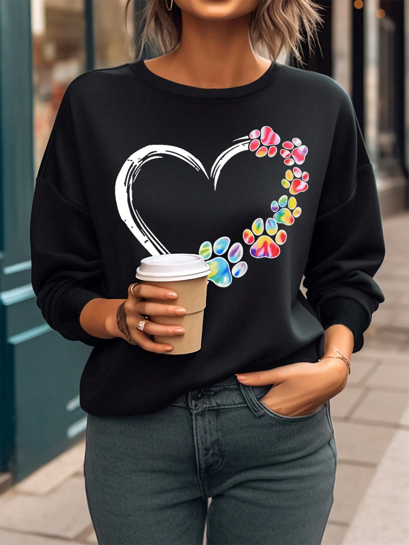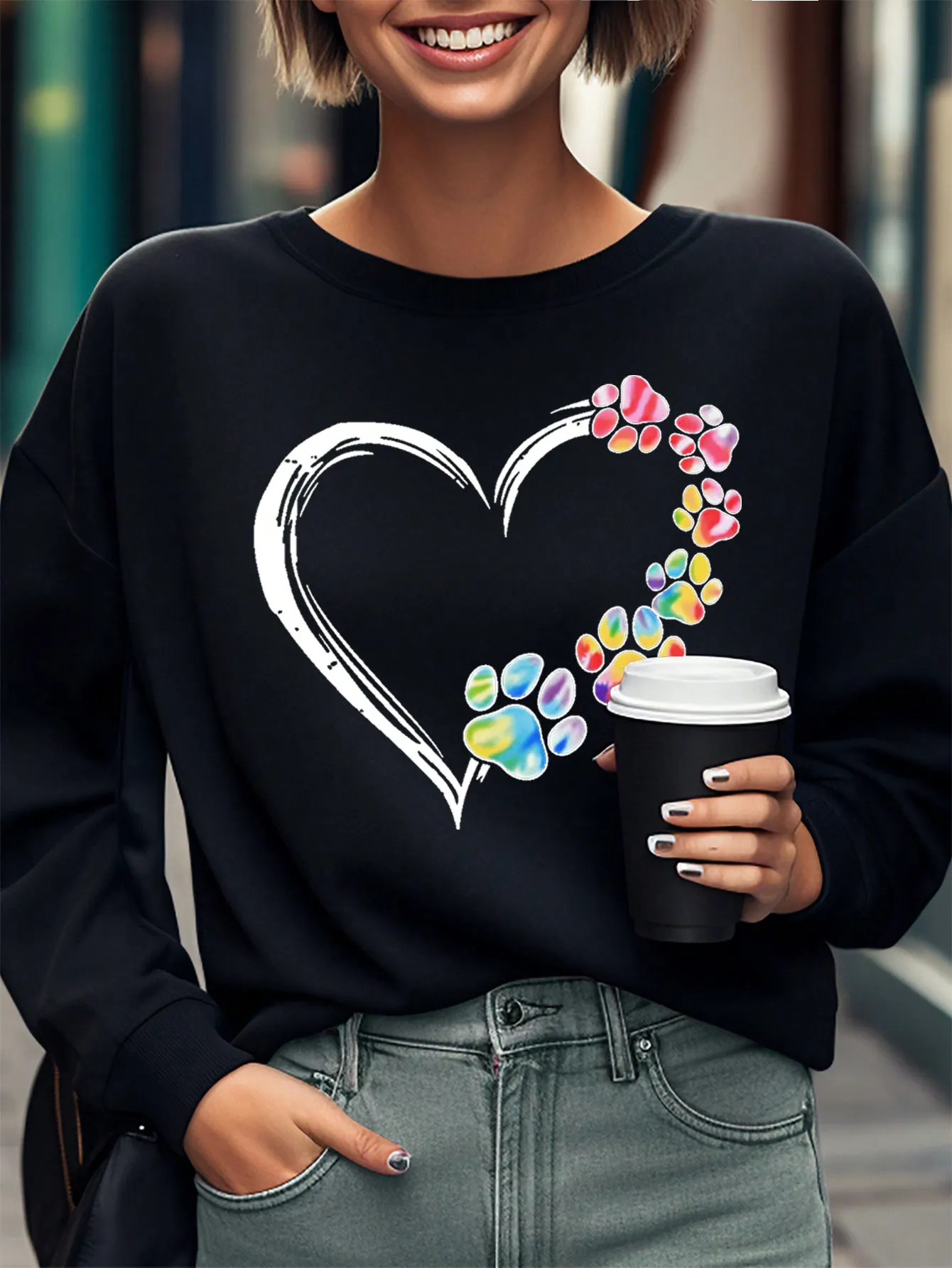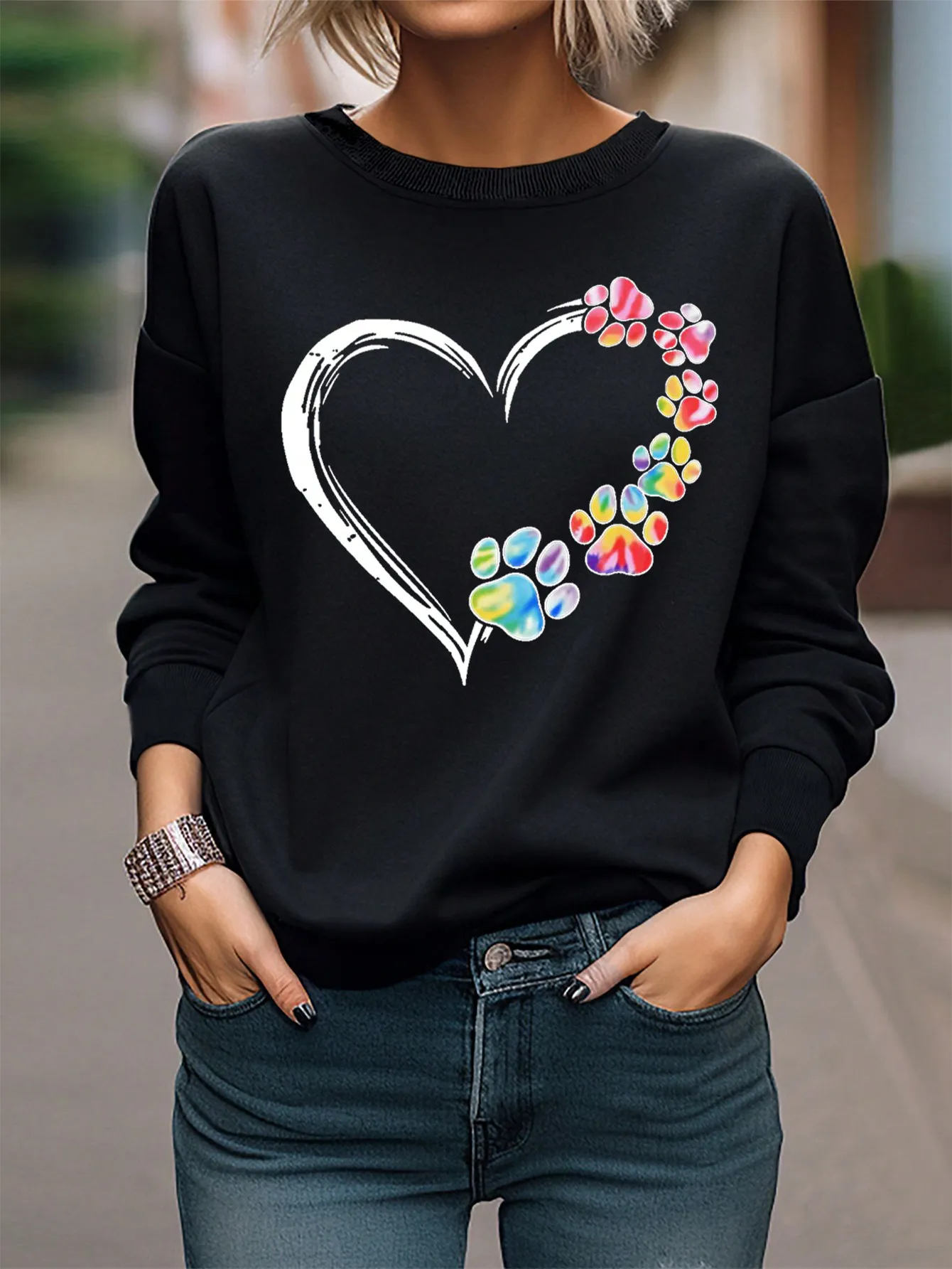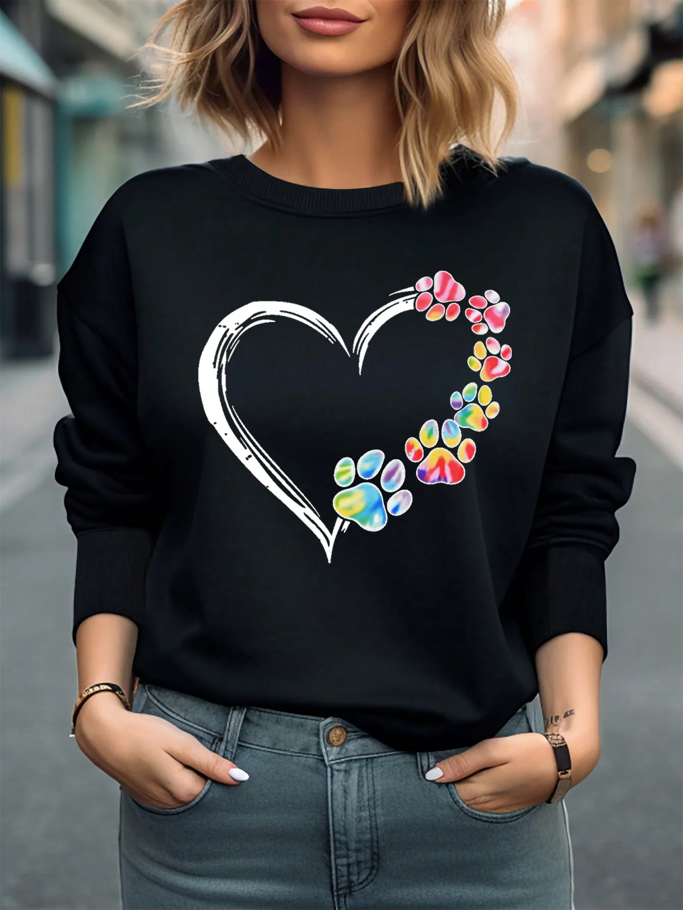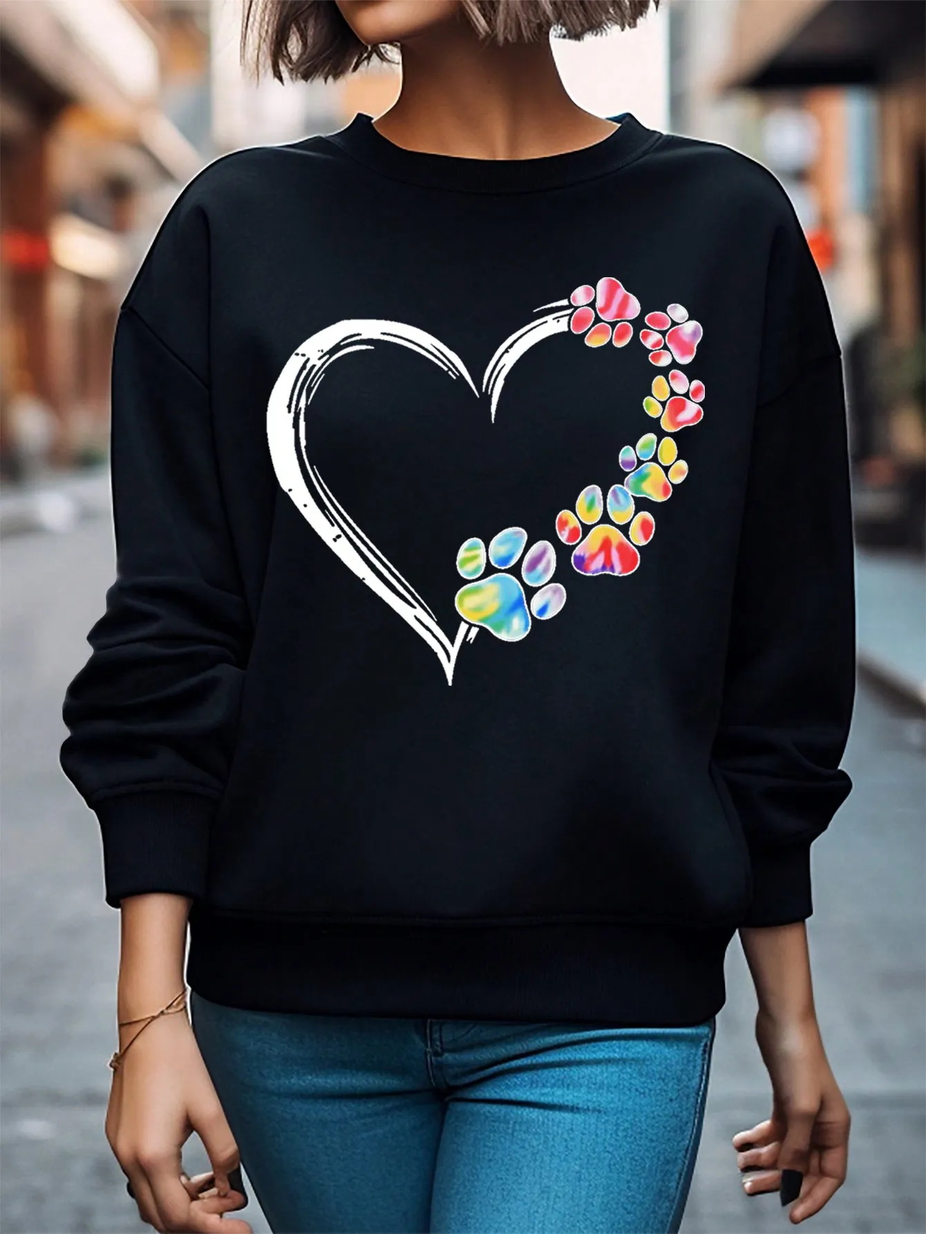 SMY Casual Heart And Bear Paw Printed Small Round Neck Long Sleeved Sweatshirt