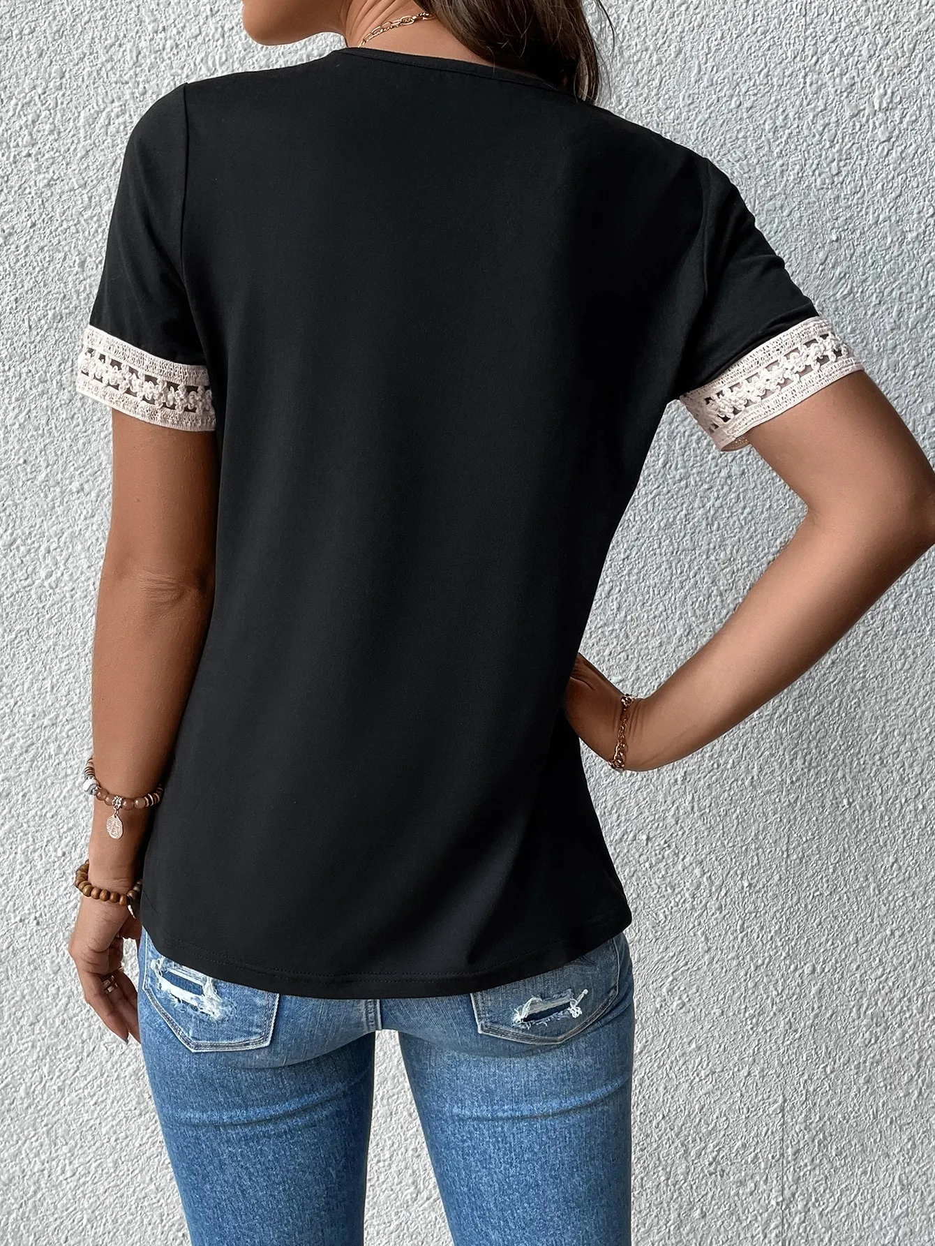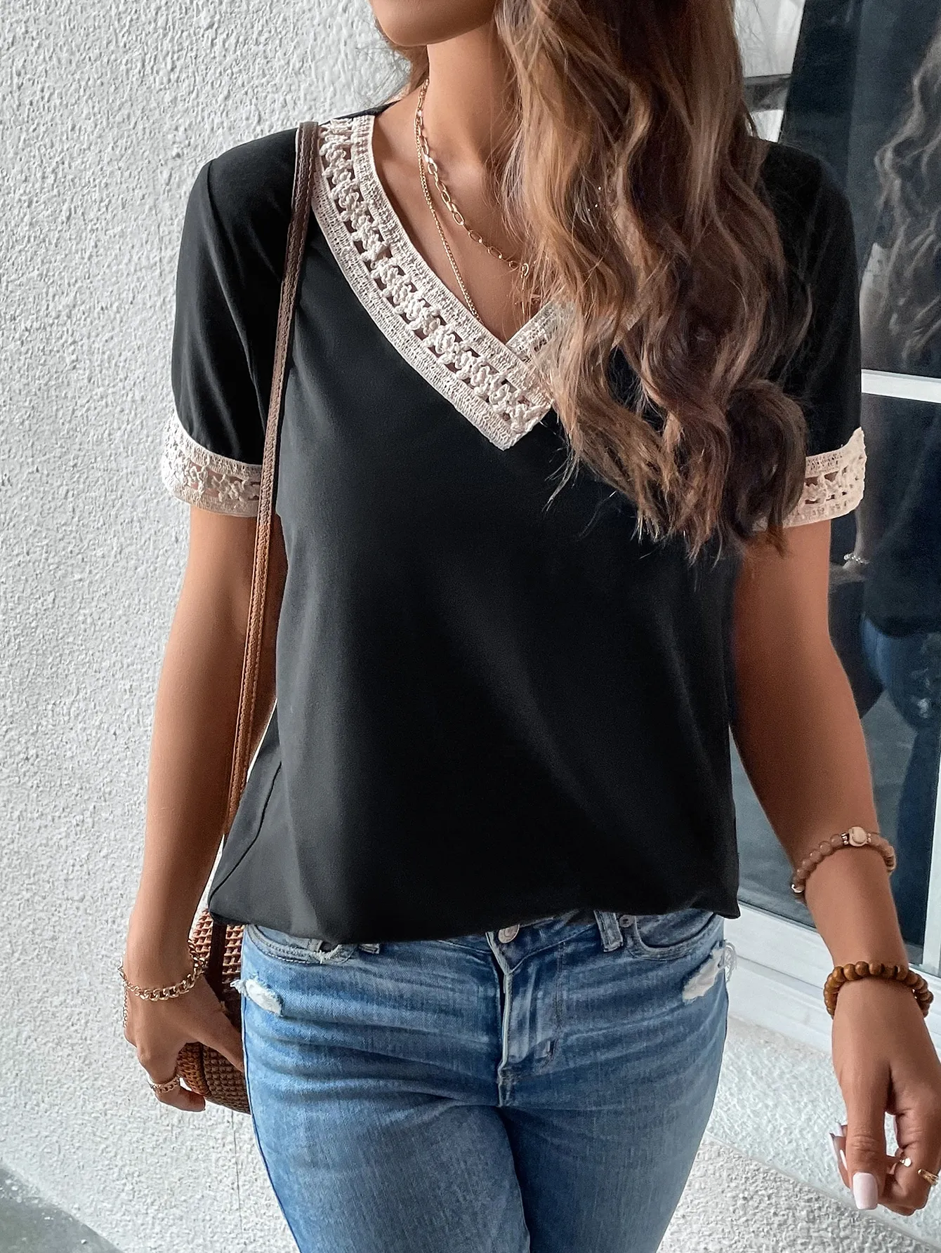 SMY Casual Lace Stitching Trend Small V-Neck T-Shirt