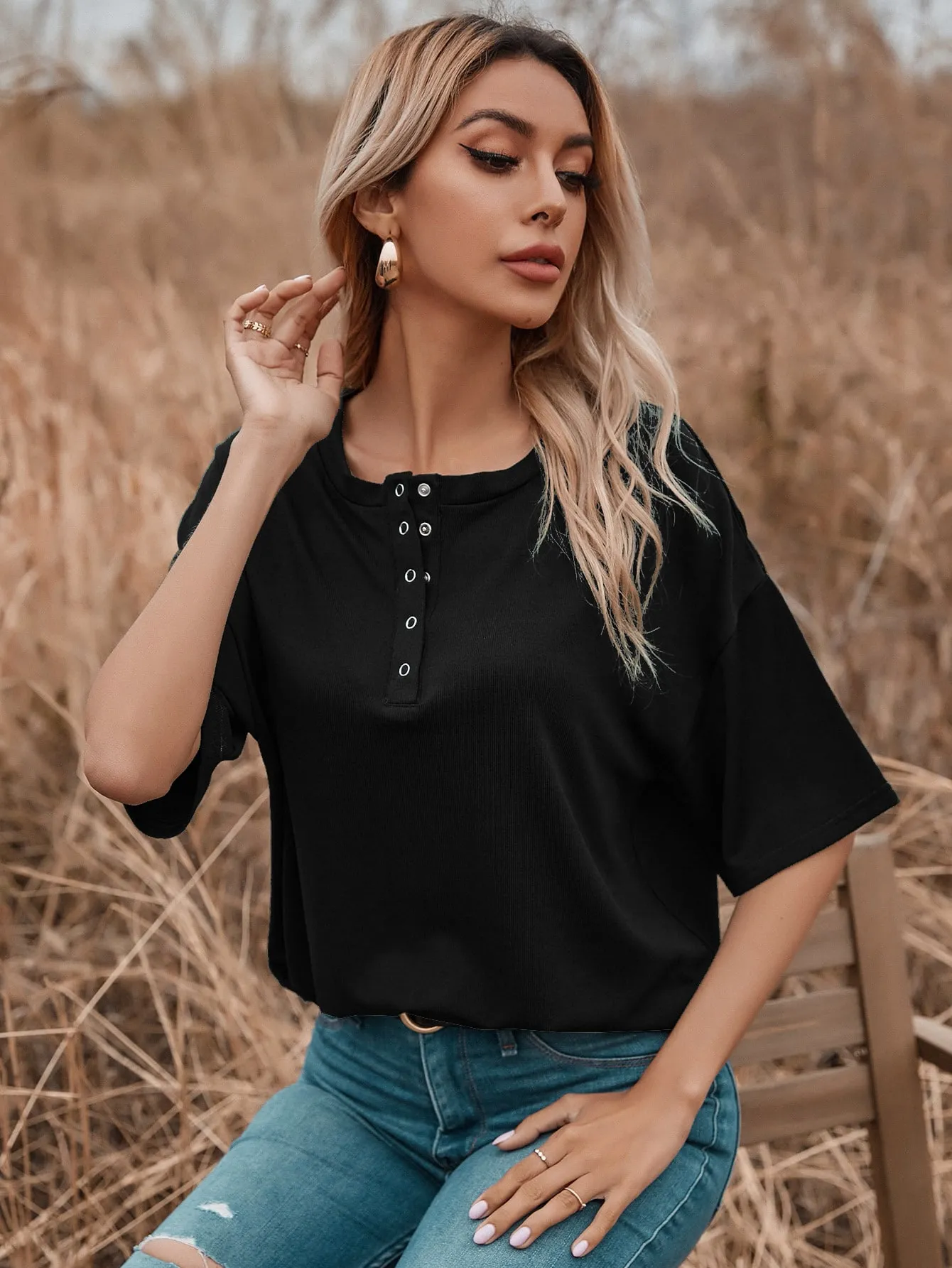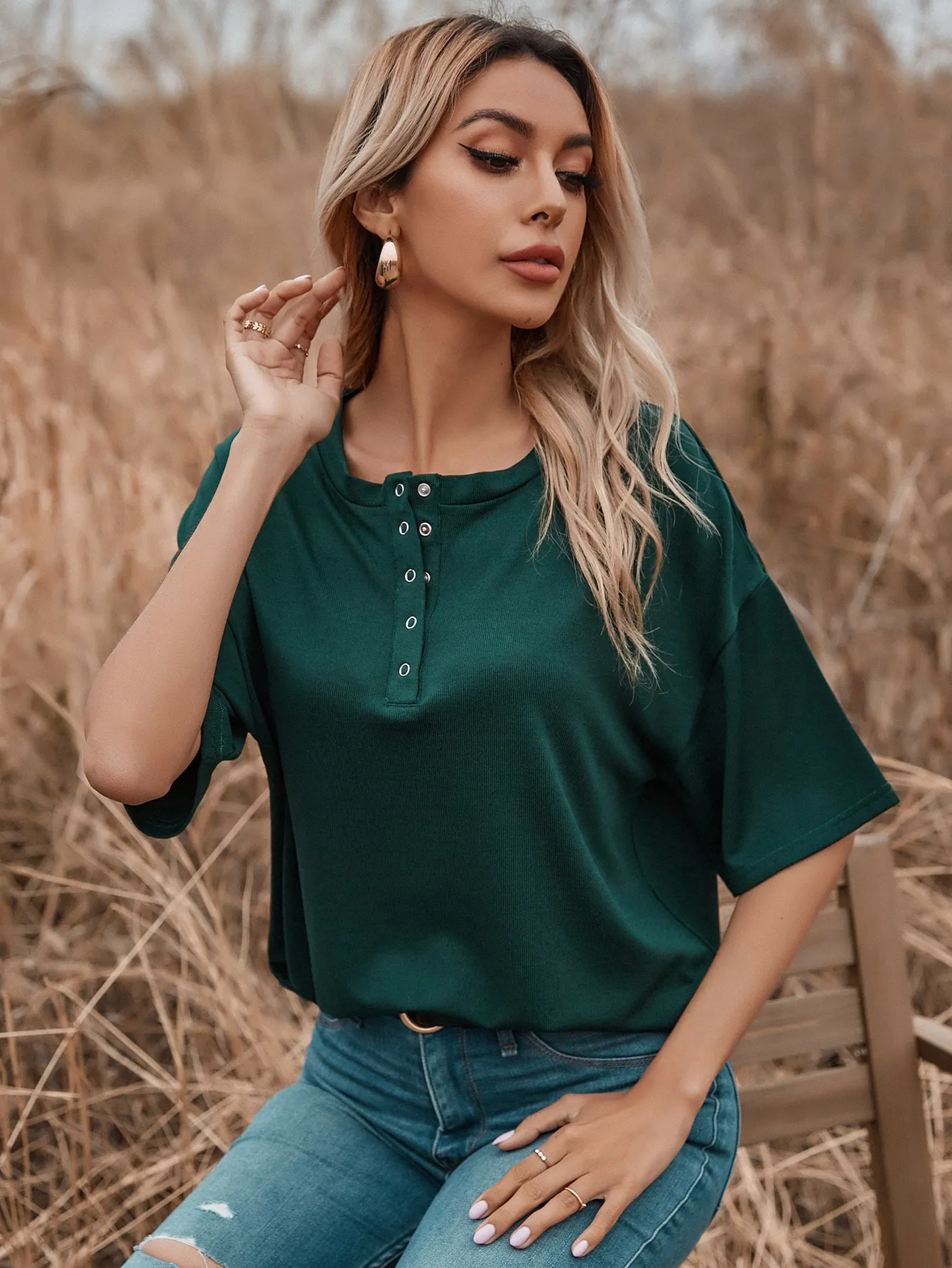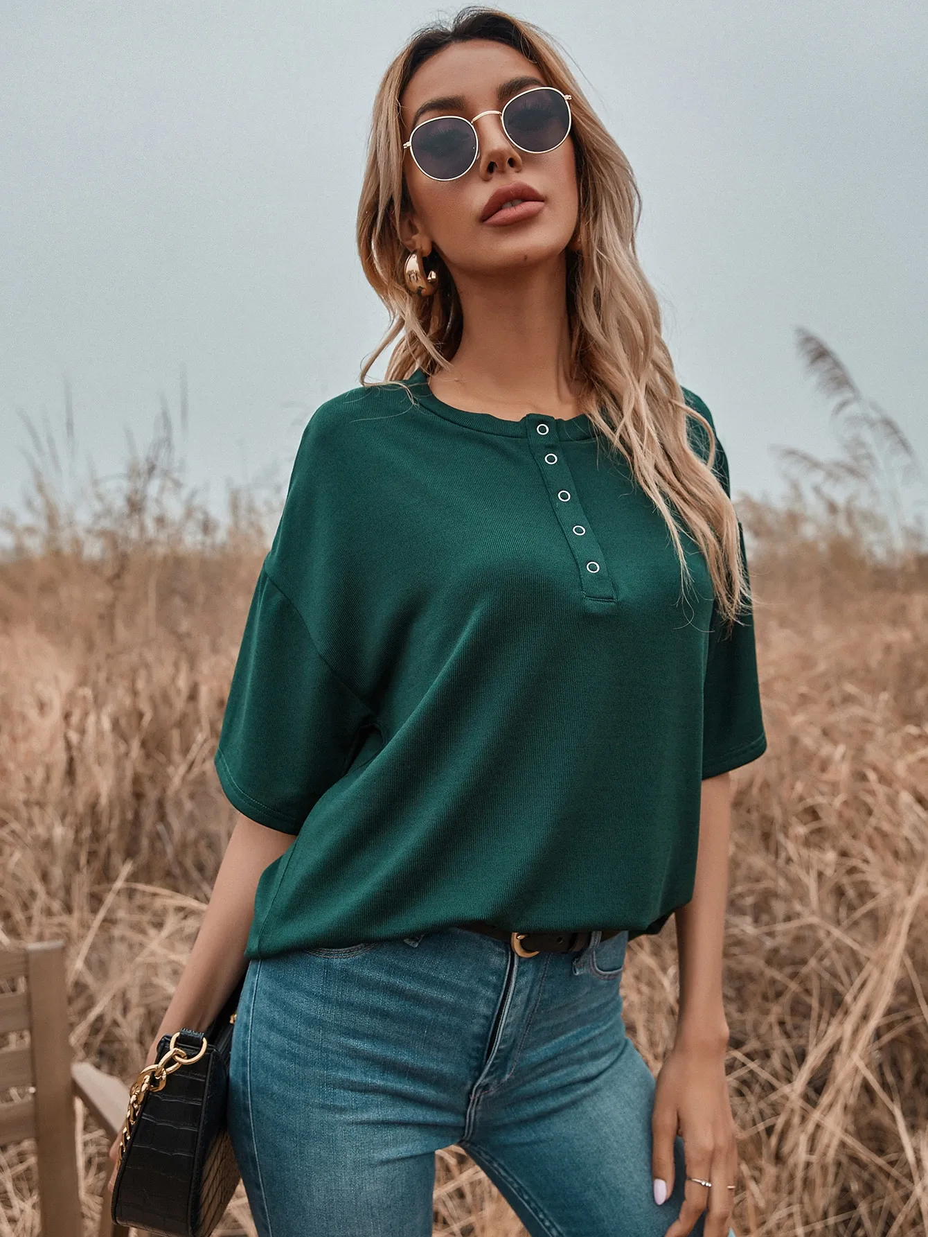 SMY Half Button Kangaroo Pocket Drop Shoulder Drawstring Hoodie