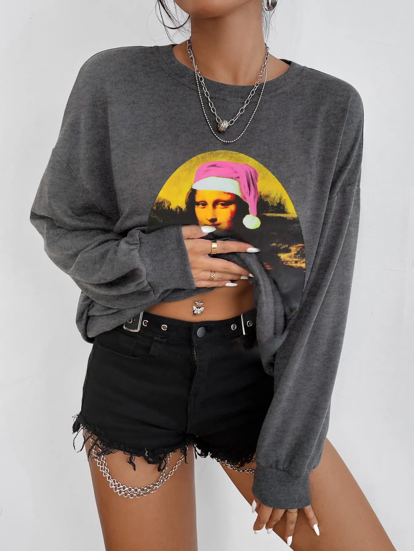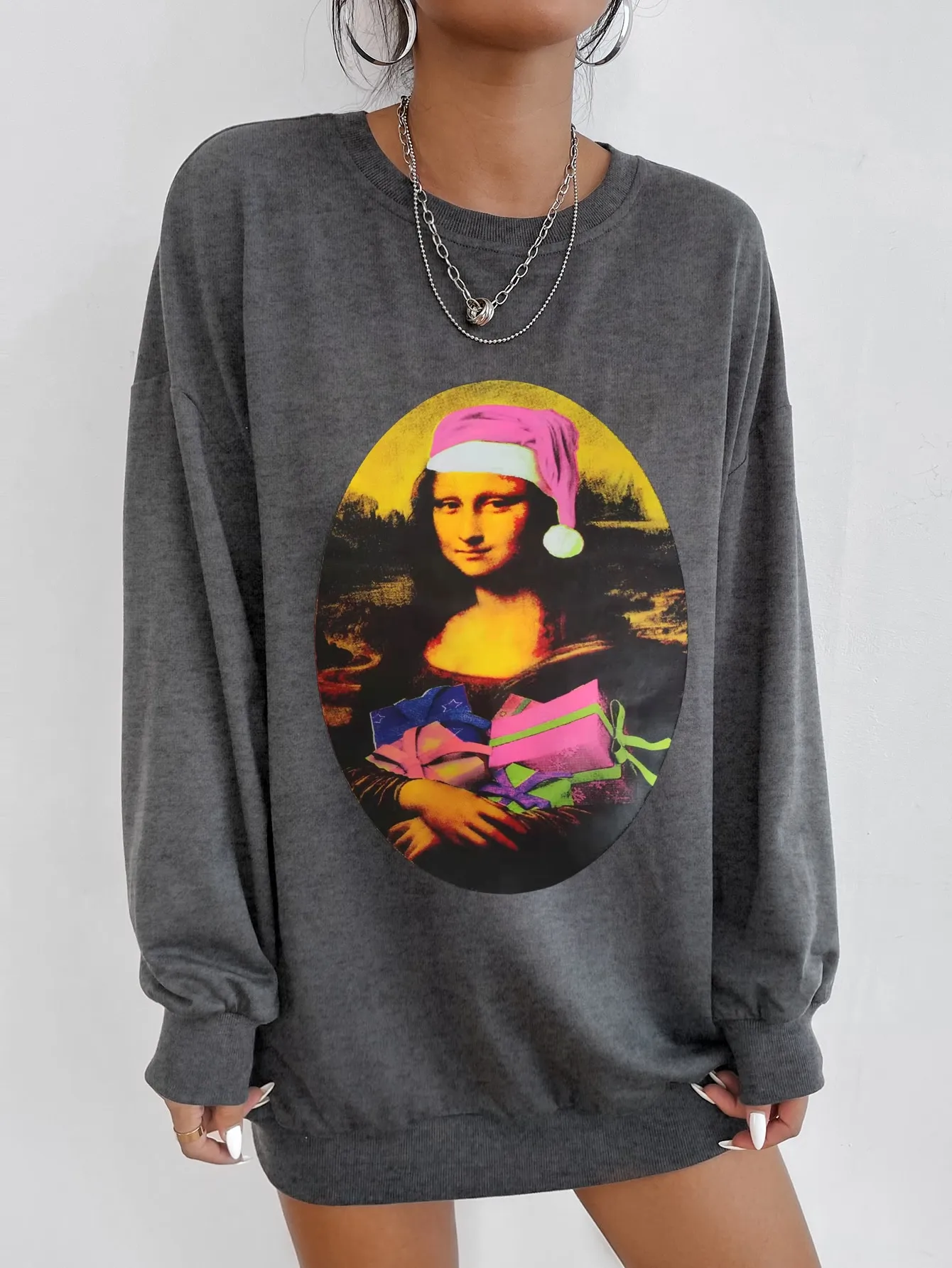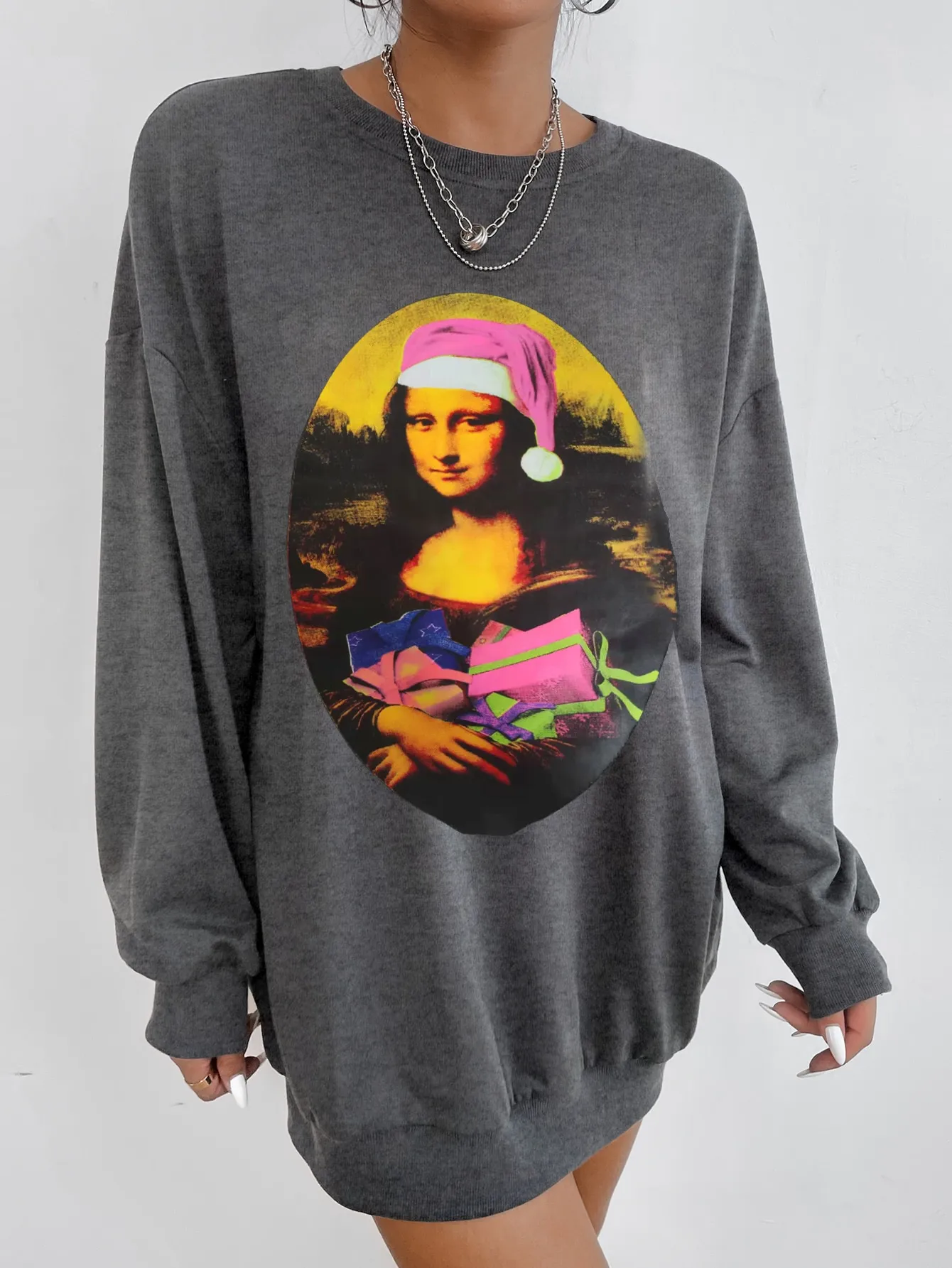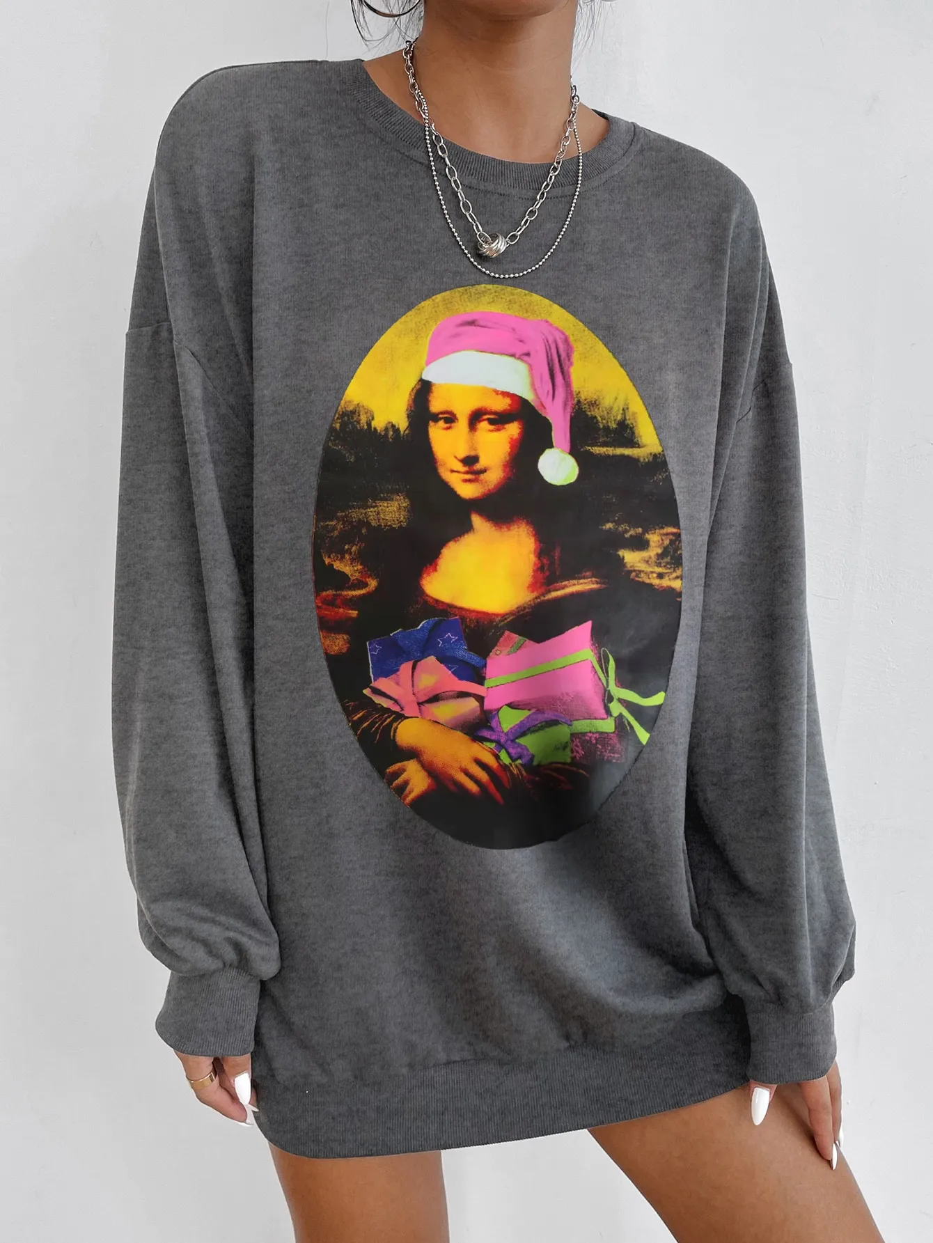 SMY Casual Mona Lisa Pattern Round Neck Long Christmas Hoodie