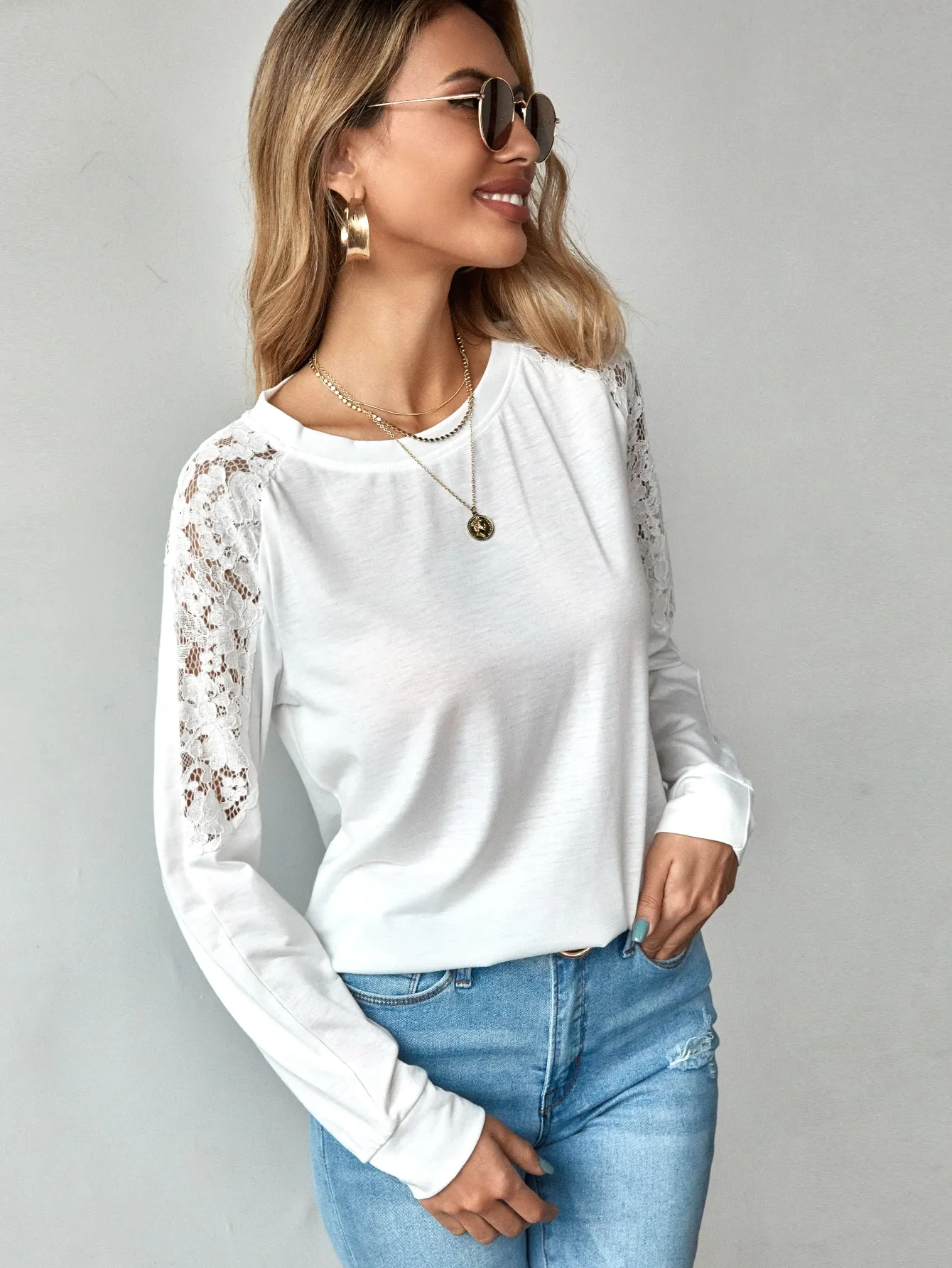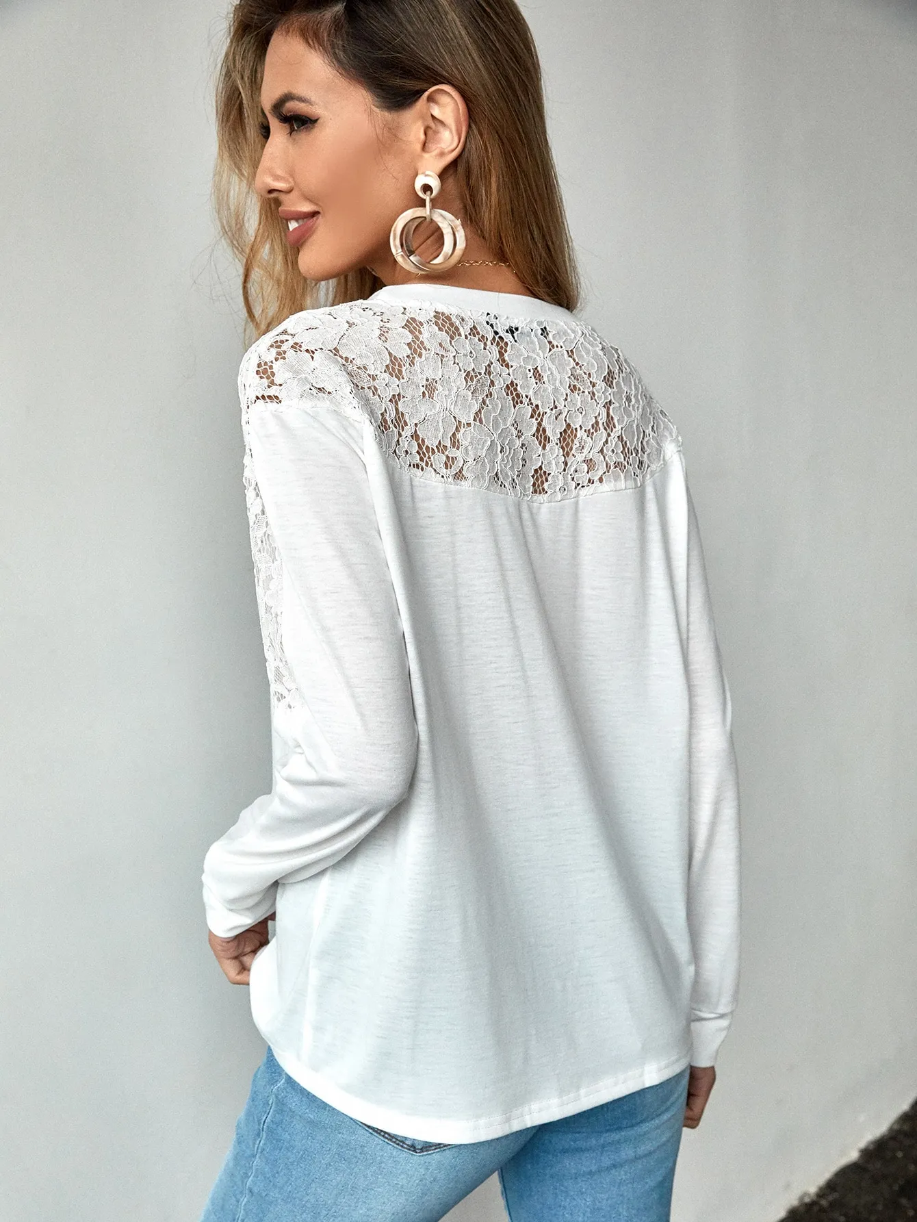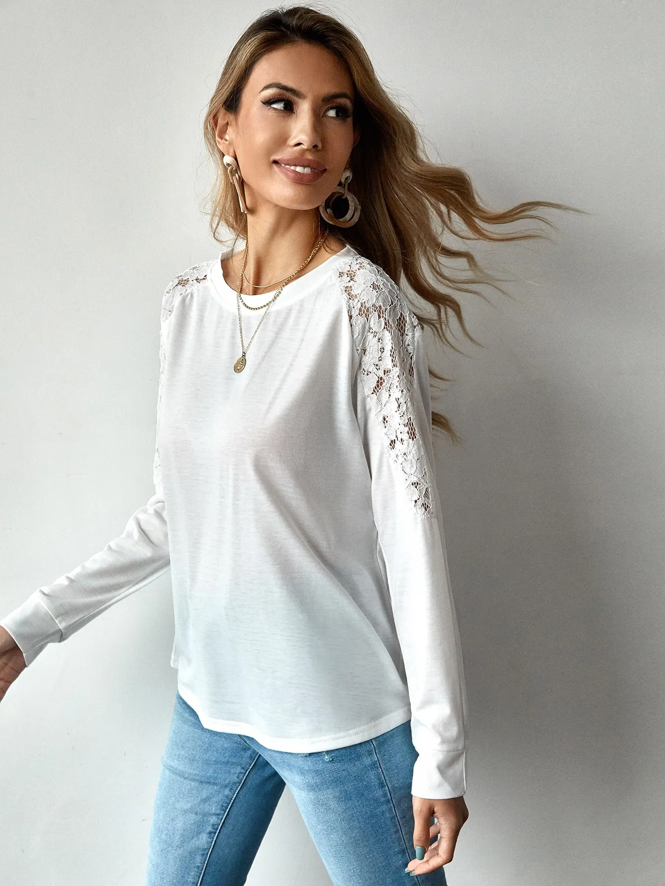 SMY Women’s Solid Color Contrast Lace Round Neck Short Sleeve Casual T-Shirt, Summer