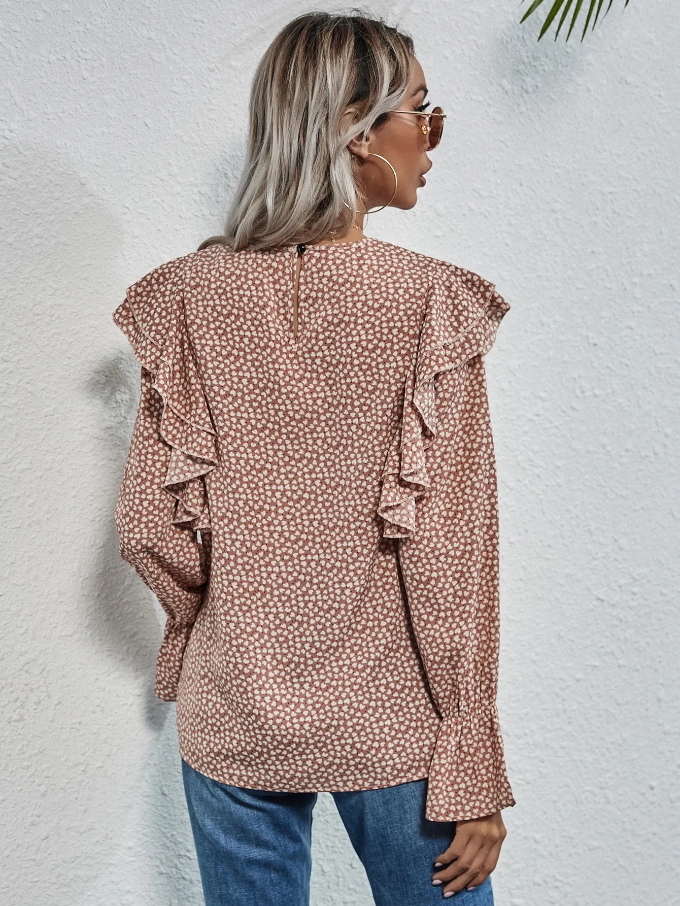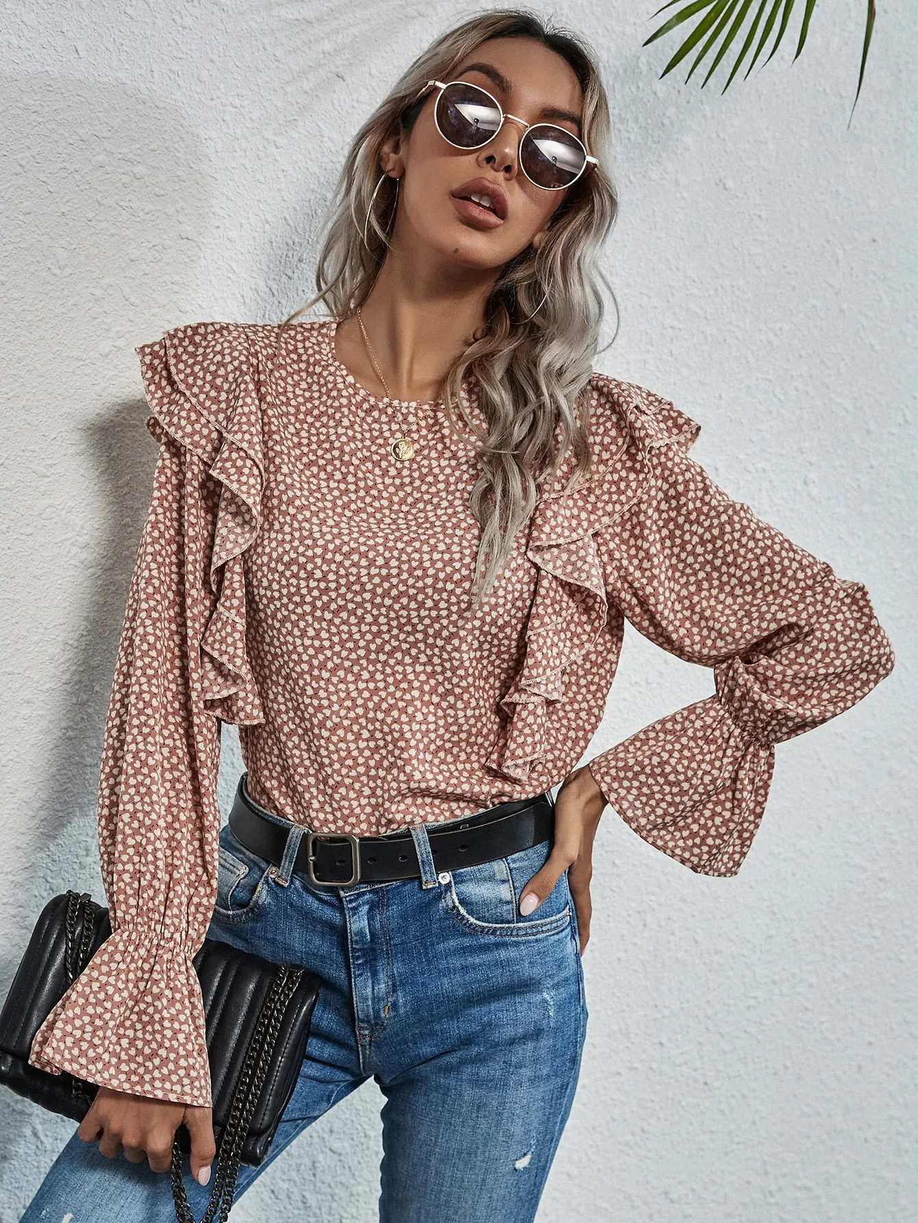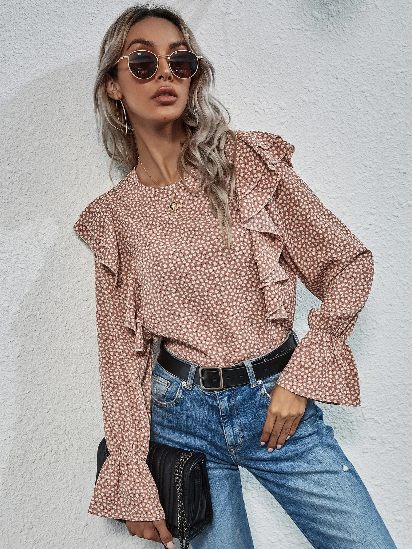 SMY Casual Round Neck Long Sleeved Ruffle Sleeves Shirt