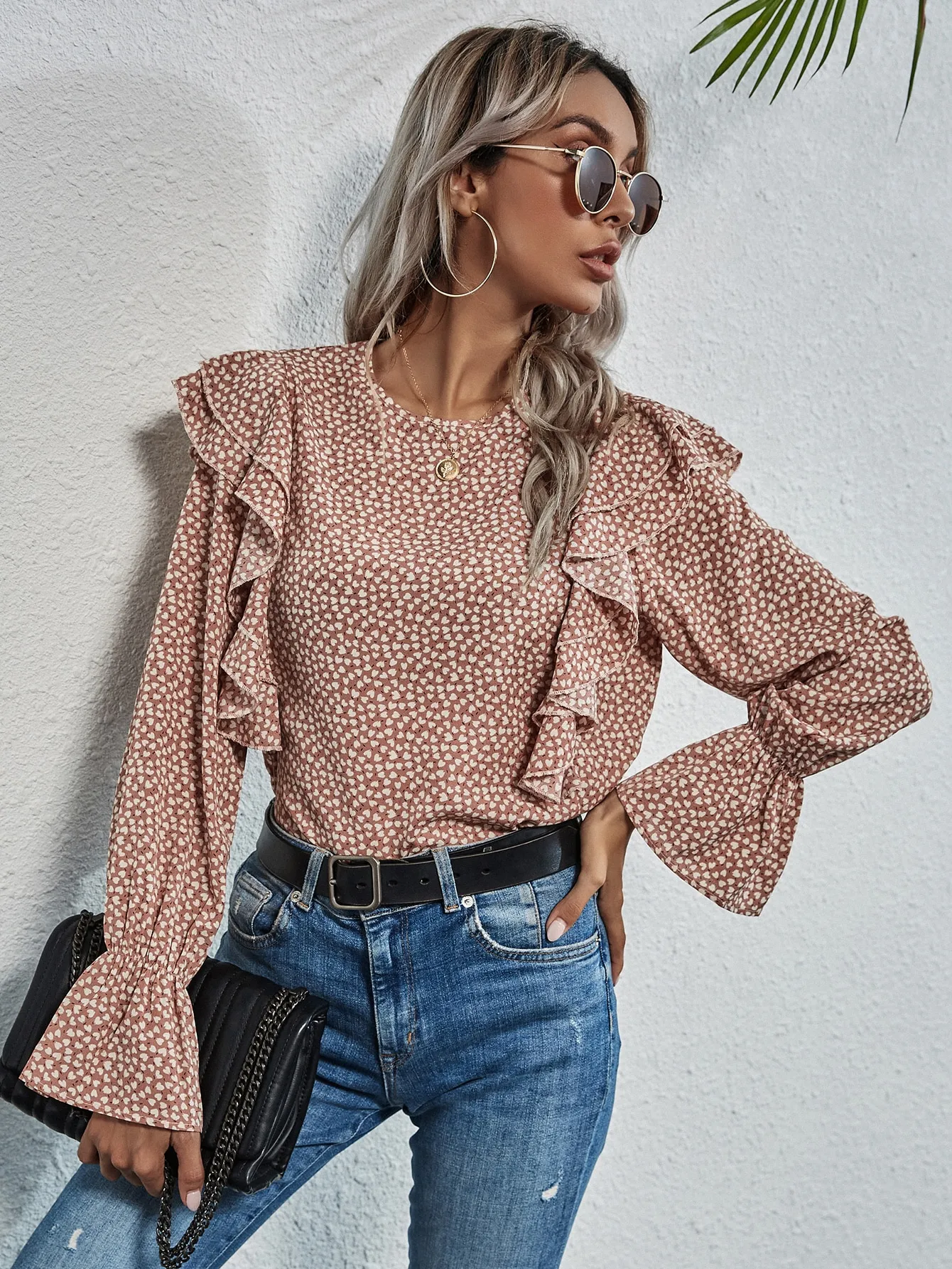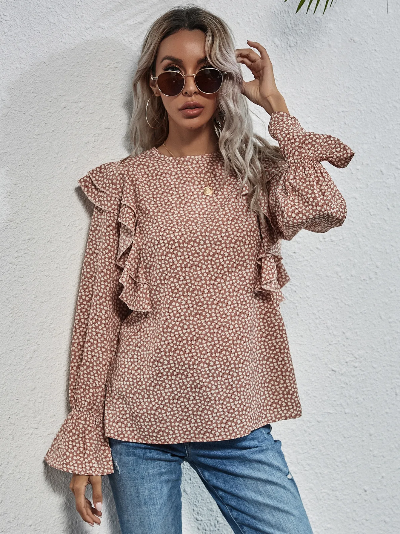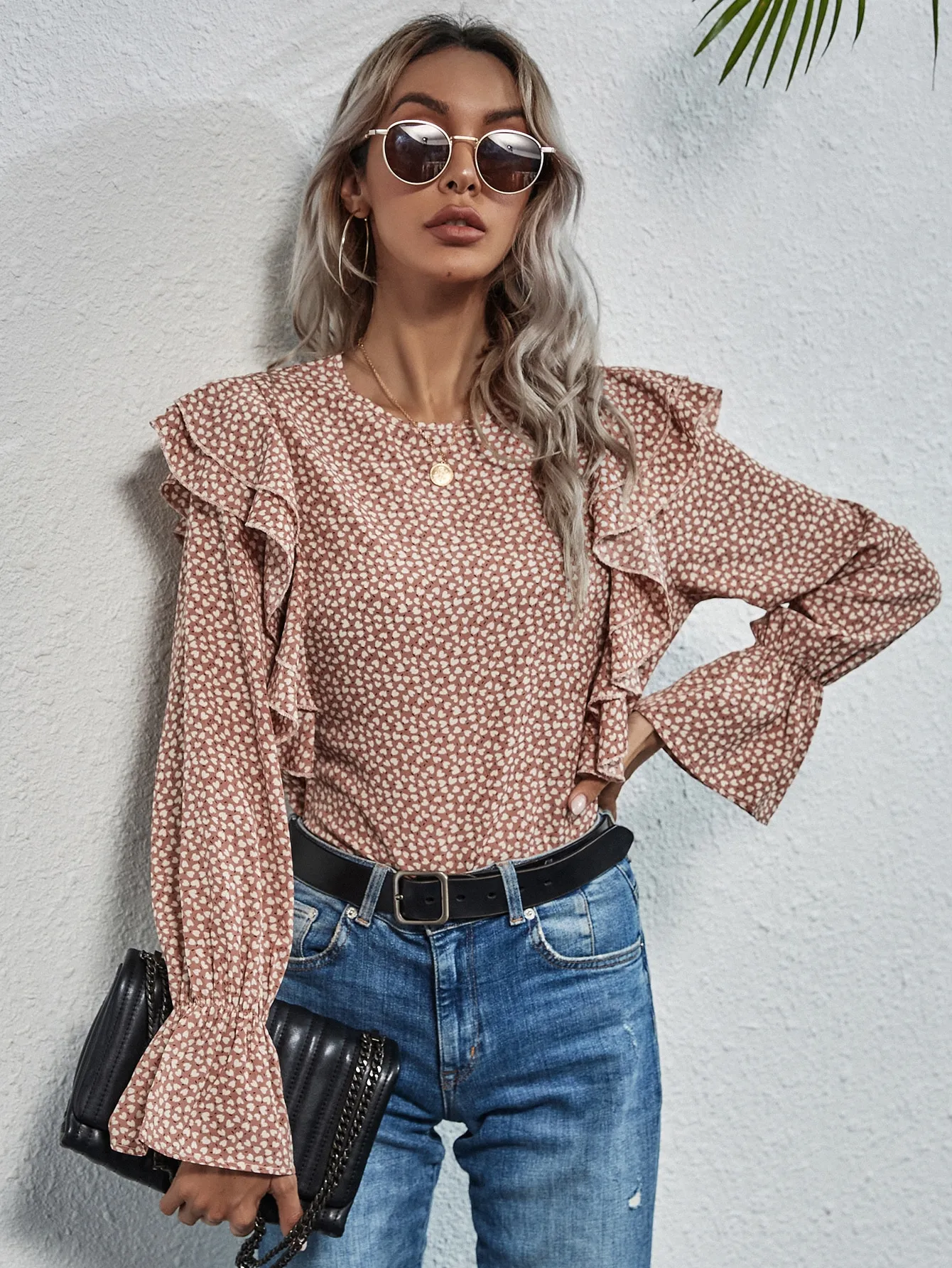 SMY Casual Round Neck Long Sleeved Ruffle Sleeves Shirt