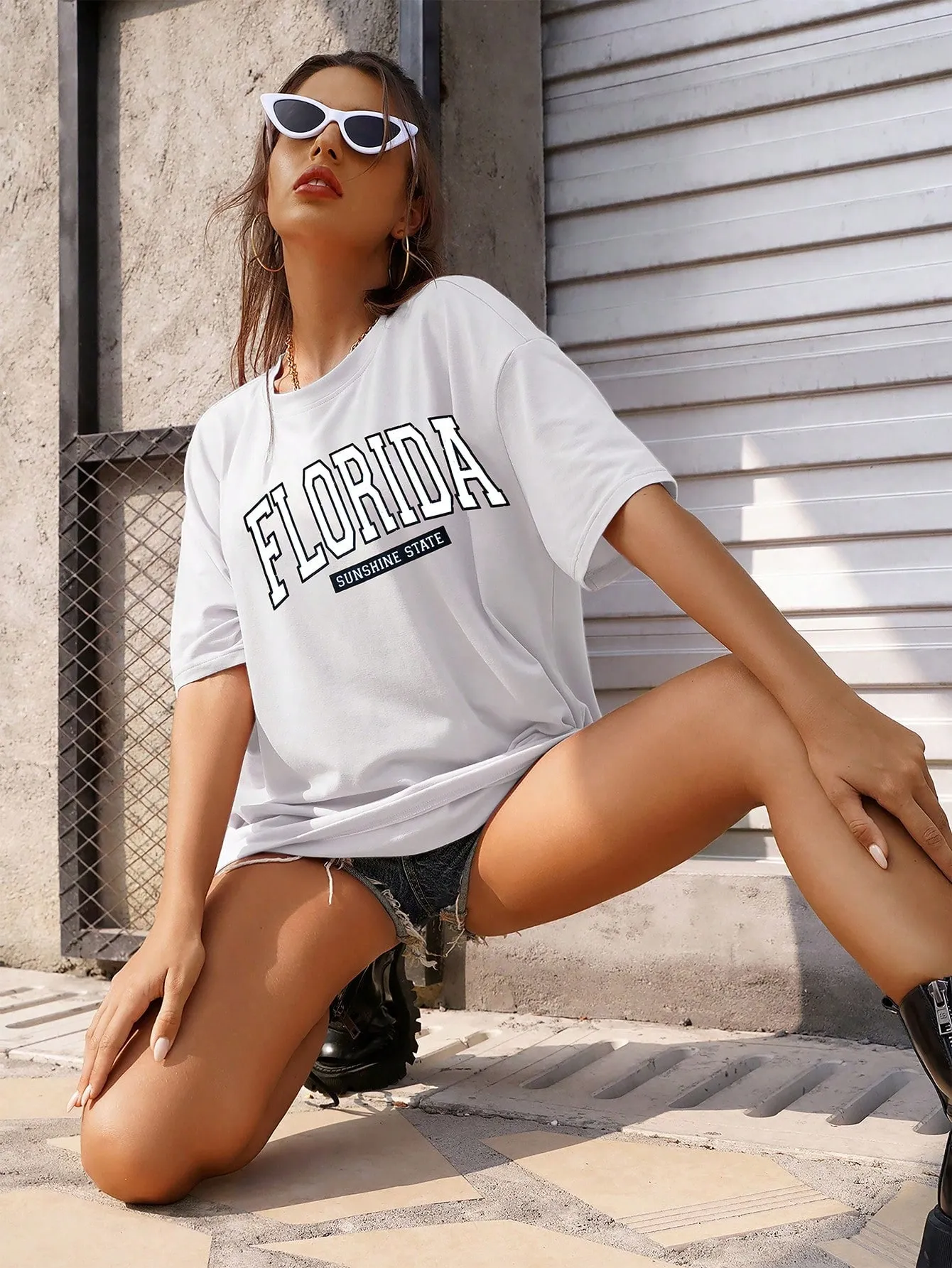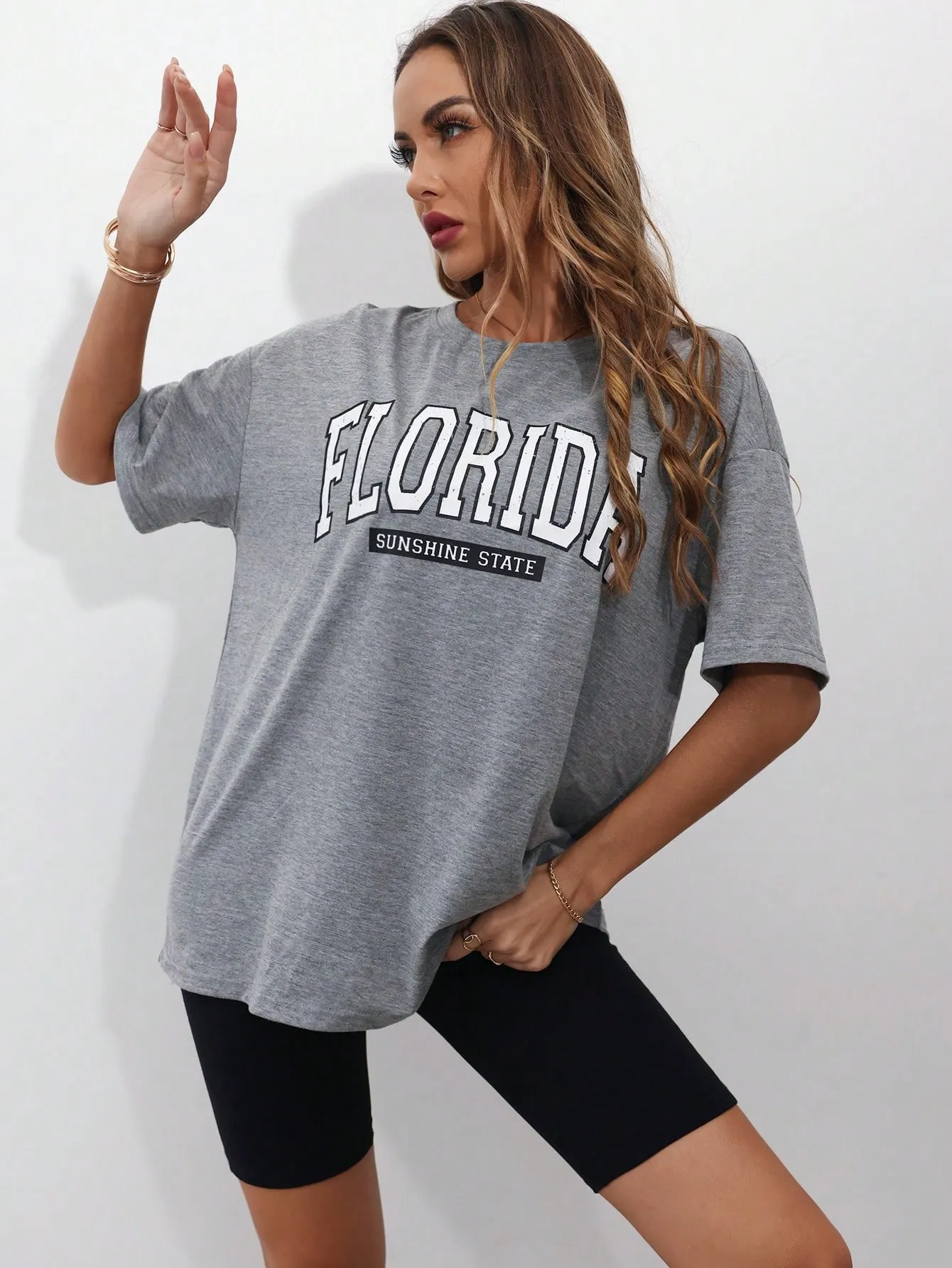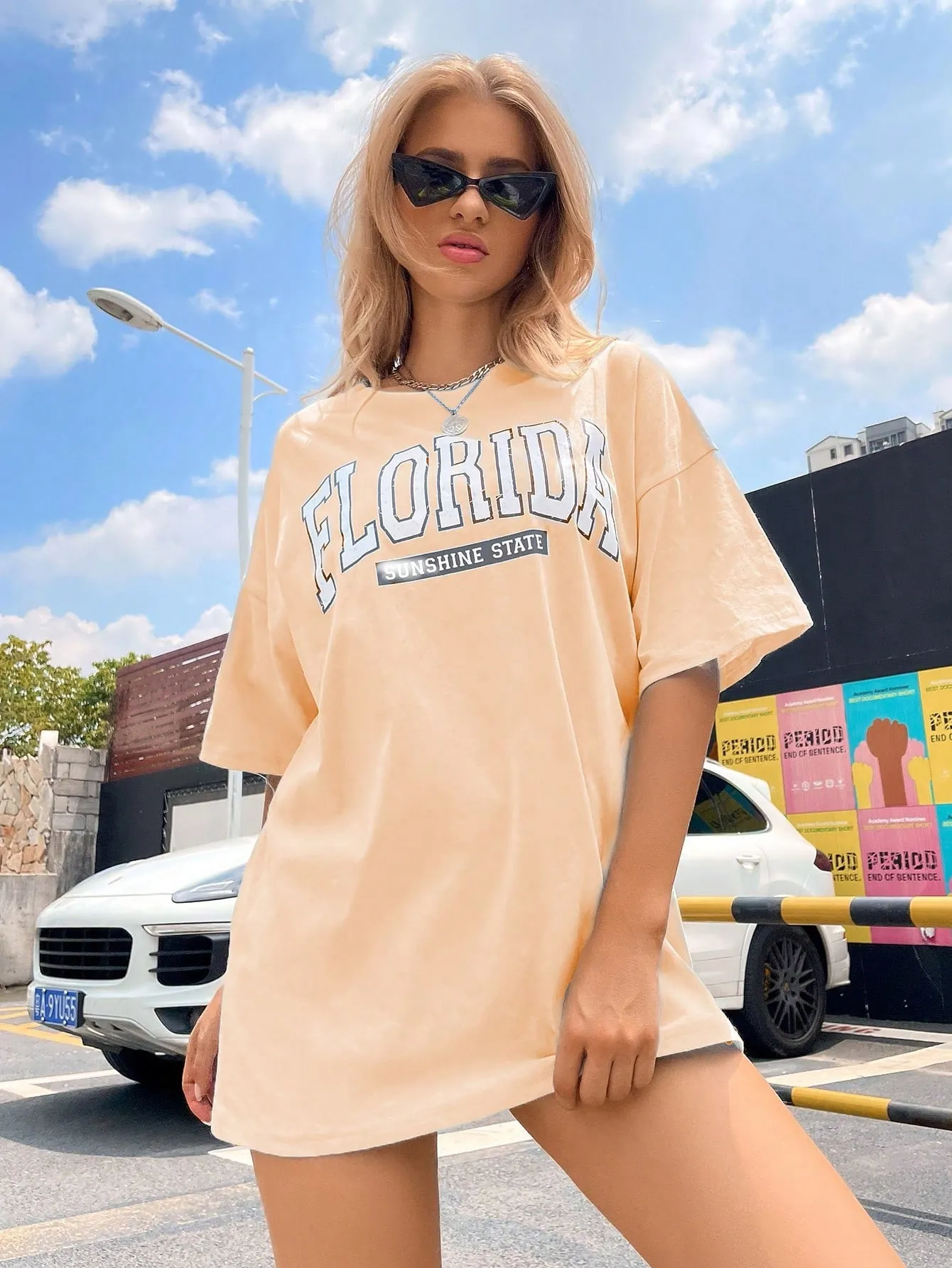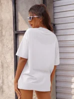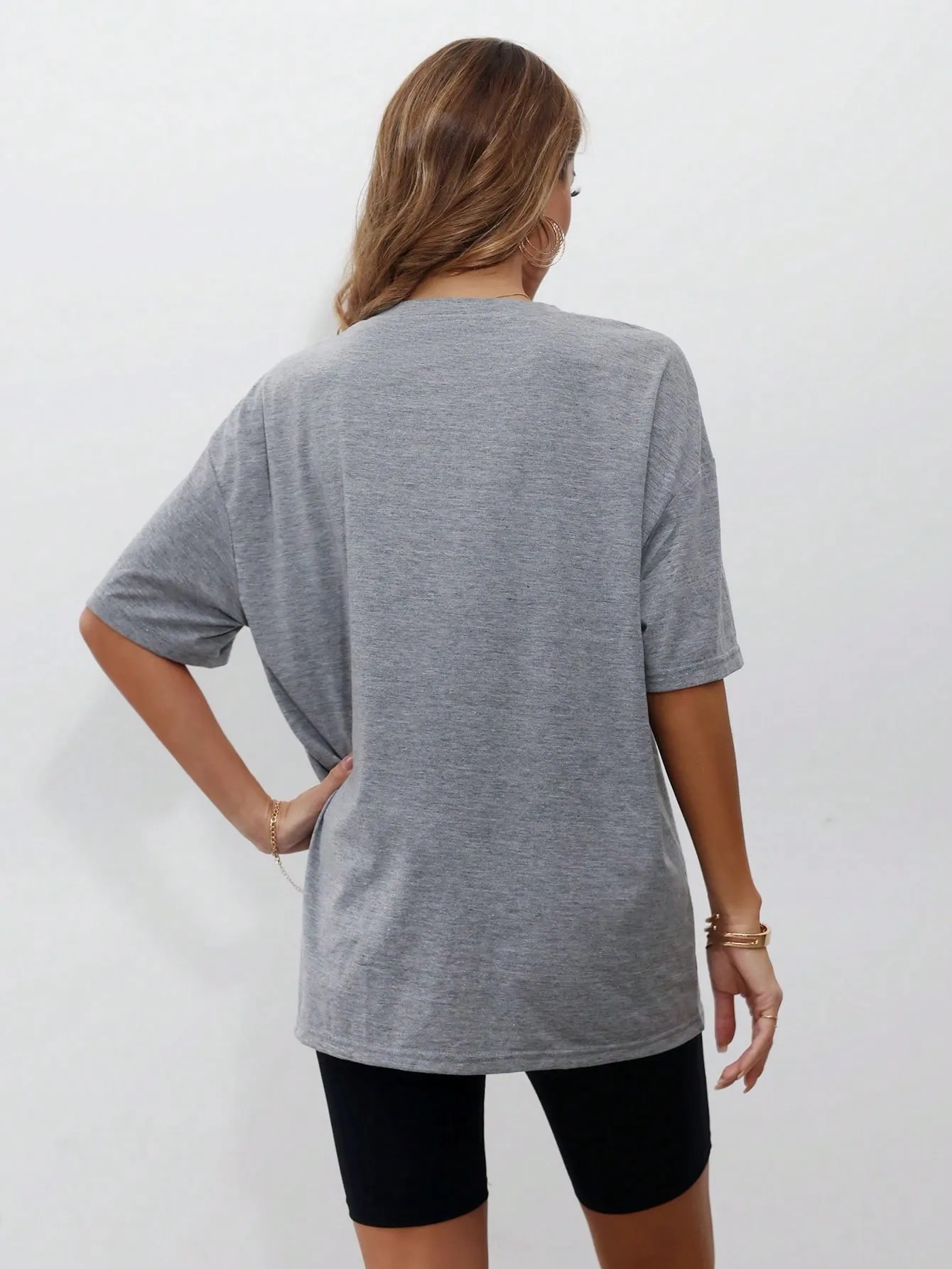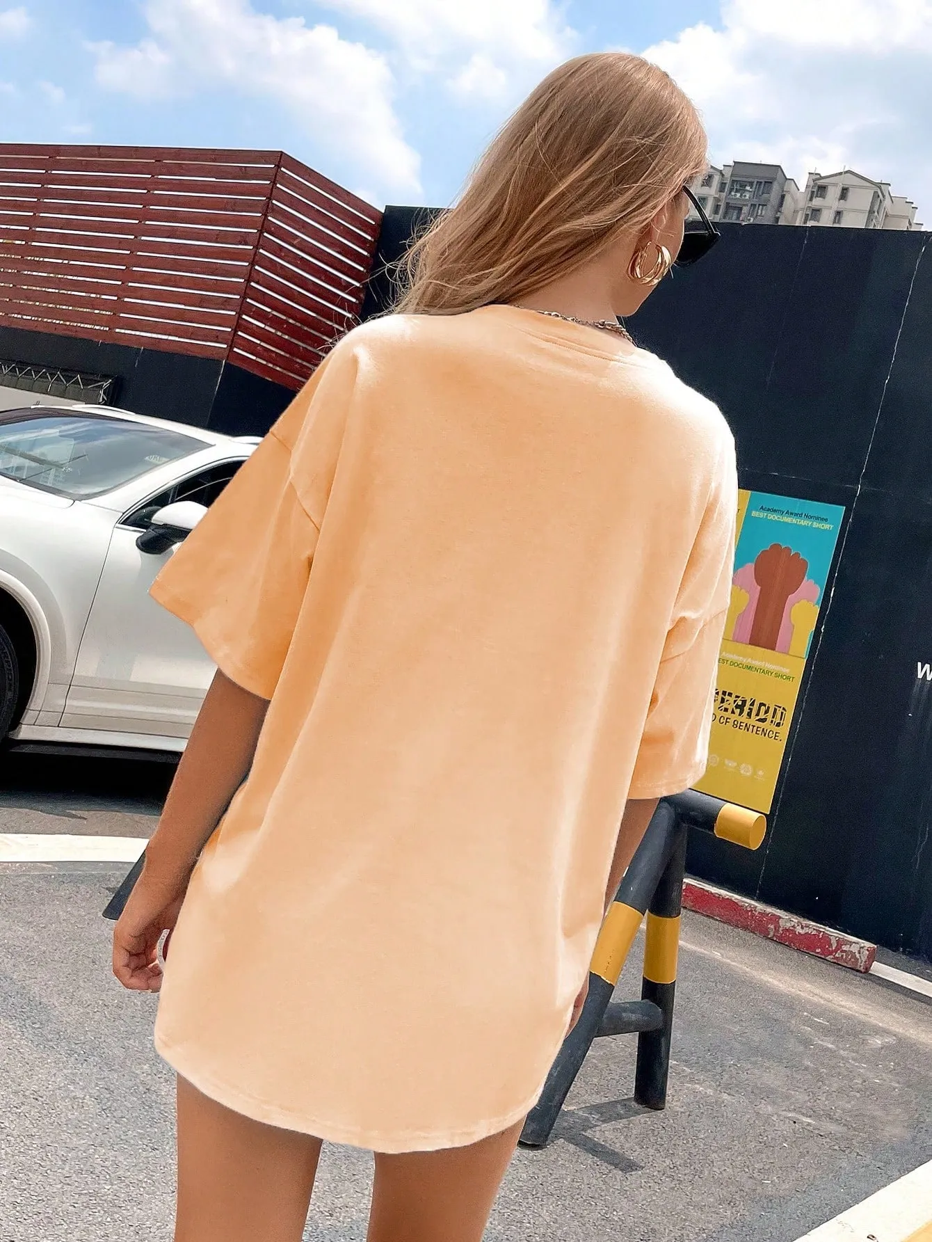 SMY Women Summer Letter Print Round Neck Drop Shoulder Sleeve Loose Casual T-Shirt