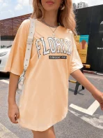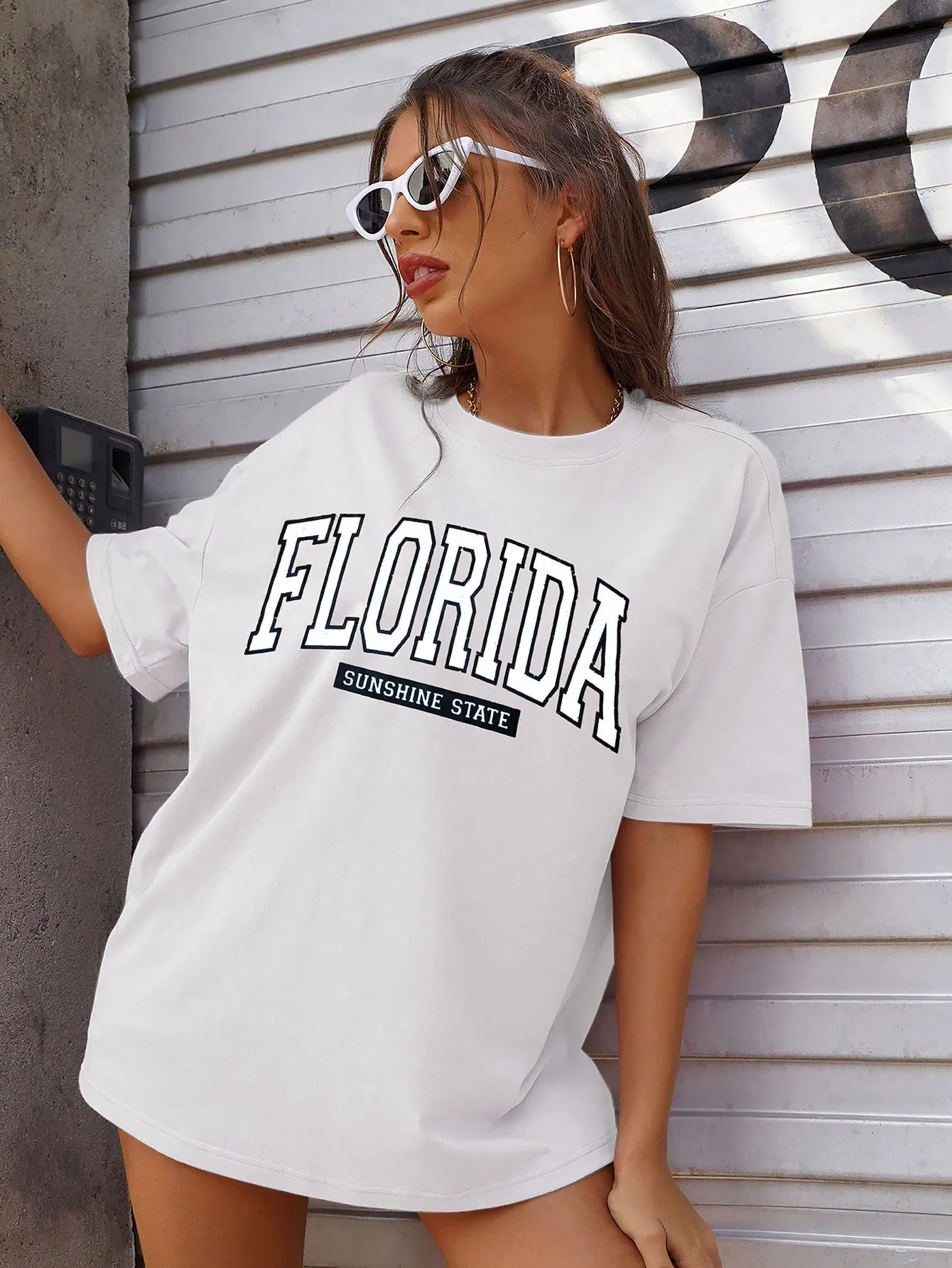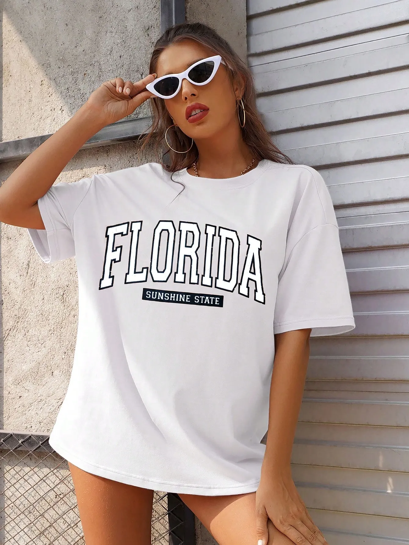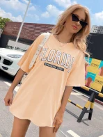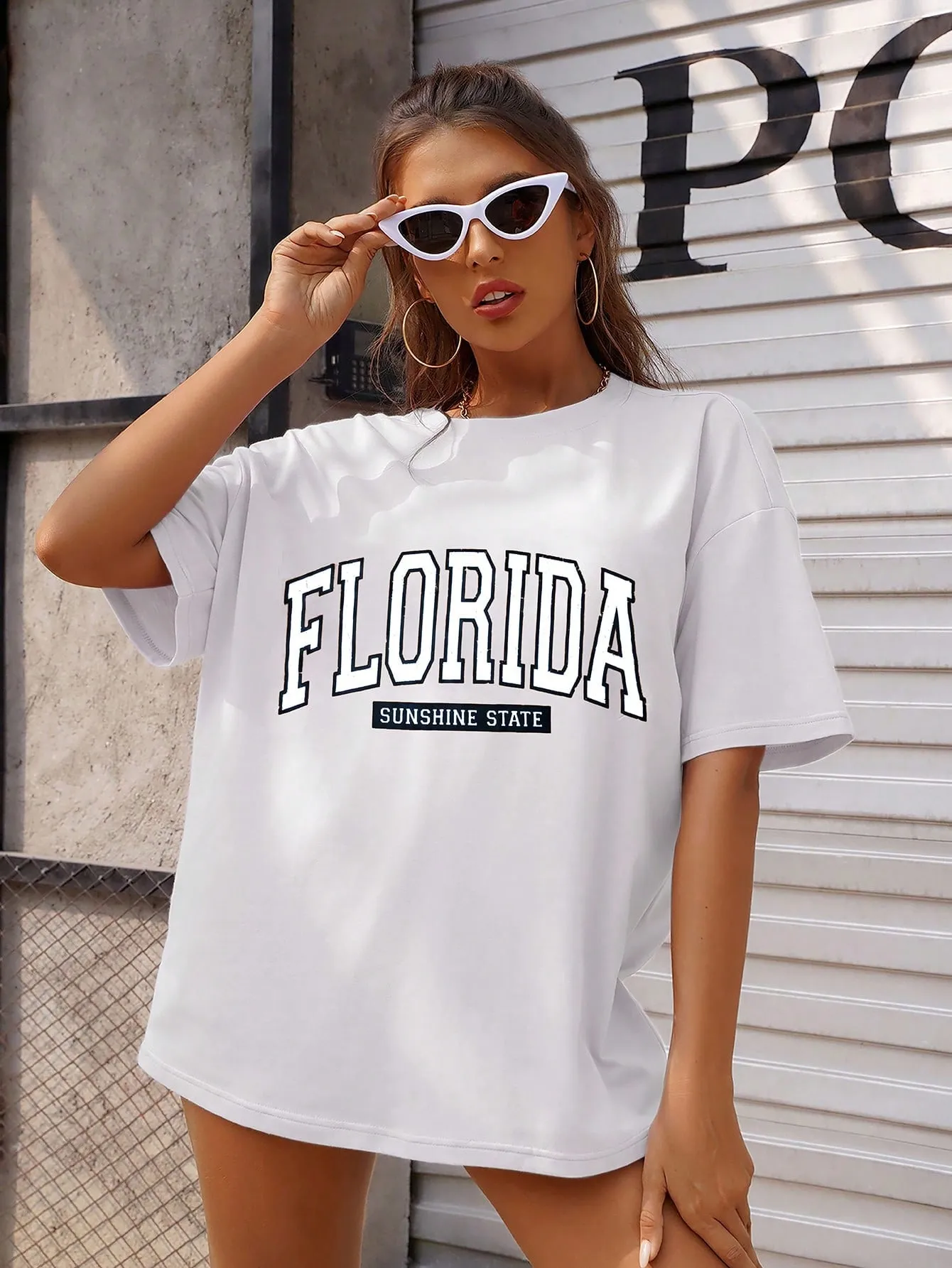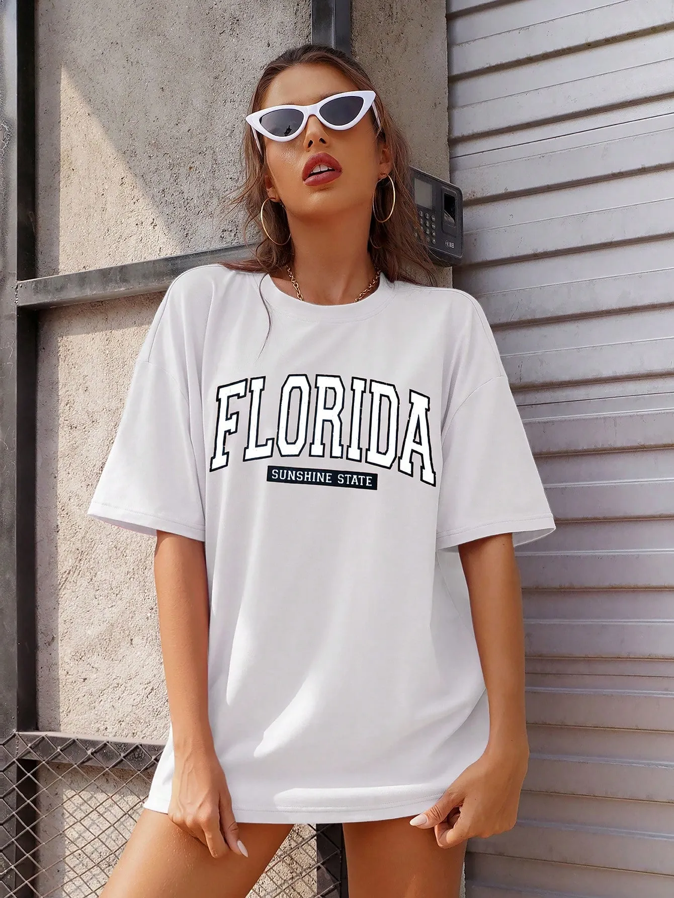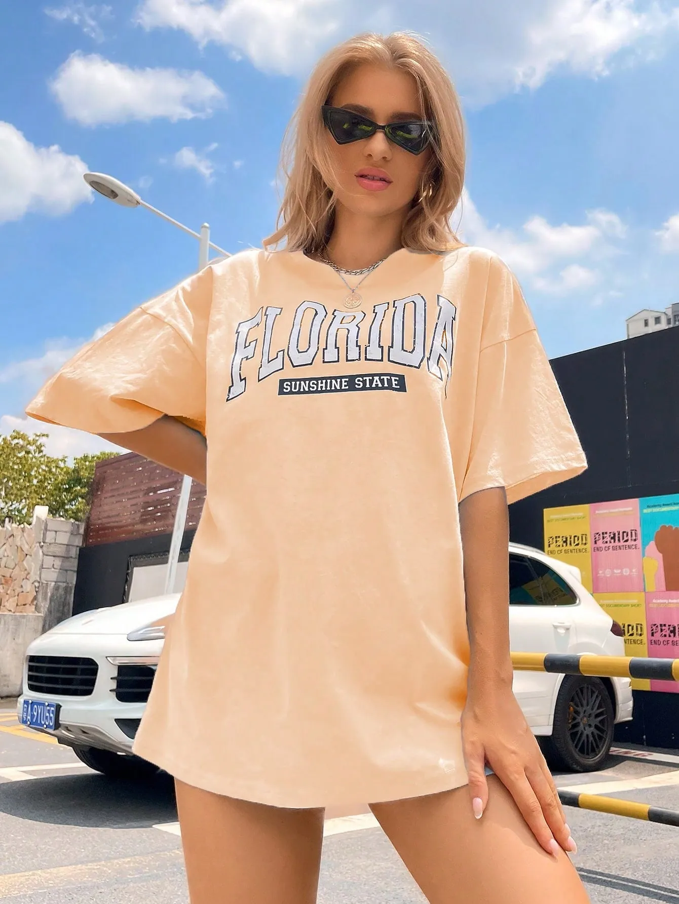 SMY Women Summer Letter Print Round Neck Drop Shoulder Sleeve Loose Casual T-Shirt