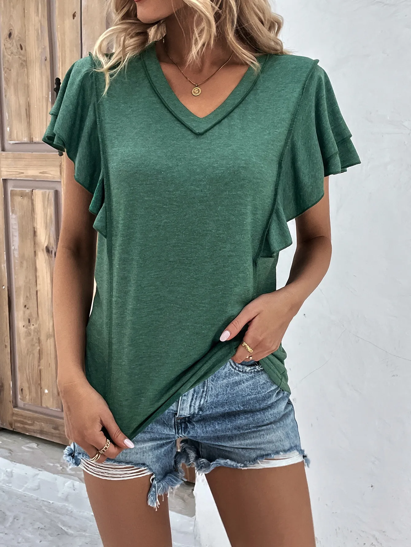 SMY Casual Ruffle Edge Trend Small V-Neck T-Shirt