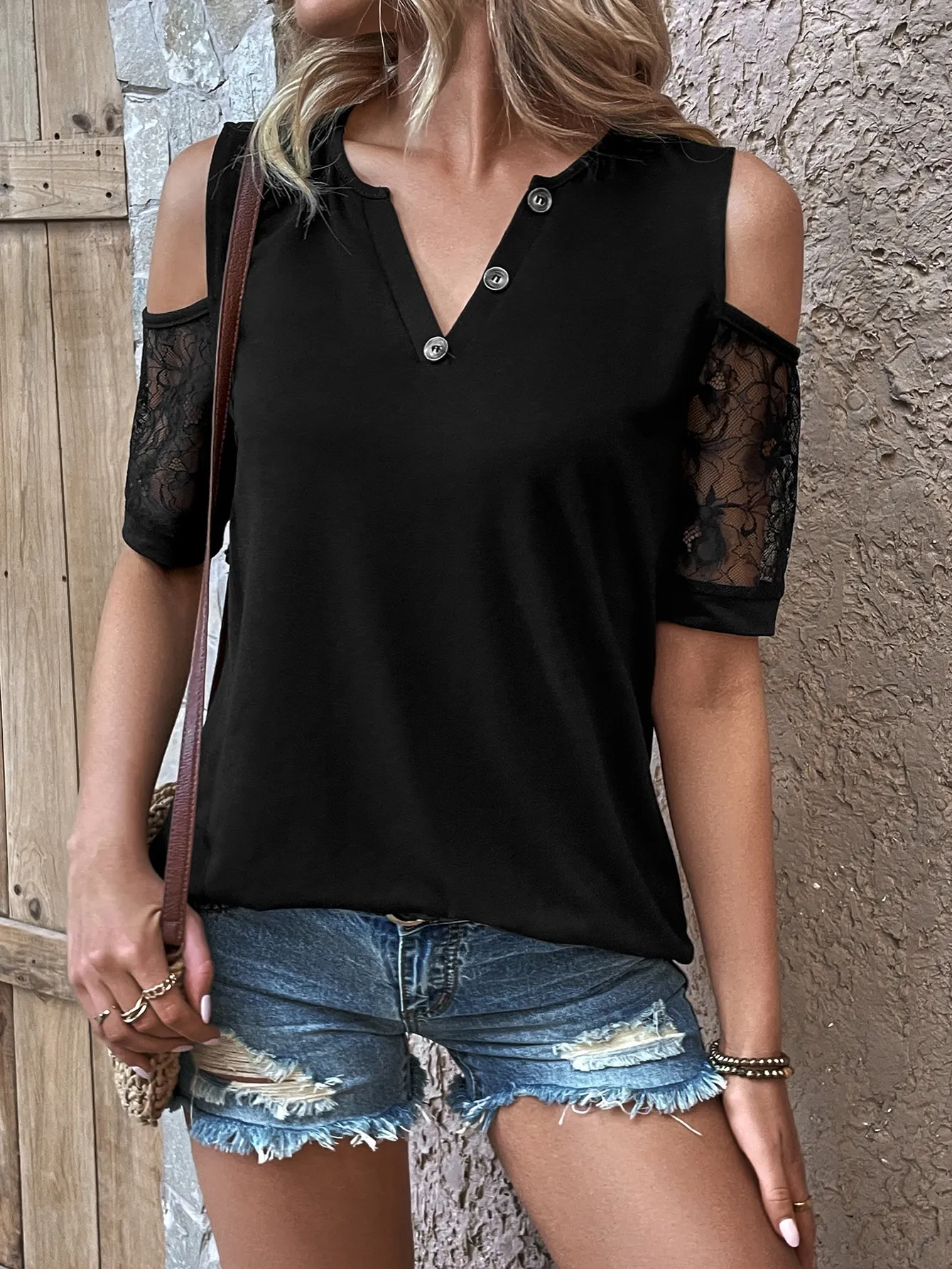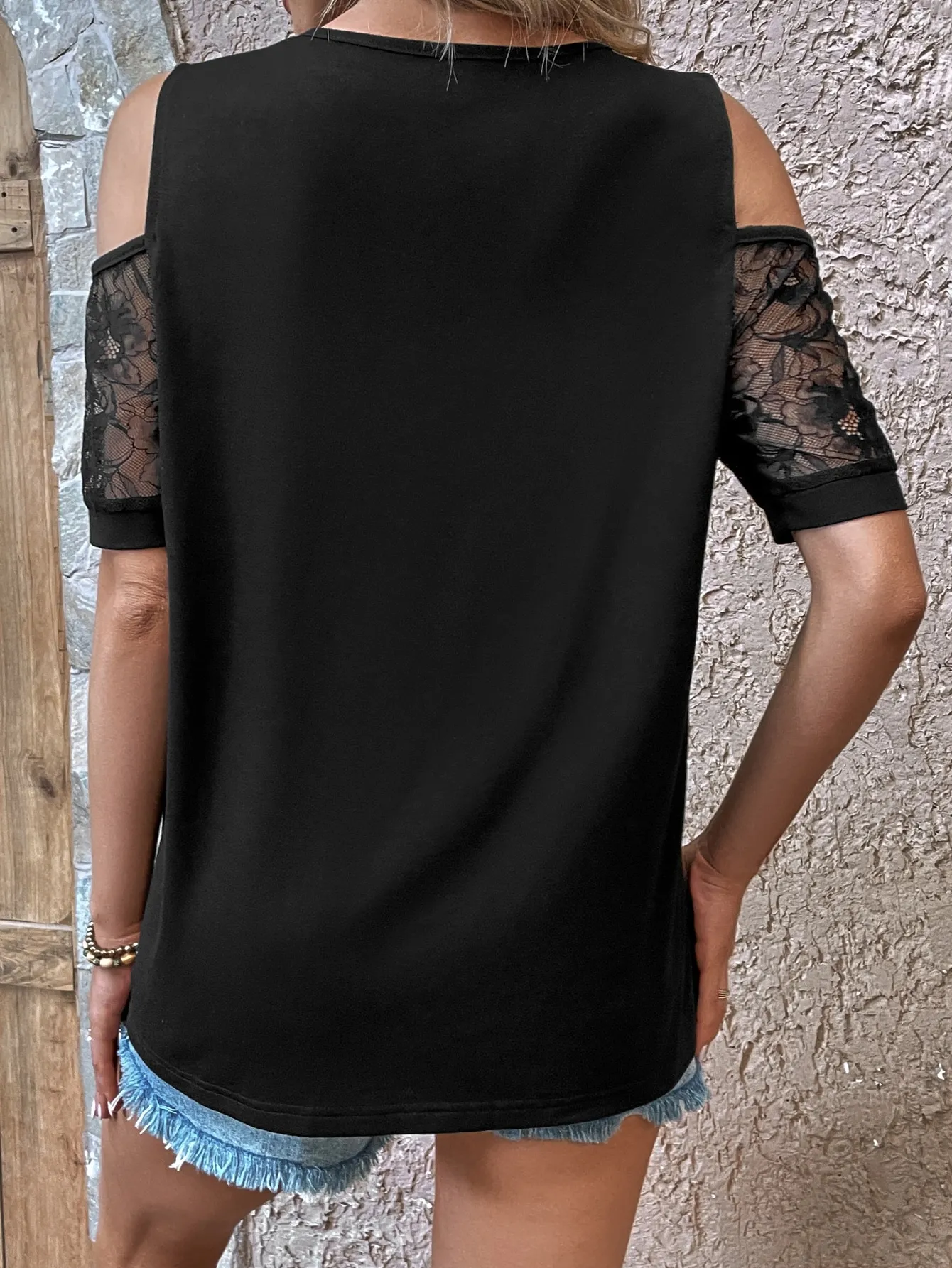 SMY Women’s Solid Color Contrast Lace Round Neck Short Sleeve Casual T-Shirt, Summer