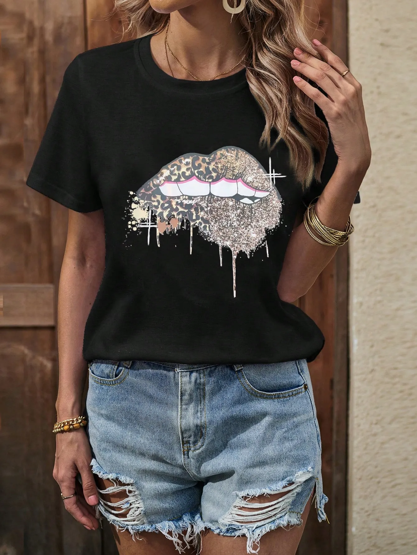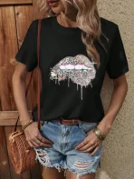SMY Casual Trend Small Round Neck Large Lip Pattern T-Shirt