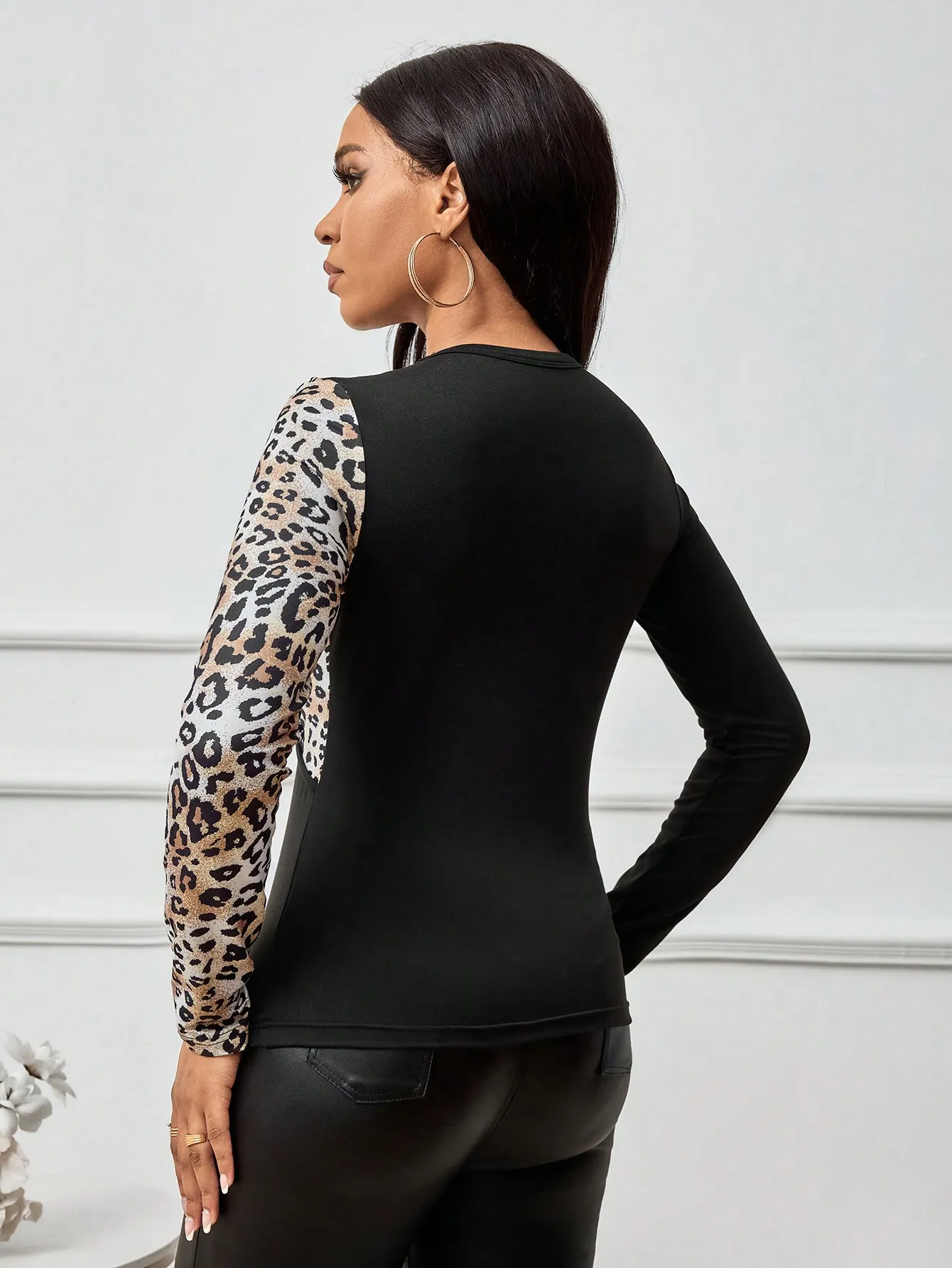 SMY Casual Trend Small Round Neck Women’s Slim Fit Cross Color Leopard Print T-Shirt