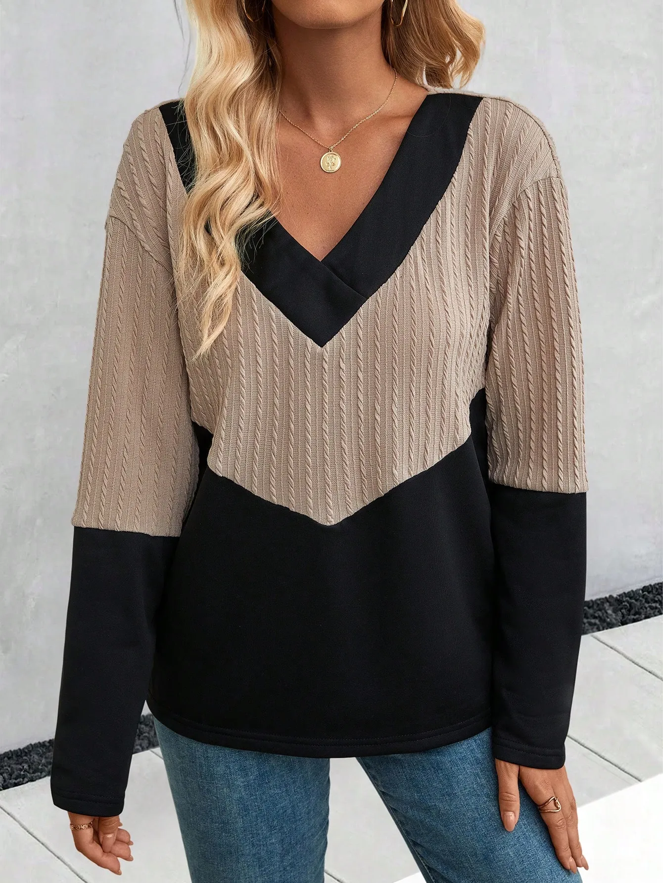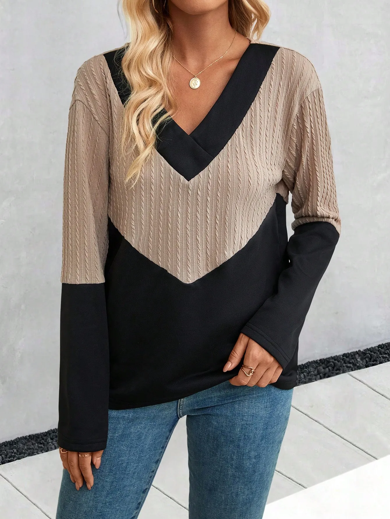 SMY Women’s V-neck Button Decoration Patchwork Long Sleeve Casual T-shirt