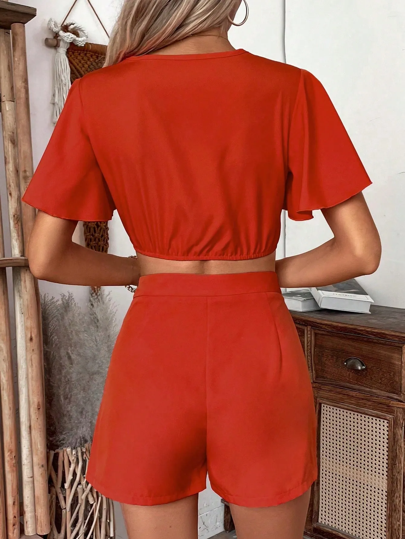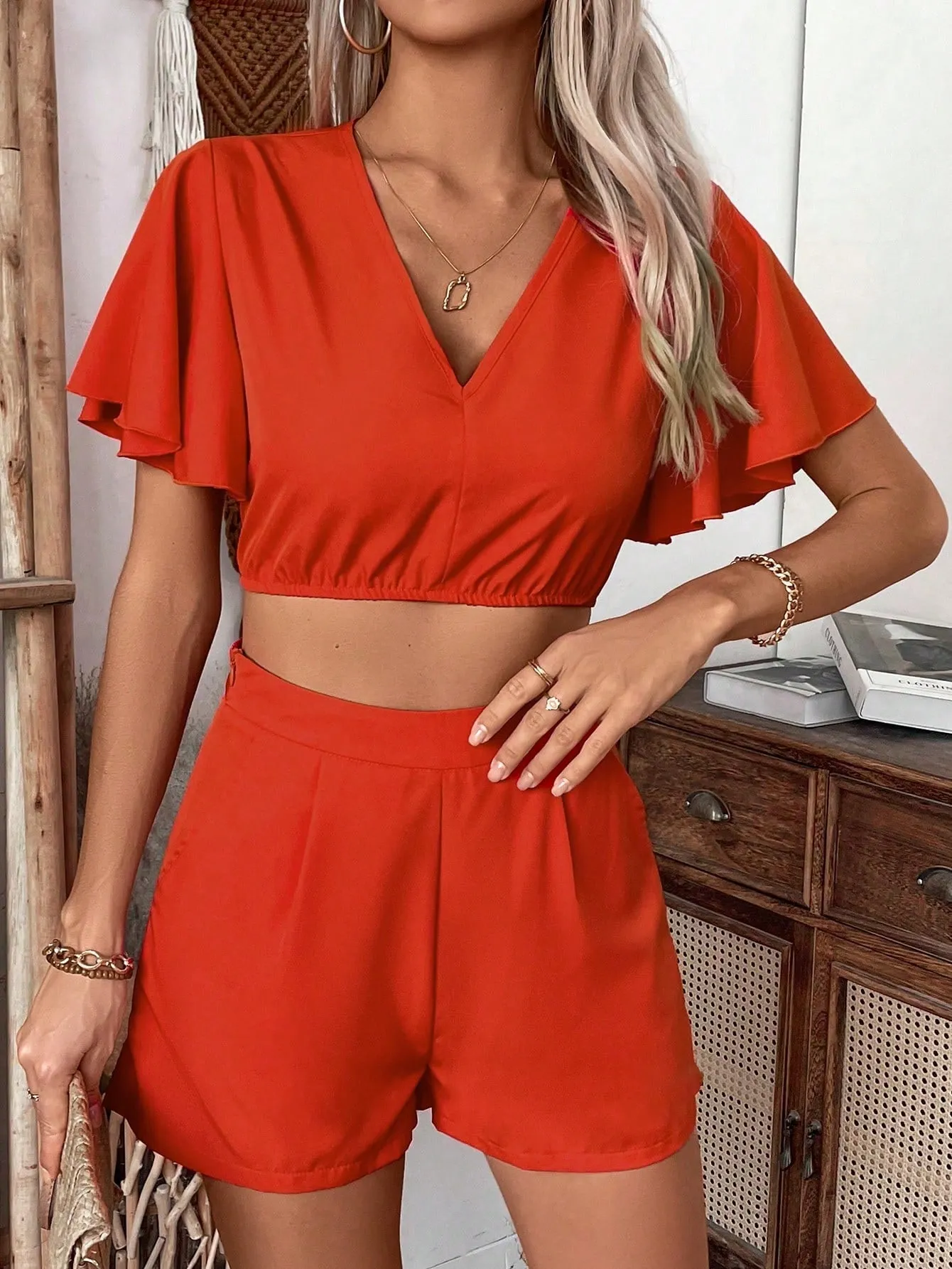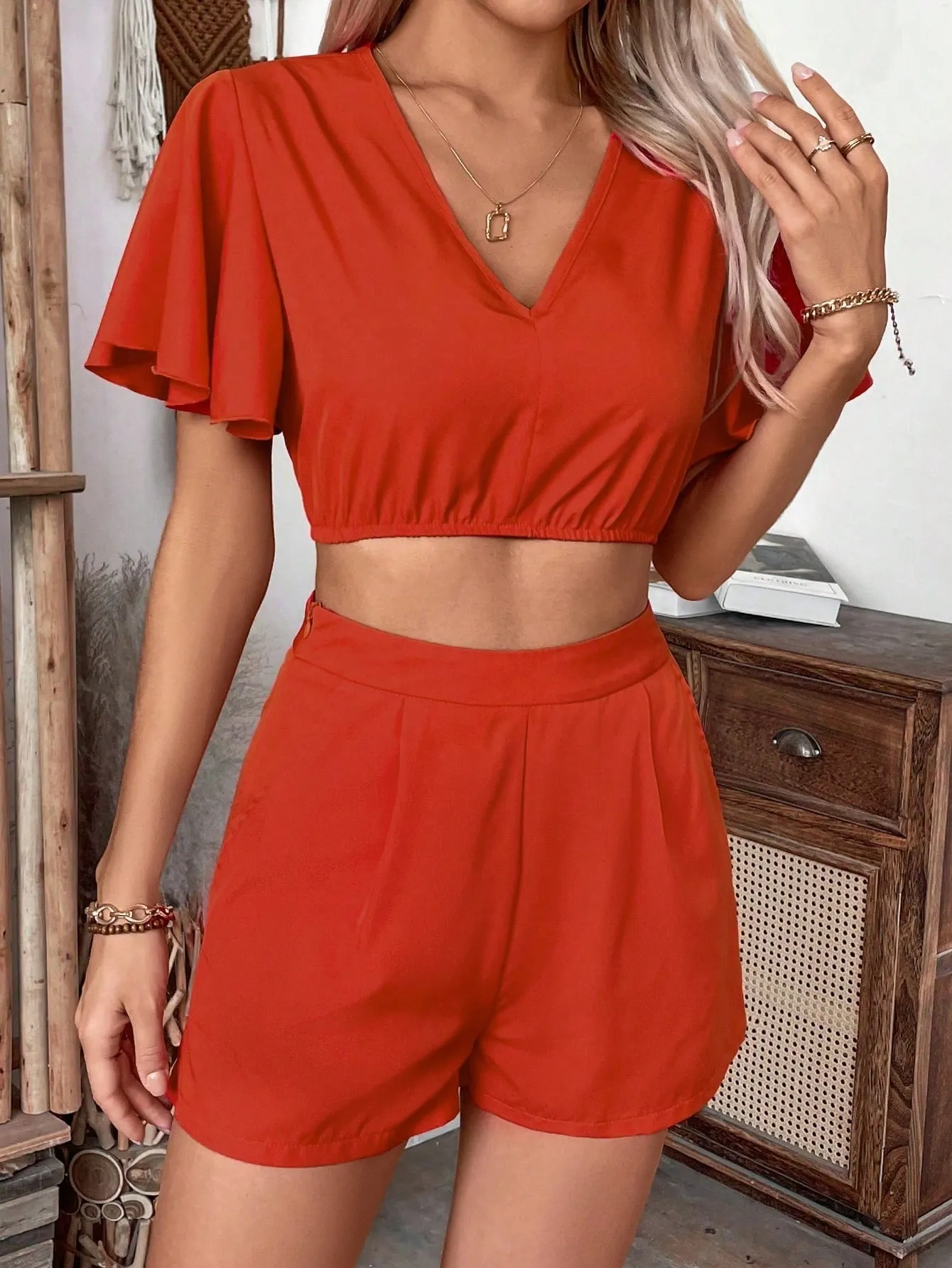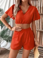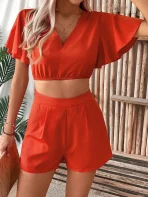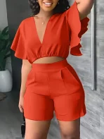SMY Casual Trend Small V-Neck Women’s Ruffle Edge Solid Color Simple V-Neck Casual Two-Piece Set