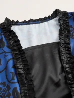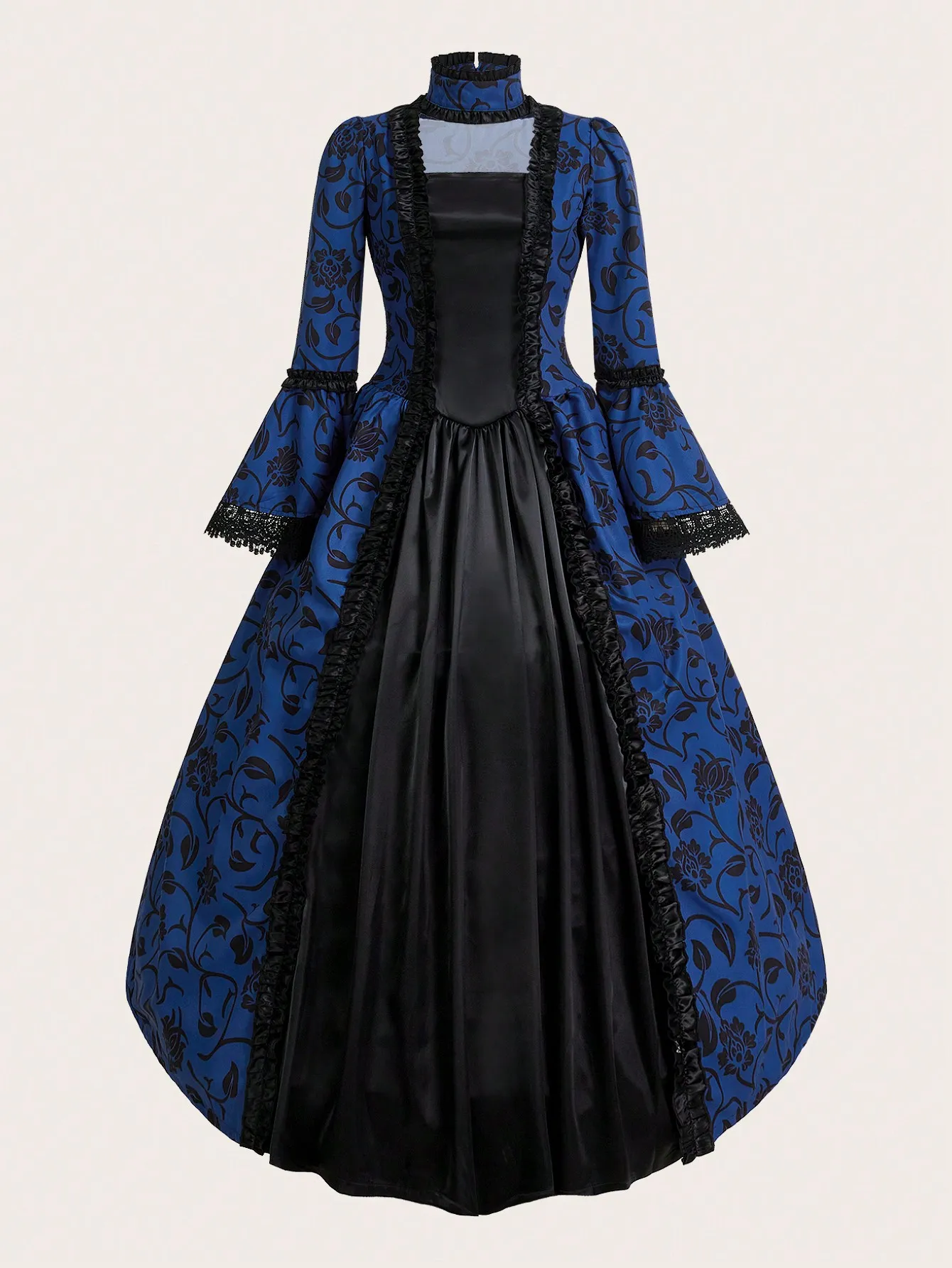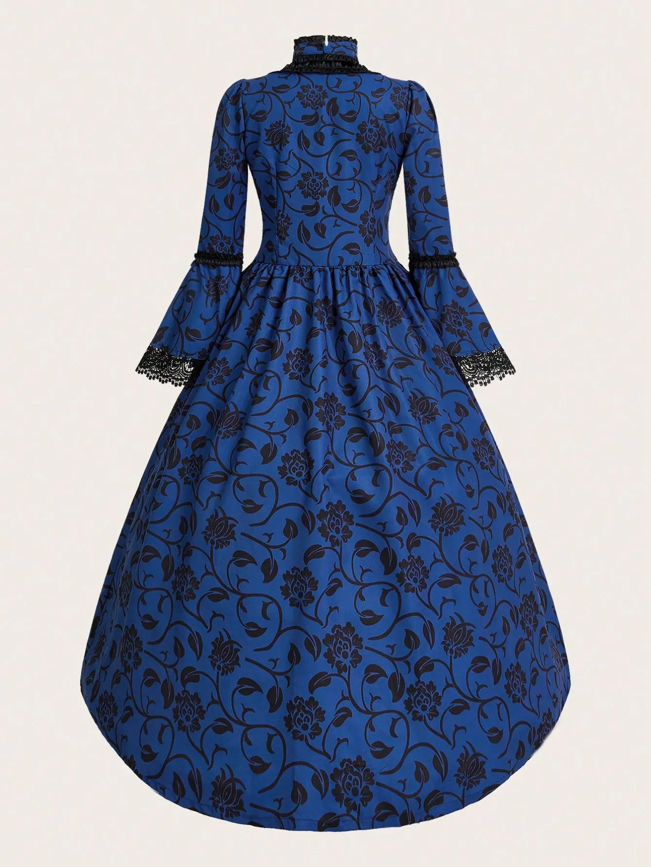 SMY Women’s Fashion Blue Floral Print Color Block Puff Sleeve Dress Maxi Women Outfit