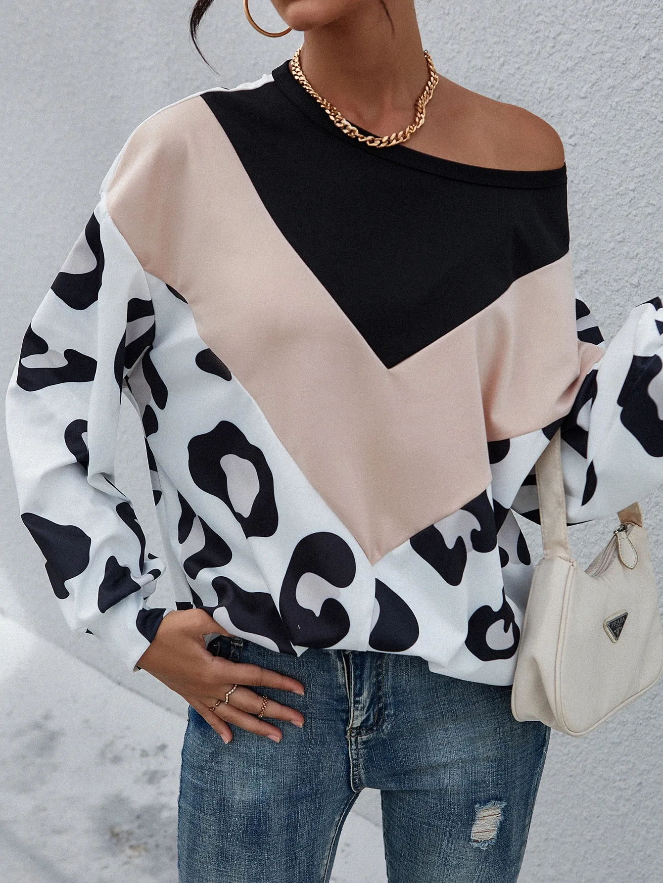 SMY Women’s V-neck Button Decoration Patchwork Long Sleeve Casual T-shirt