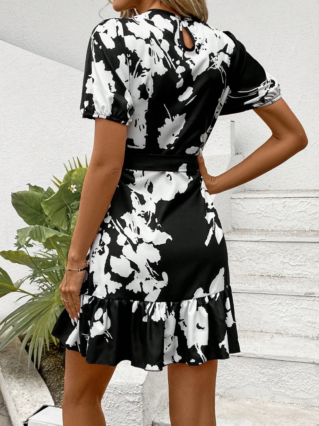 SMY Women’s Patchwork Plant Printed Short Flying Sleeve A-Line Dress