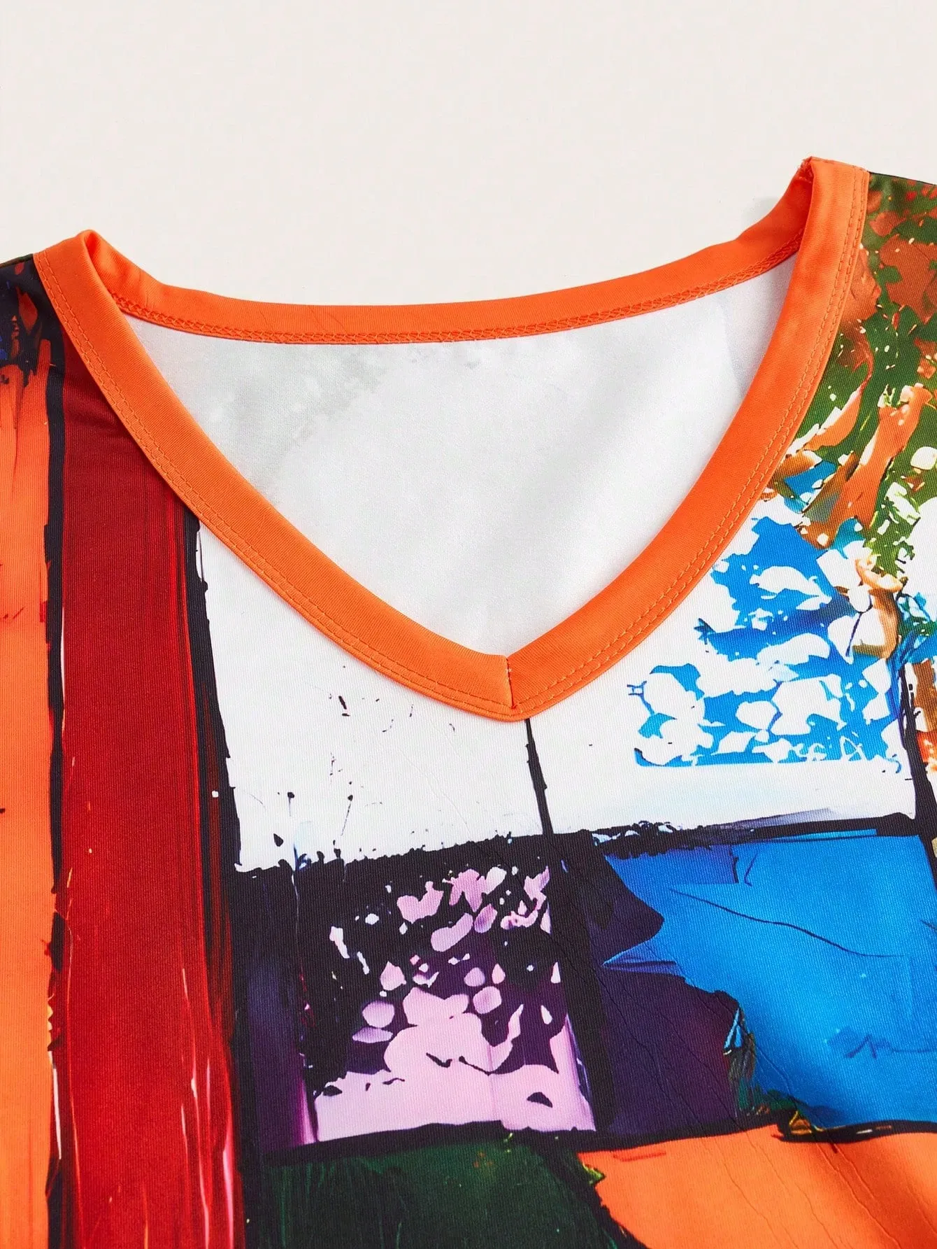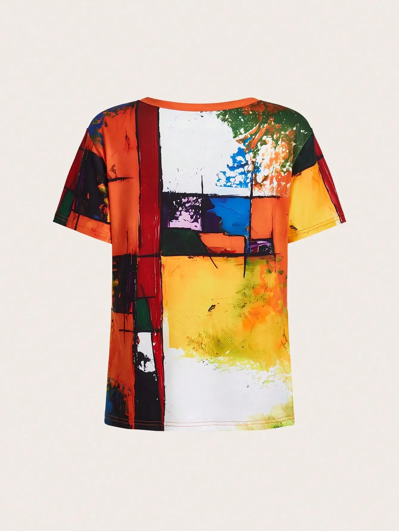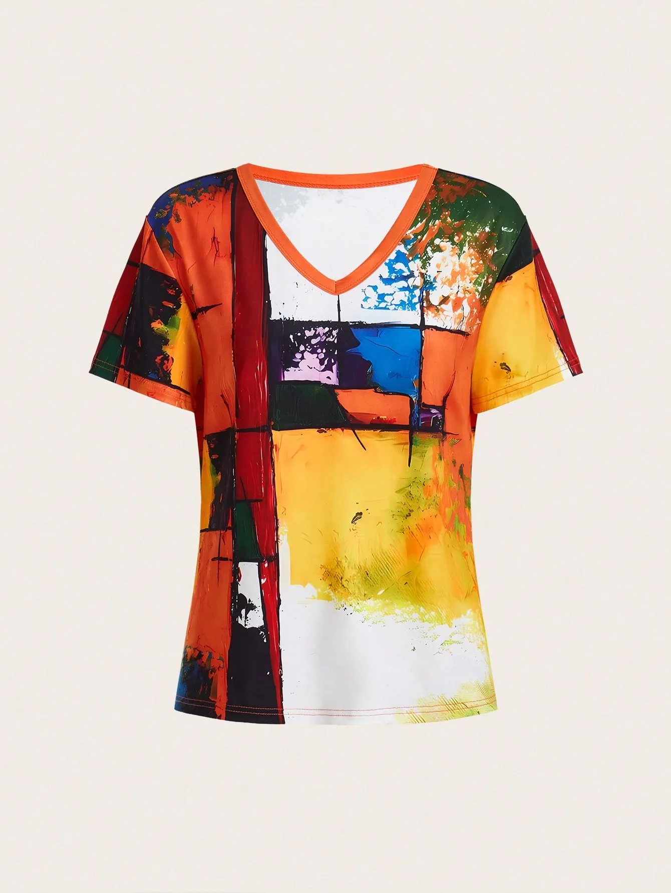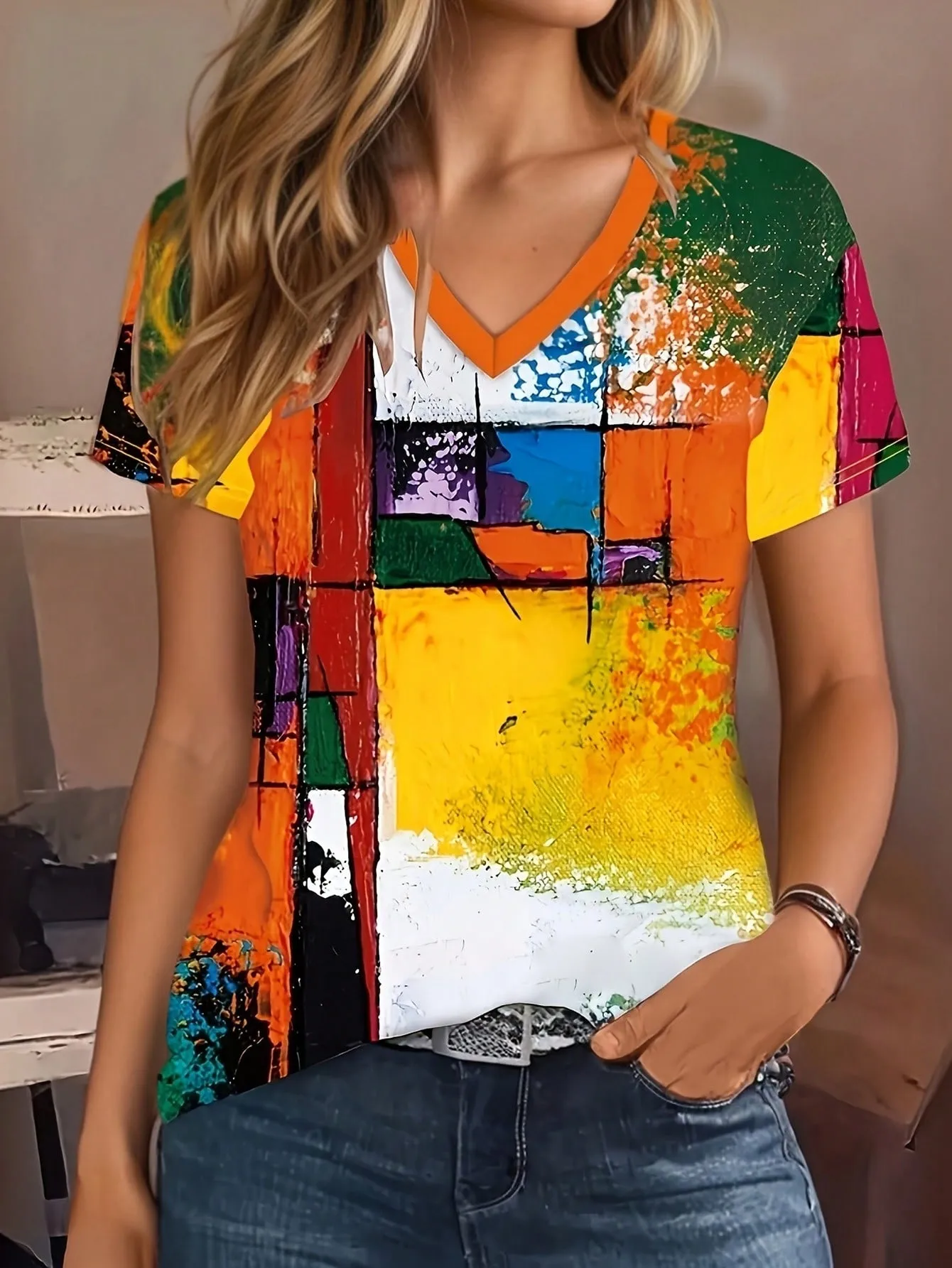 SMY Elegant Small V-Neck Women’s Geometric Oil Painting Inspired Printed T-Shirt