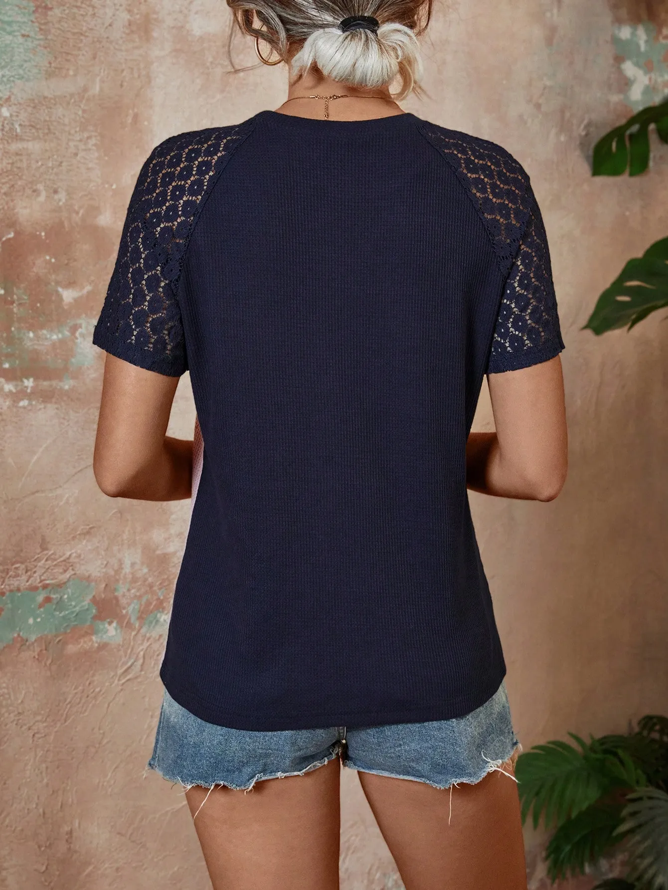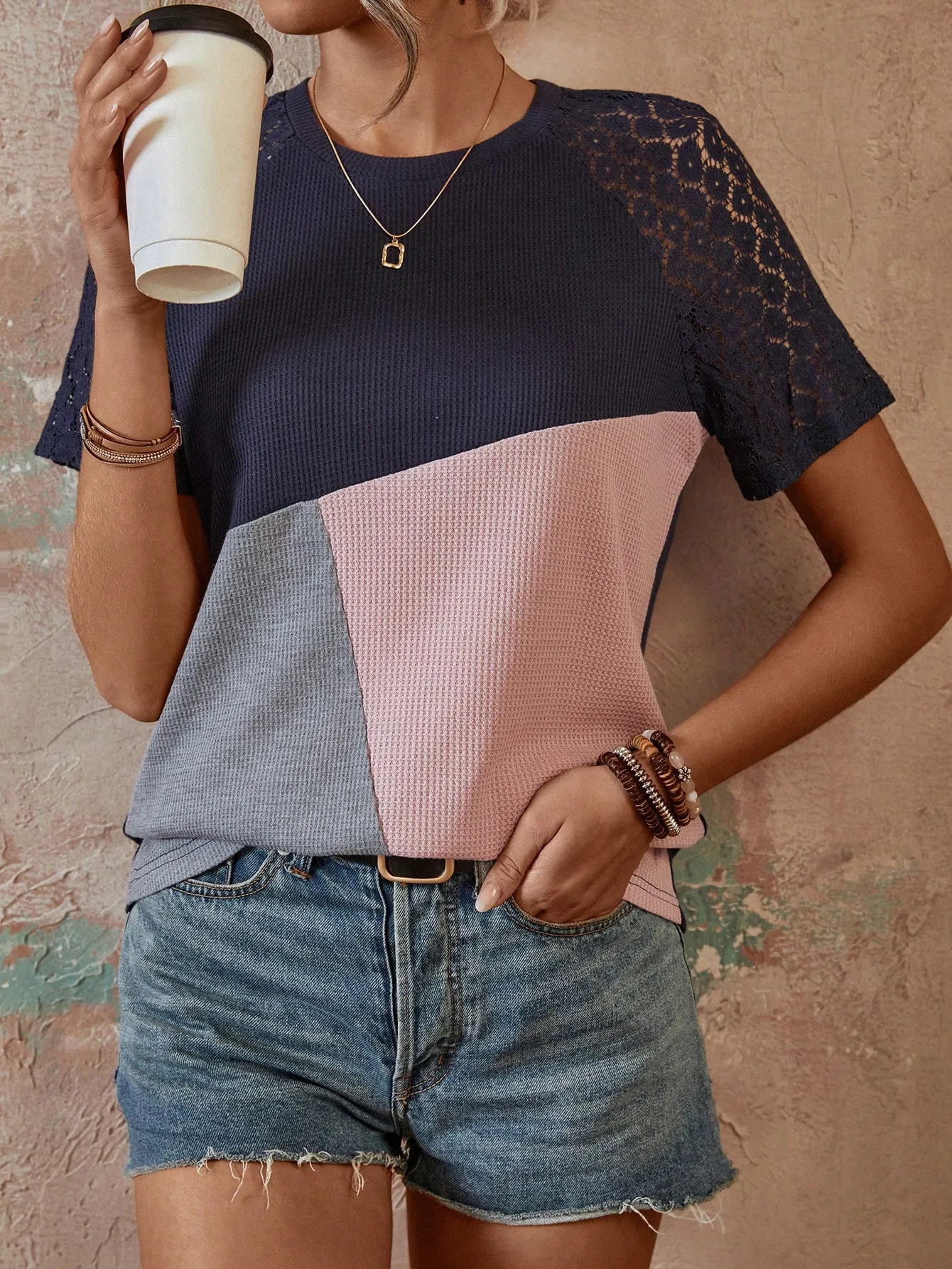 SMY Women’s Solid Color Contrast Lace Round Neck Short Sleeve Casual T-Shirt, Summer