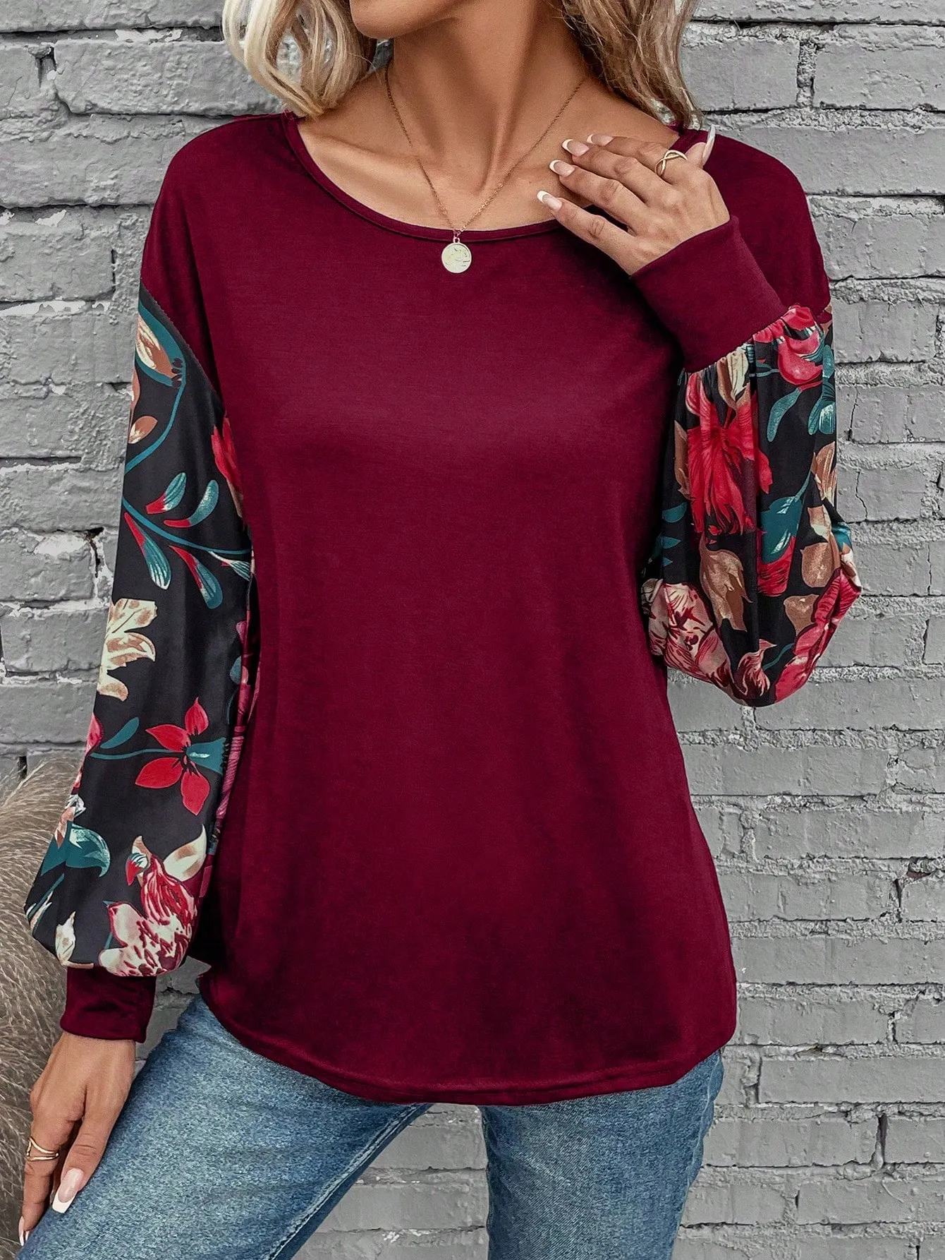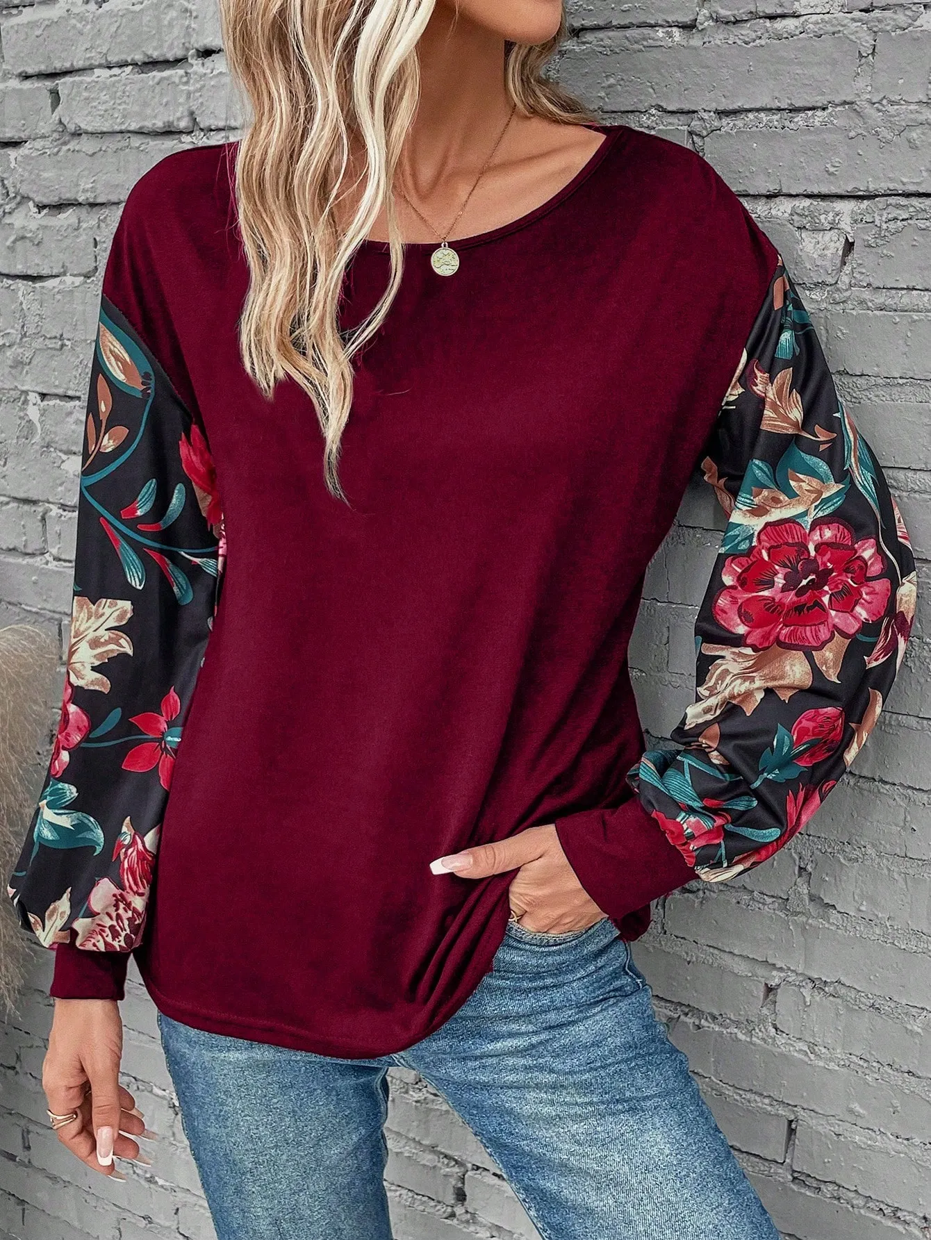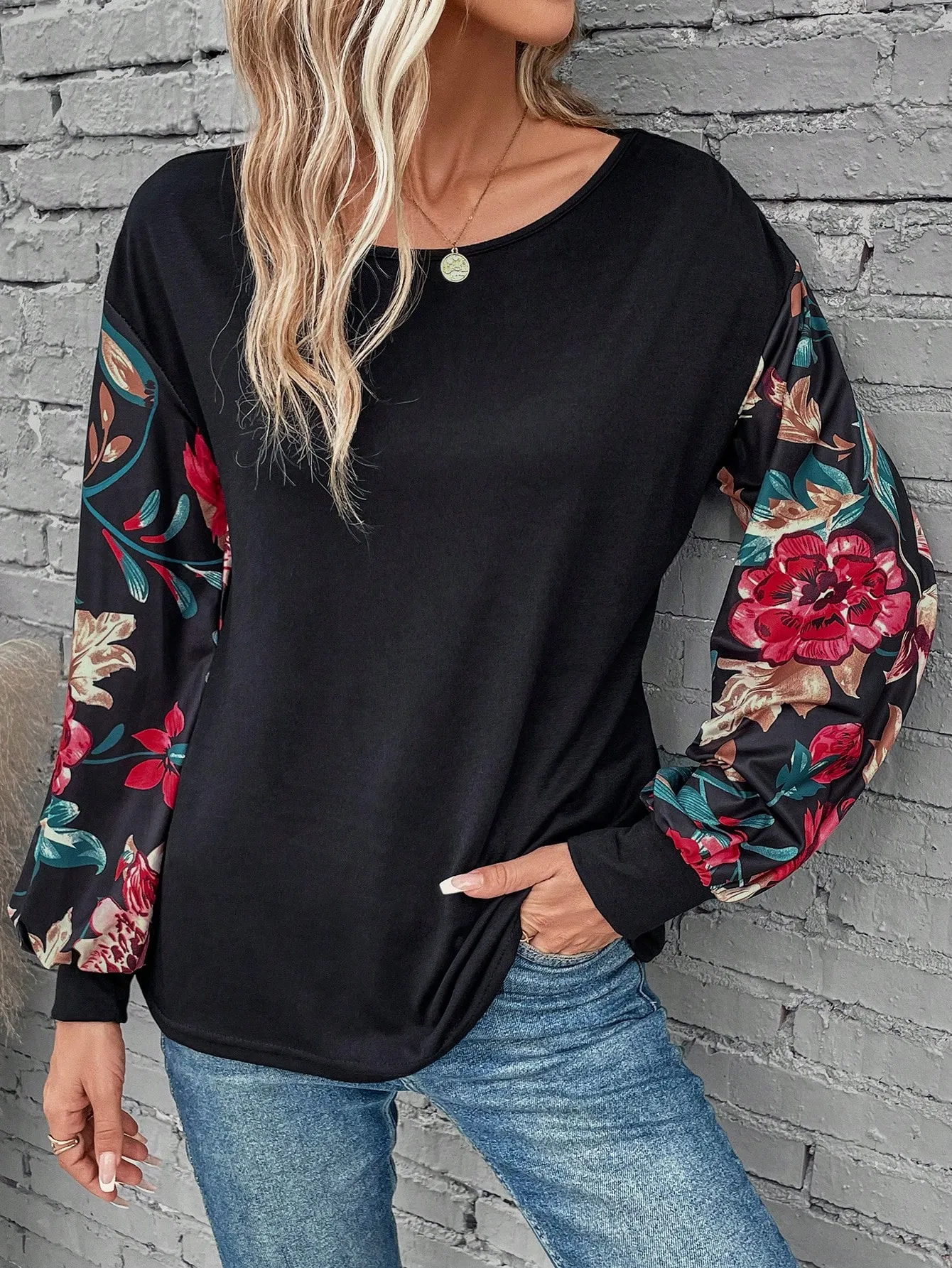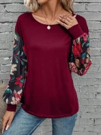 SMY Elegant Trend Small Round Neck T-Shirt With Flower Patterned Long Sleeved