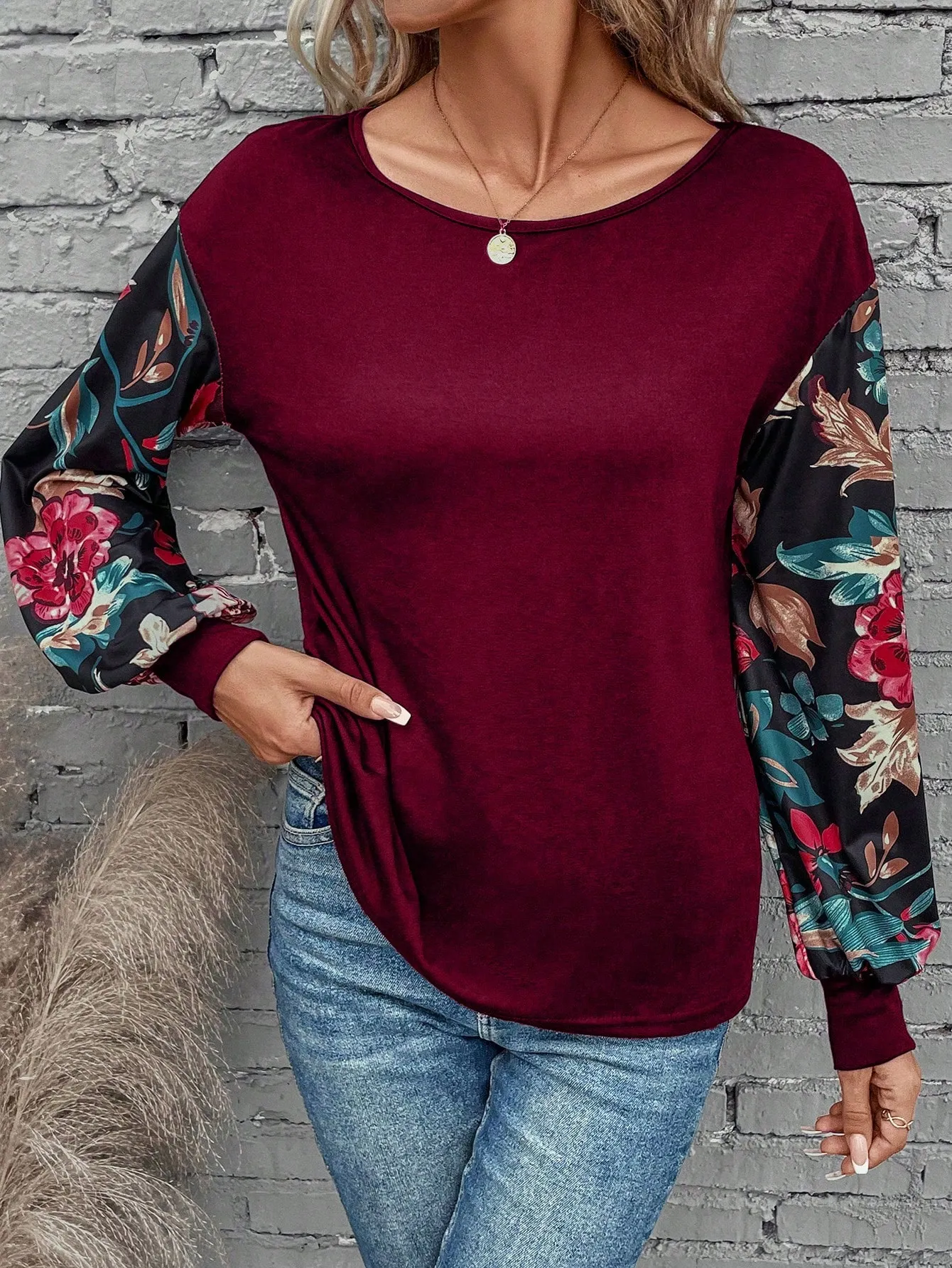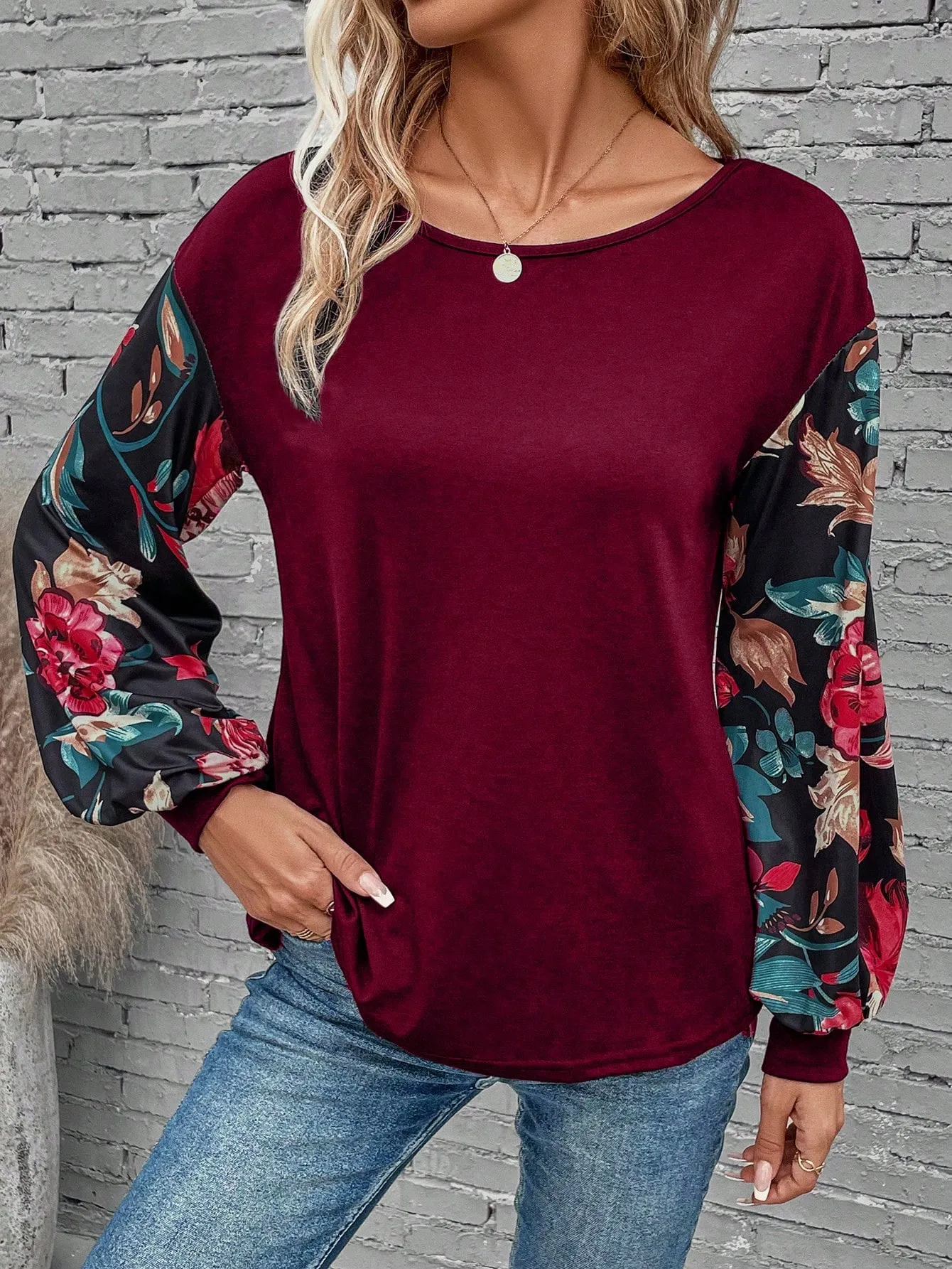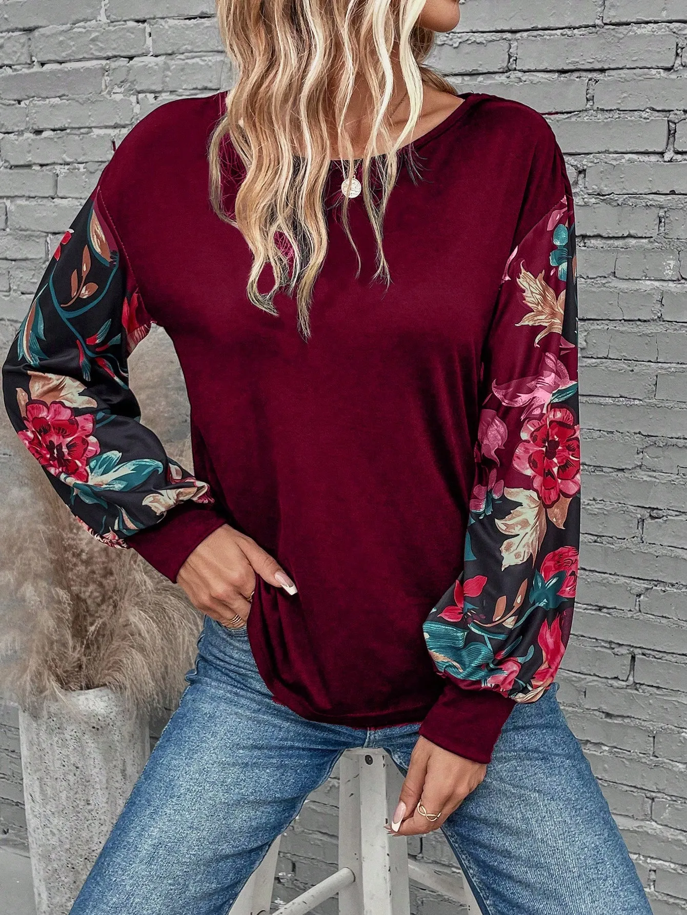 SMY Elegant Trend Small Round Neck T-Shirt With Flower Patterned Long Sleeved