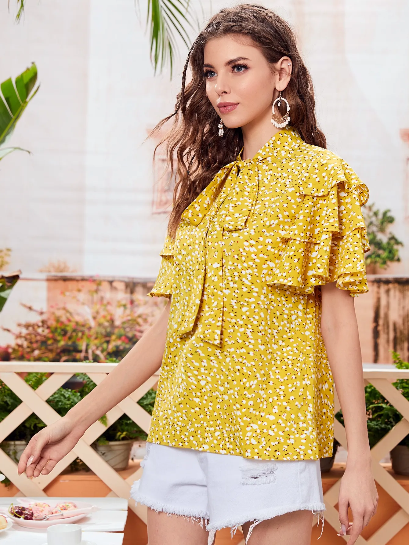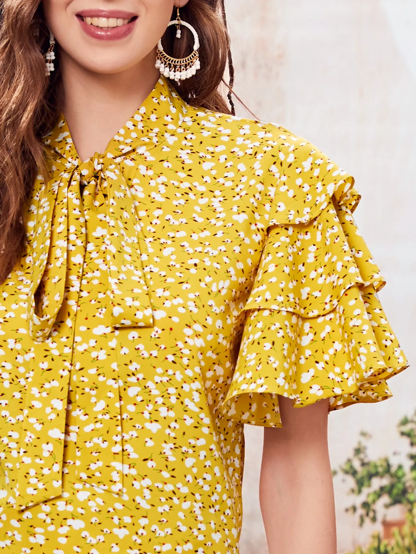 SMY Floral Print Ribbon Collar Small Floral Tie Shirt