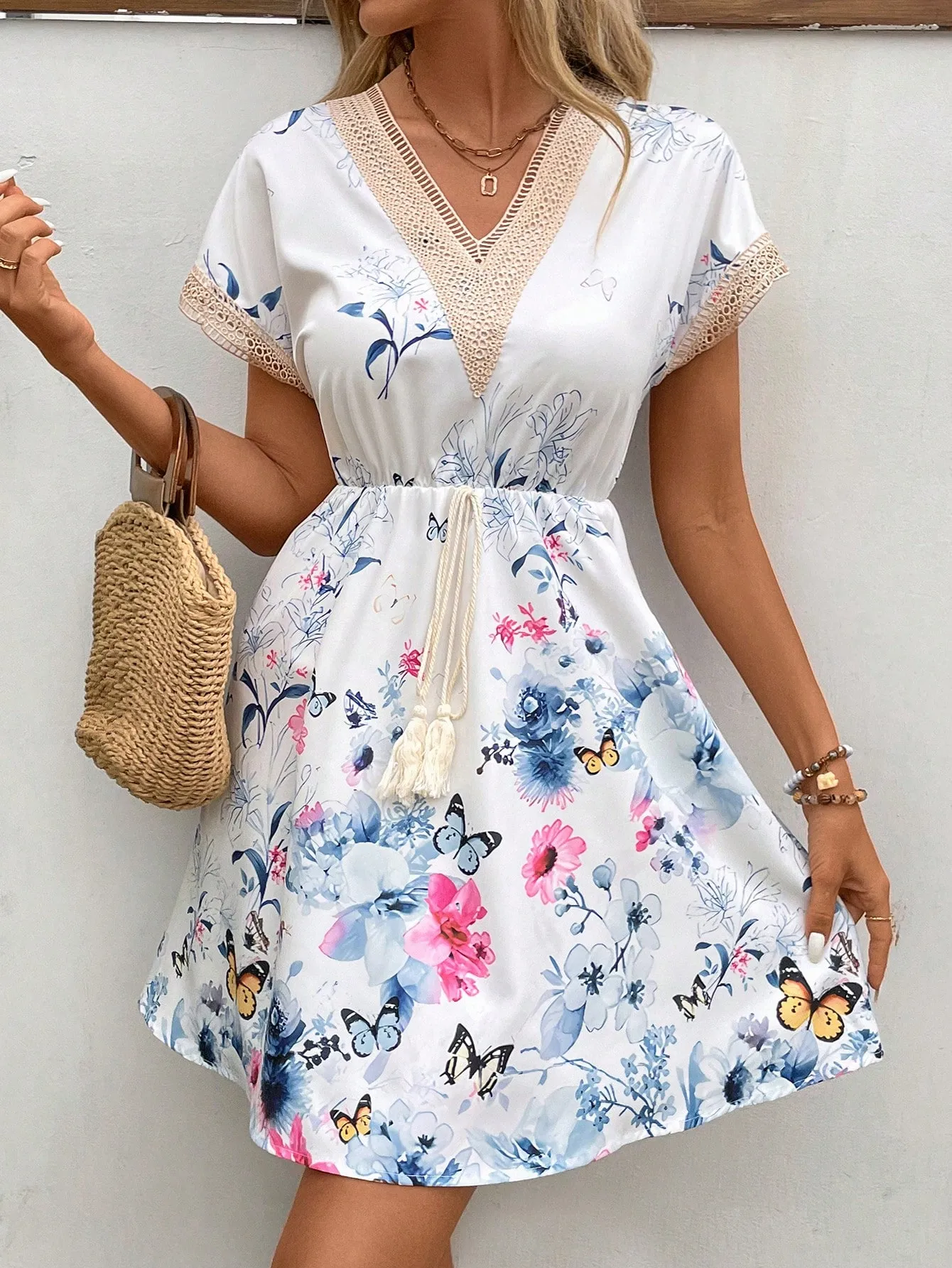 SMY Gorgeous Lace Stitching Trend Small V-Neck Women’s Casual Printed Dress