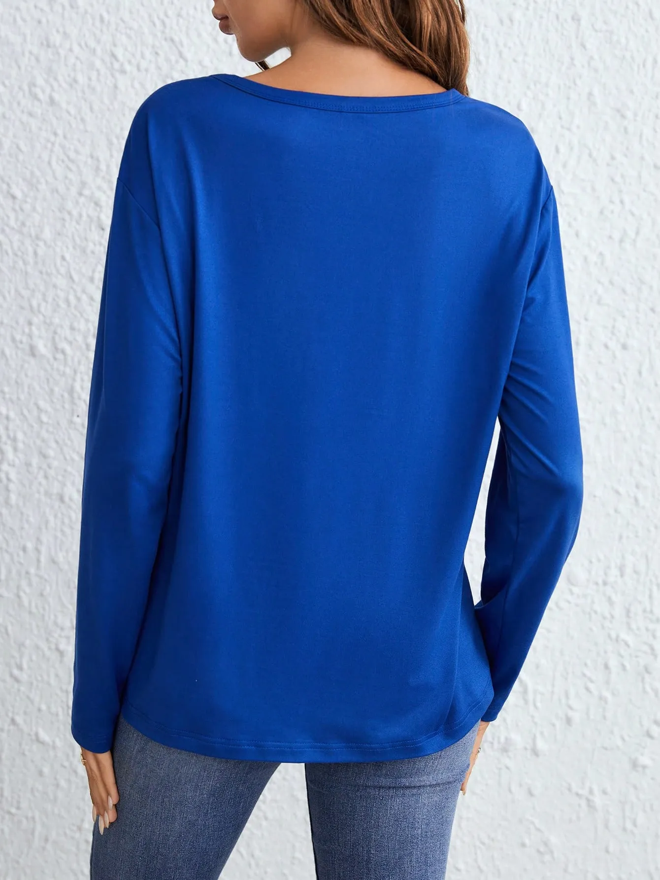 SMY Women’s Solid Color Crossover V-Neck Long Sleeve Pleated Casual T-Shirt