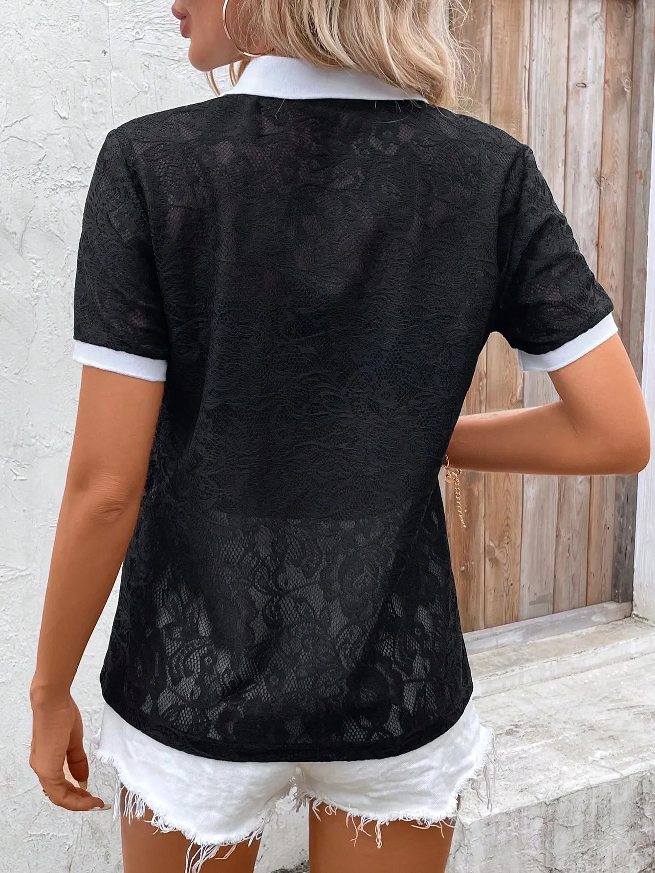 SMY Gorgeous Trend Small V-Neck Women’s Lace Contrasting Polo Neck T-Shirt