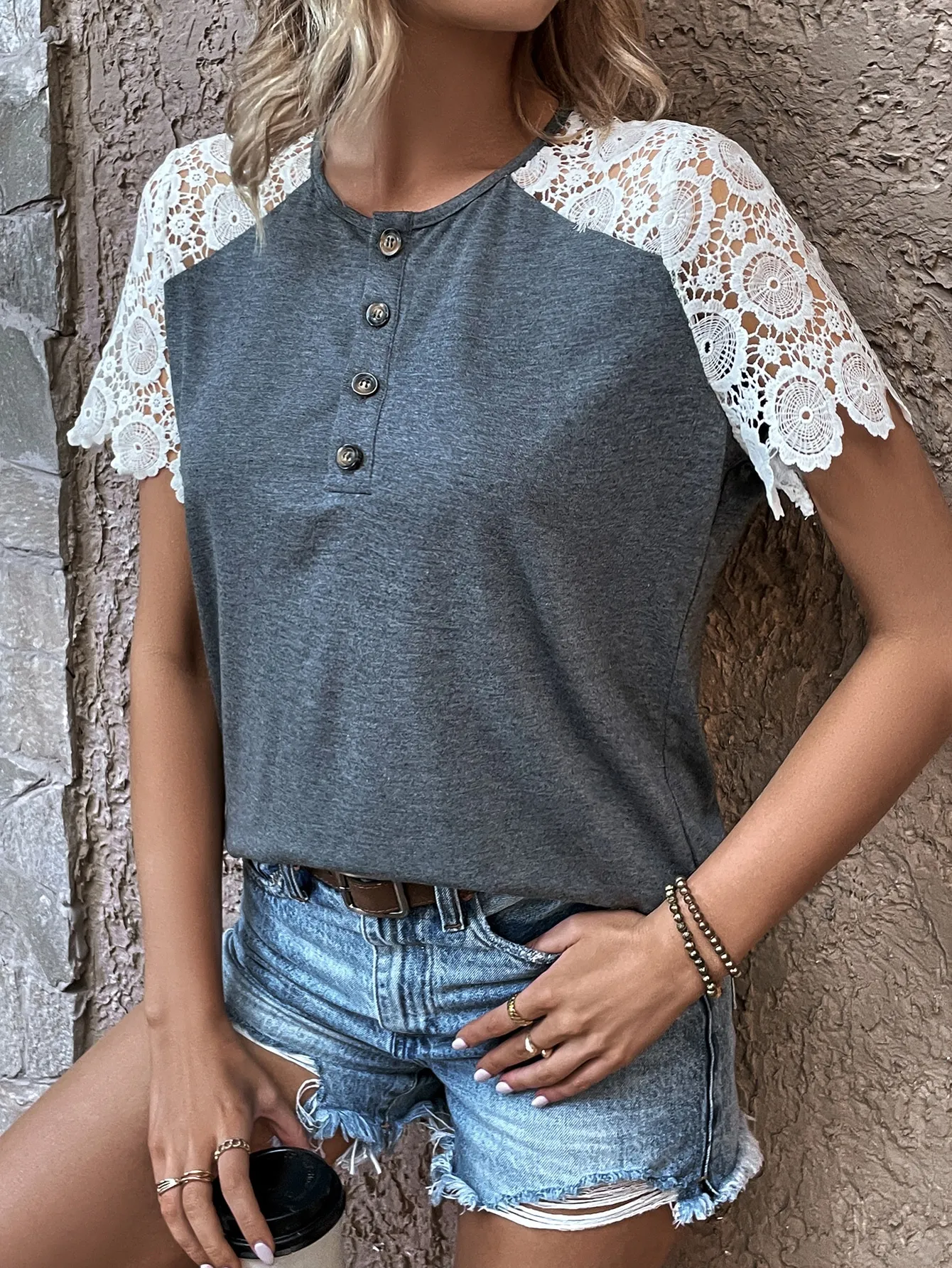 SMY Lace Cuffs Elegant Trend Small Round Neck T-Shirt