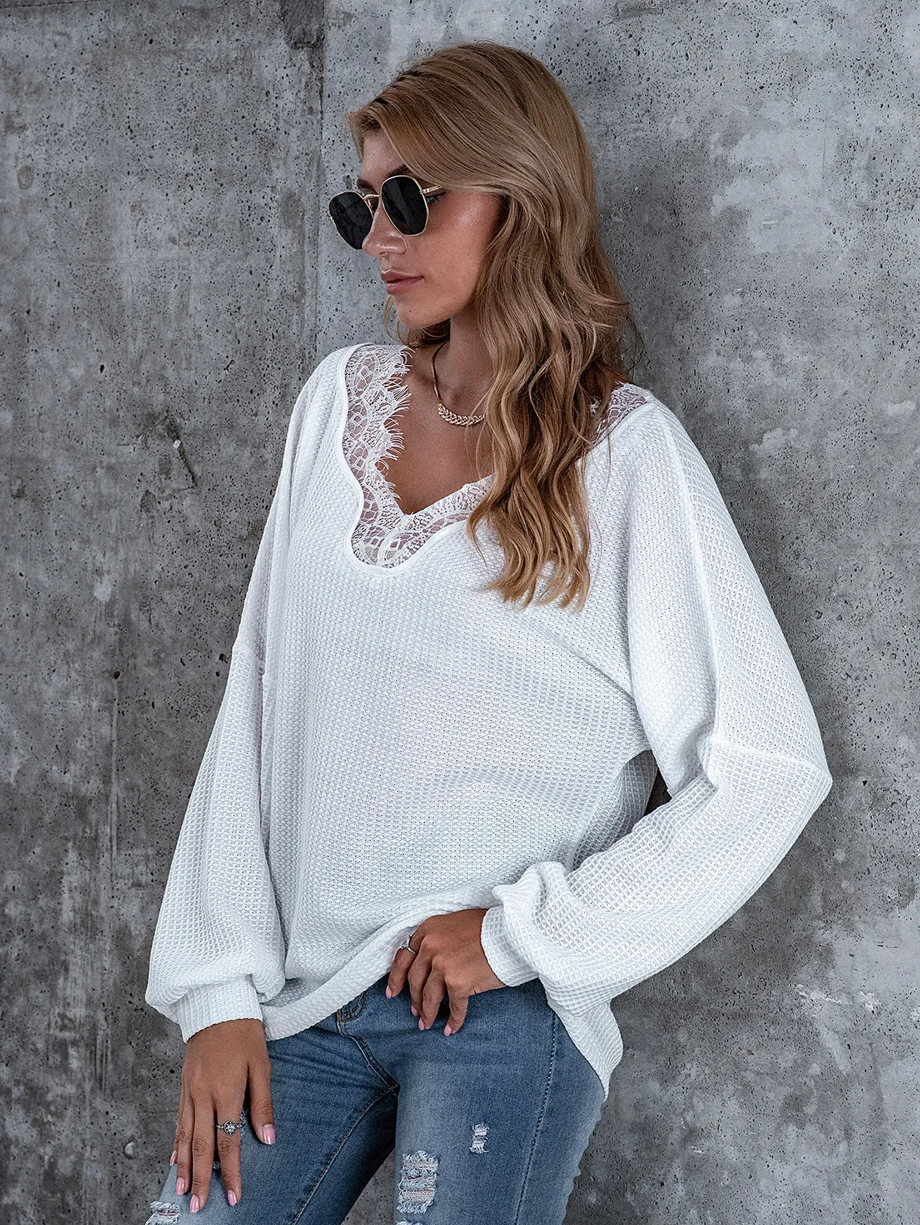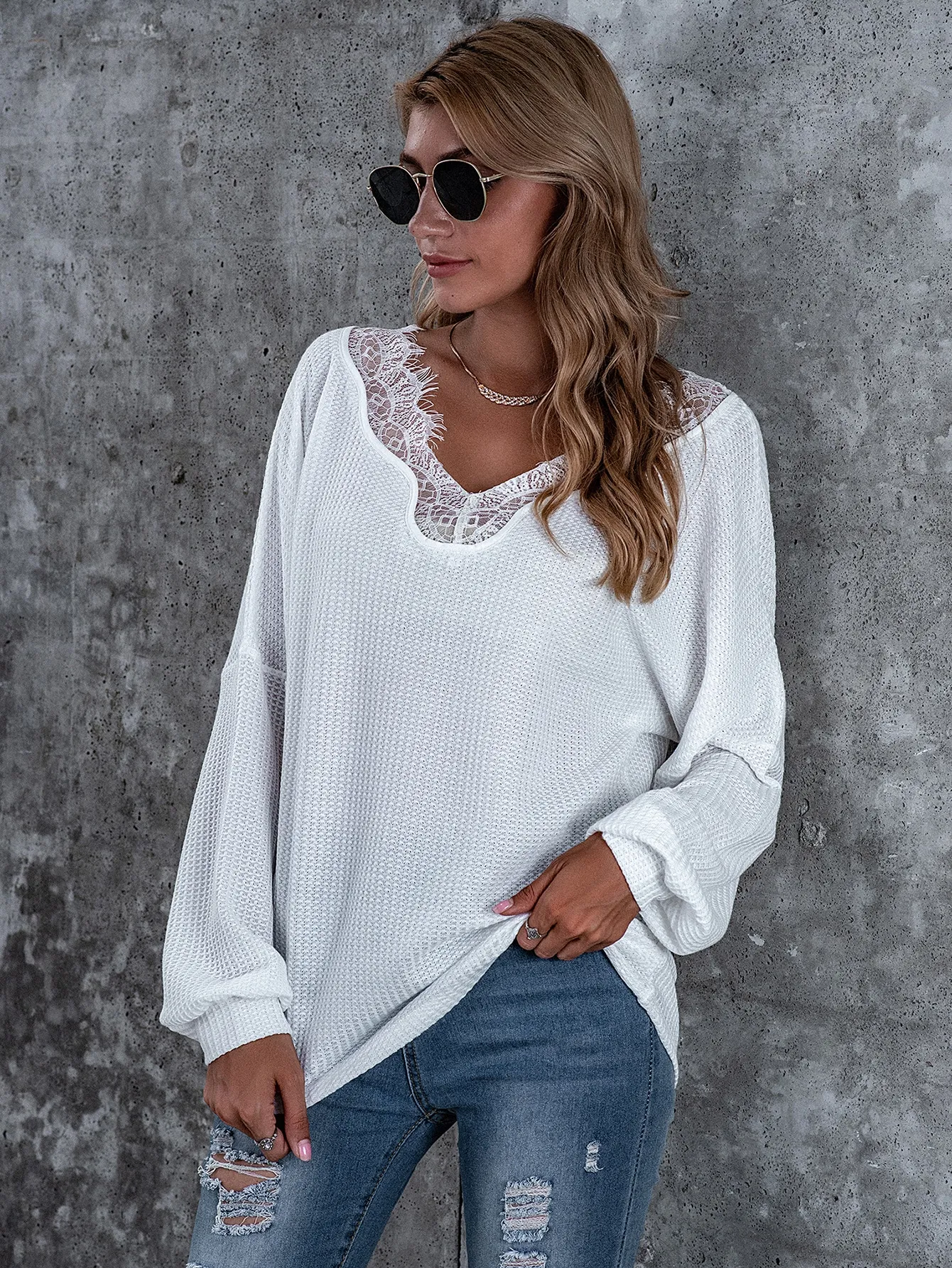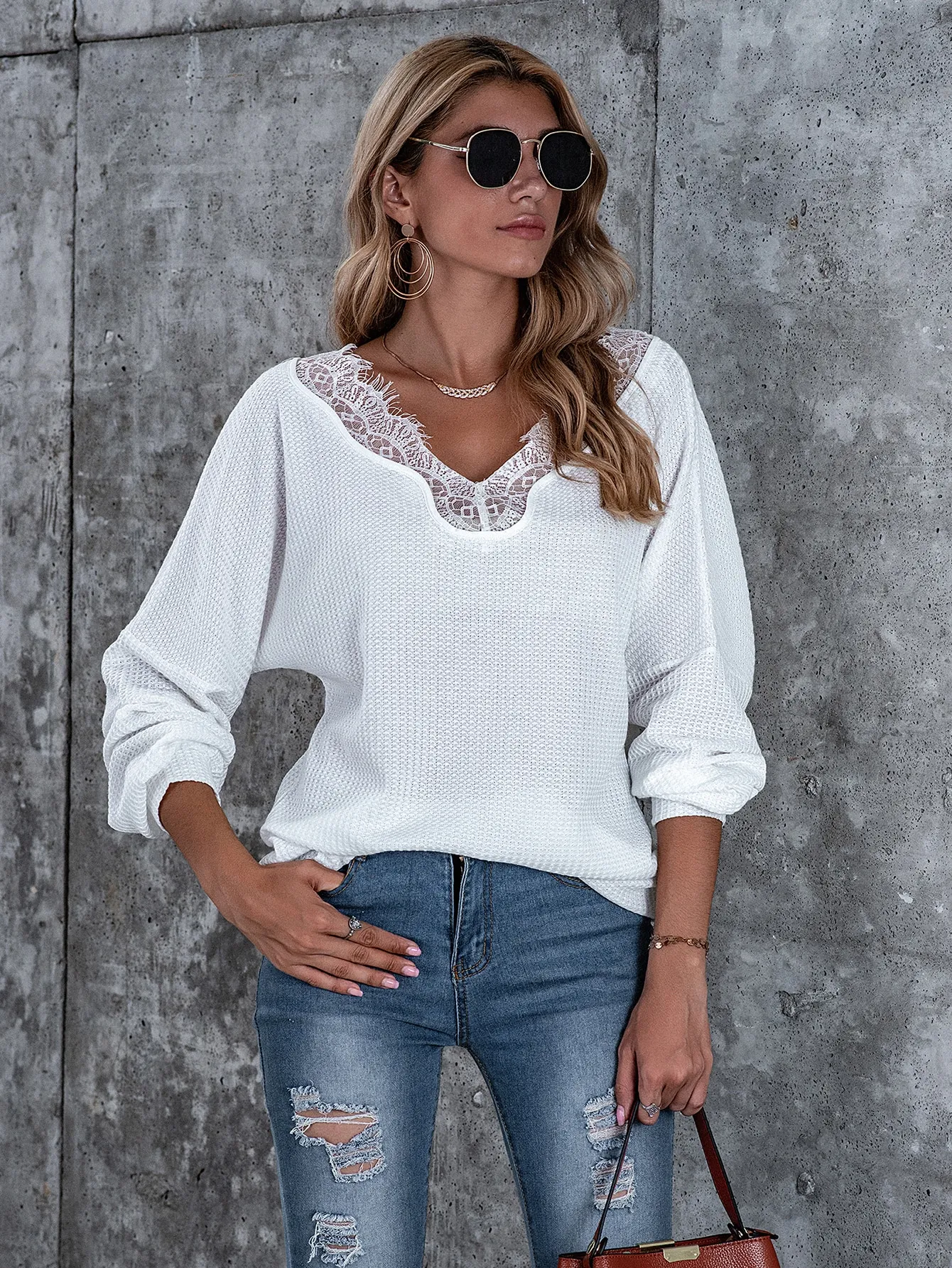SMY Women’s Casual Knitted Contrast Lace Sweatshirt