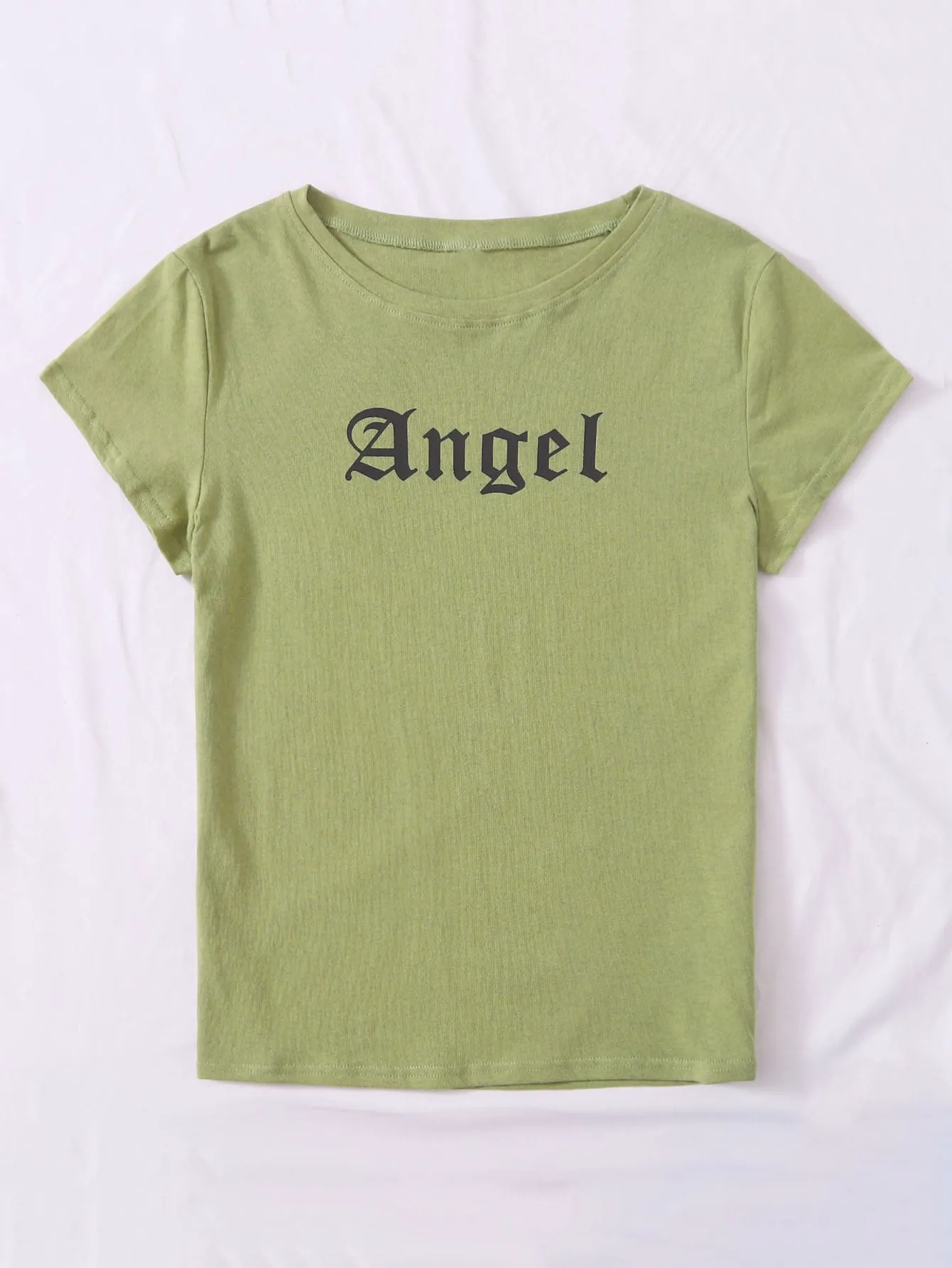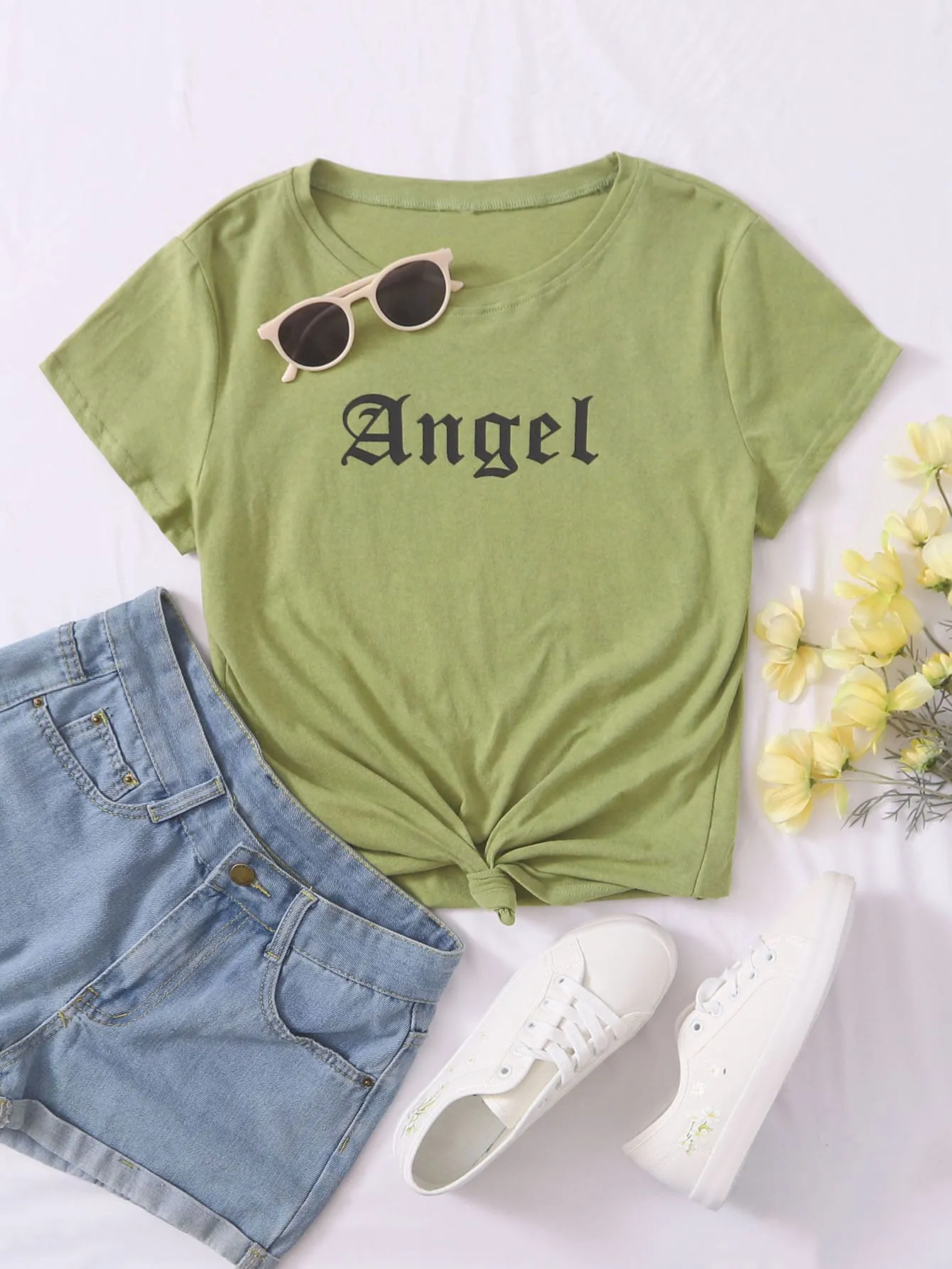 SMY Letter Printed ANGEL Small Round Neck Simple Pattern Printed T-Shirt