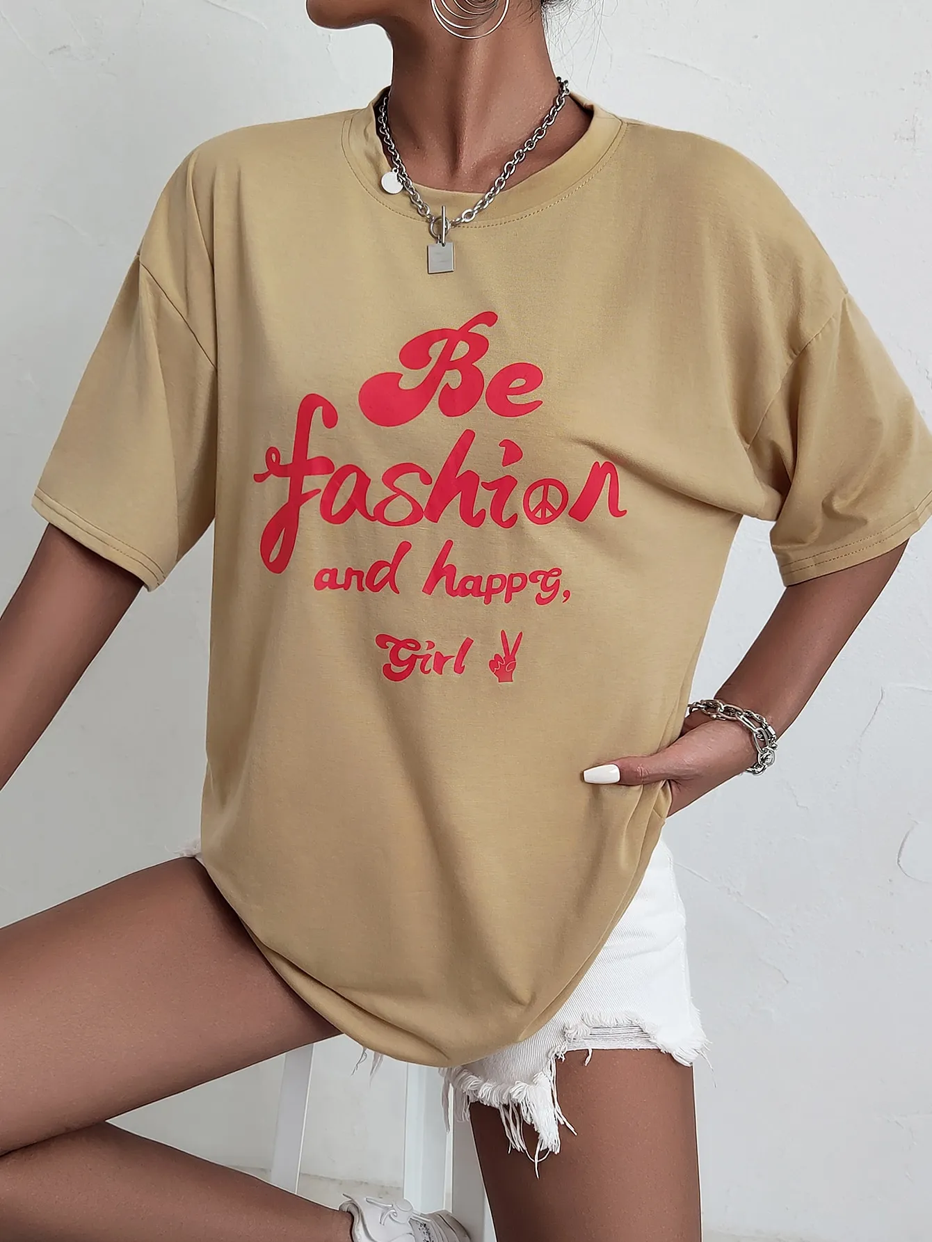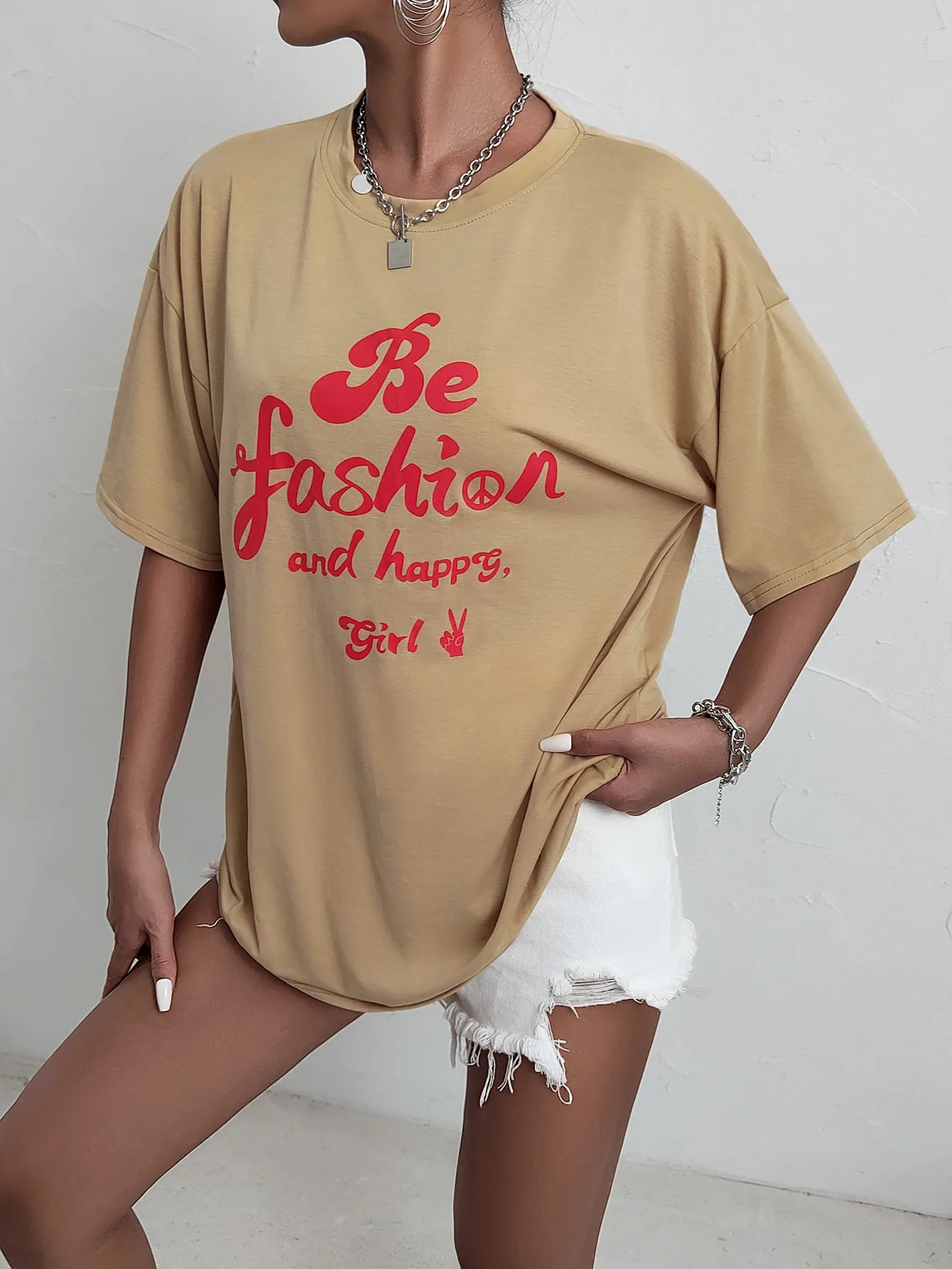 SMY Letter Printed BE FASHION AND HAPPY GIRL Casual Round Neck T-Shirt