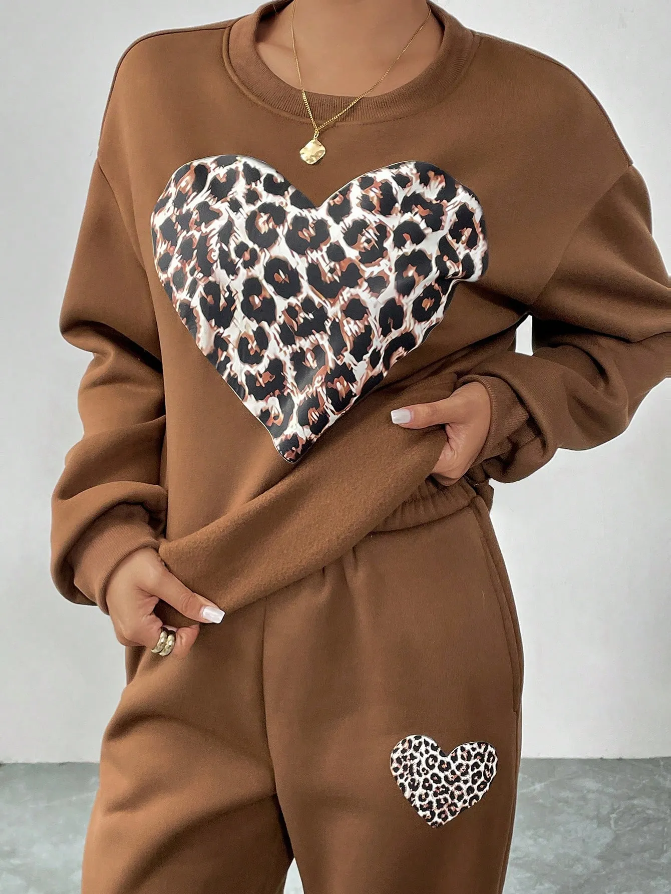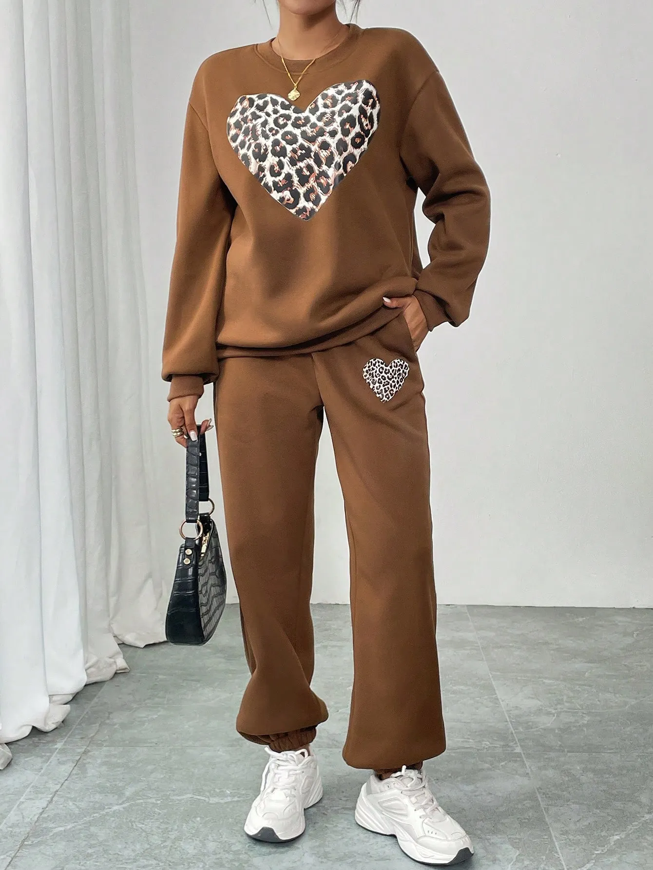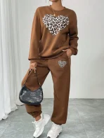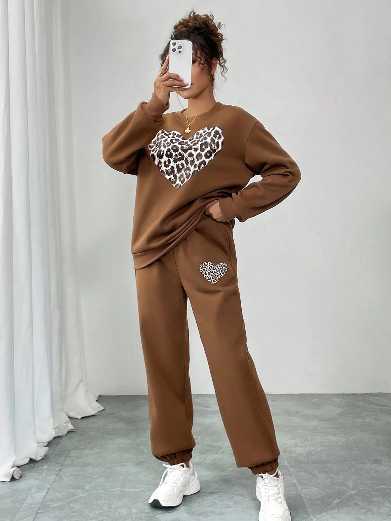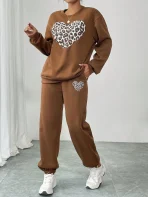 SMY Women’s Fashion Khaki Leopard Print Heart Pattern Casual Suit