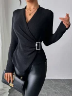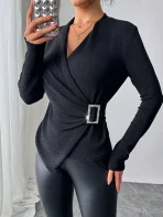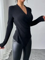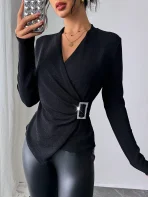 SMY Women’s Solid Color Crossover V-Neck Long Sleeve Pleated Casual T-Shirt