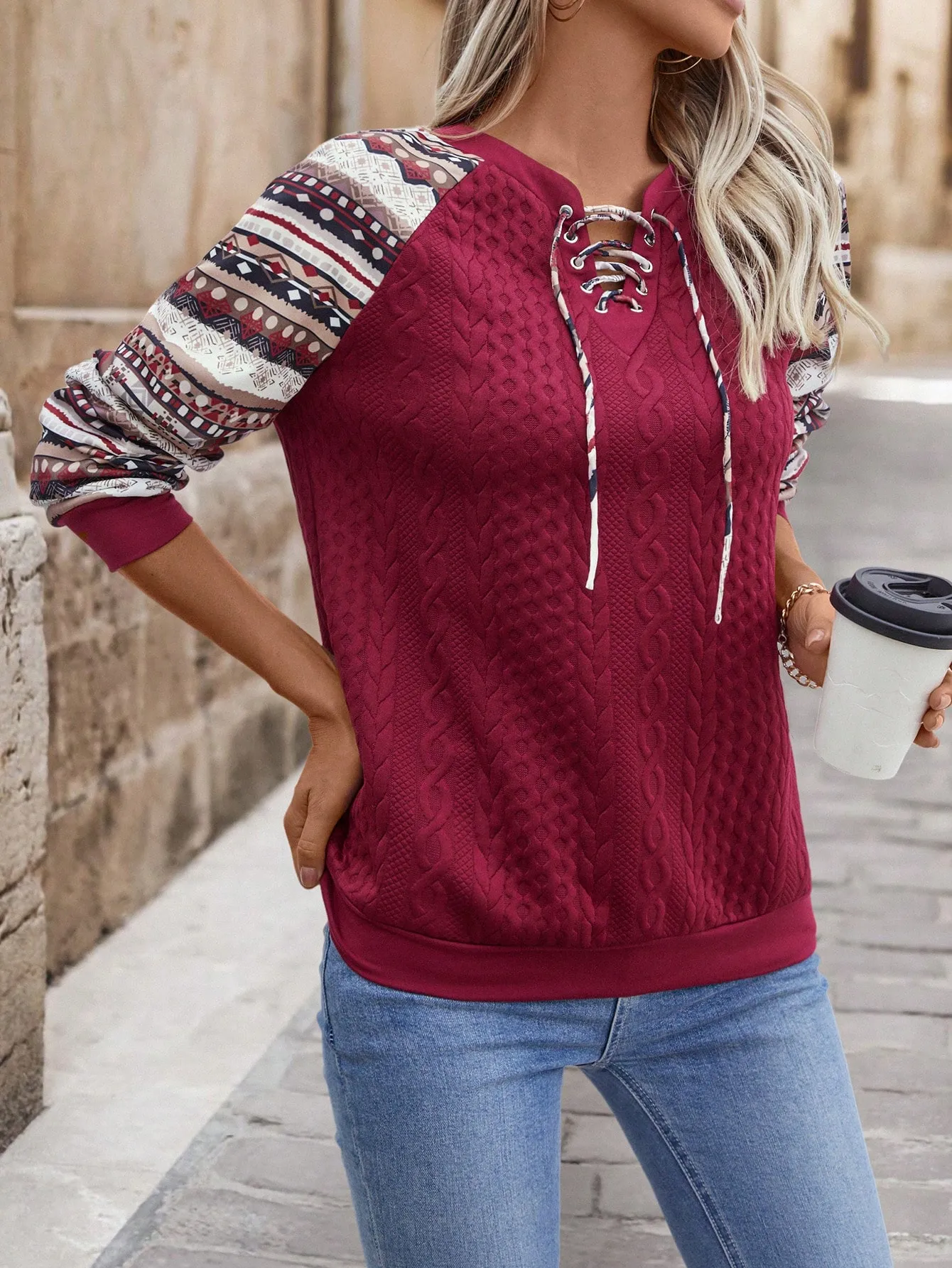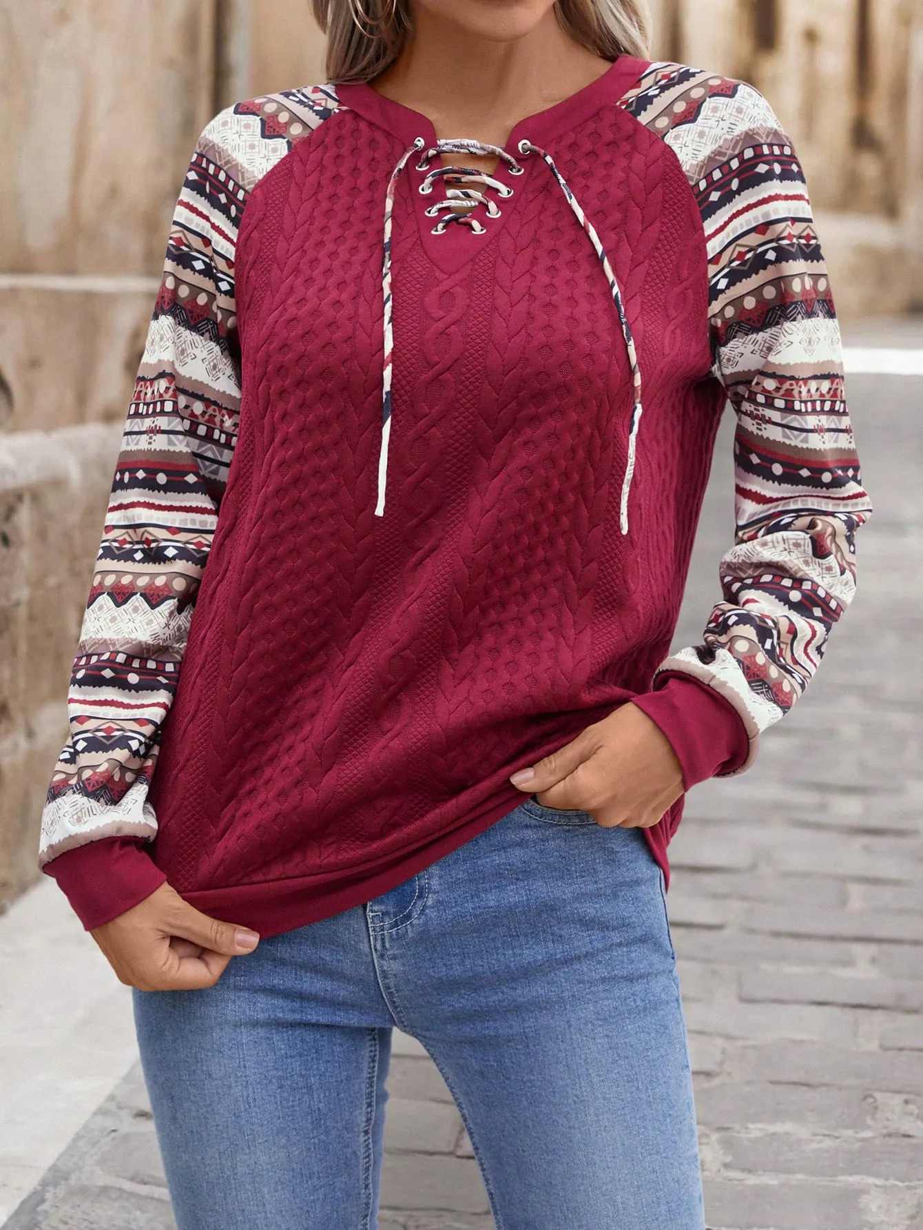 SMY Women’s Fashion Wine Red Hoodie Sweatshirt With Knitted Patterned Sleeves