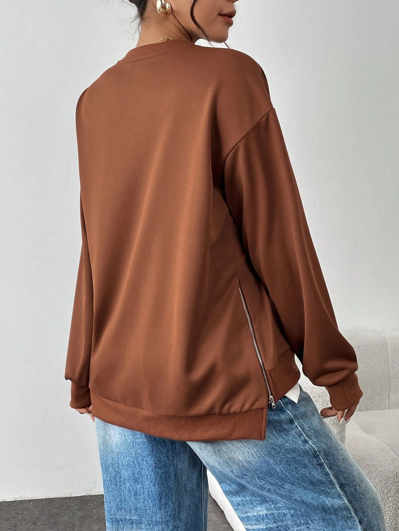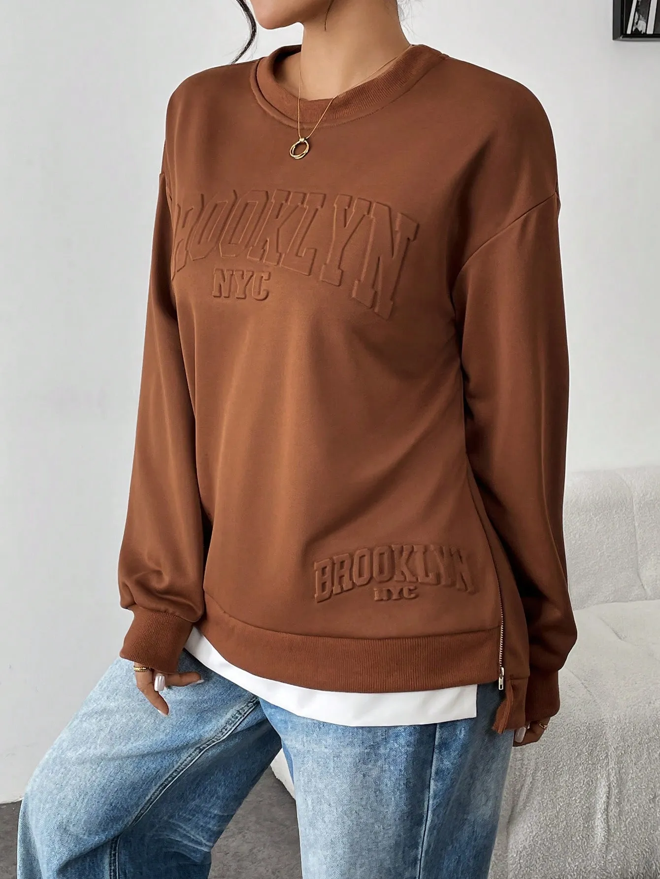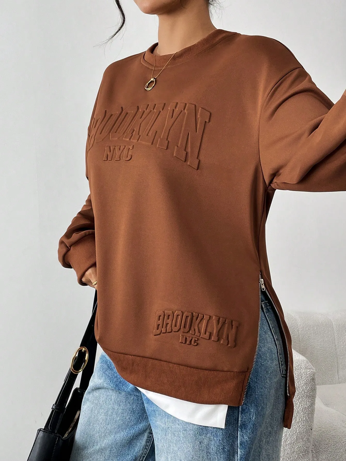 SMY Women’s Fashionable Casual Letter Embossed Hem Slit Zip Up Hoodie