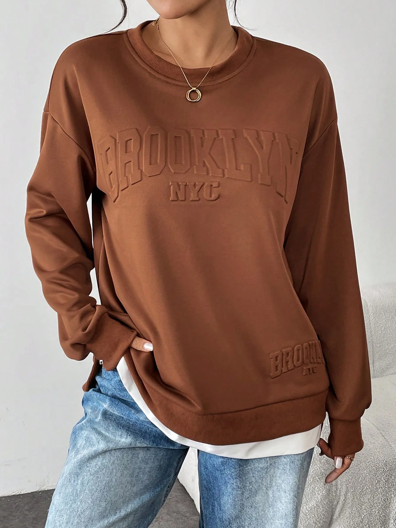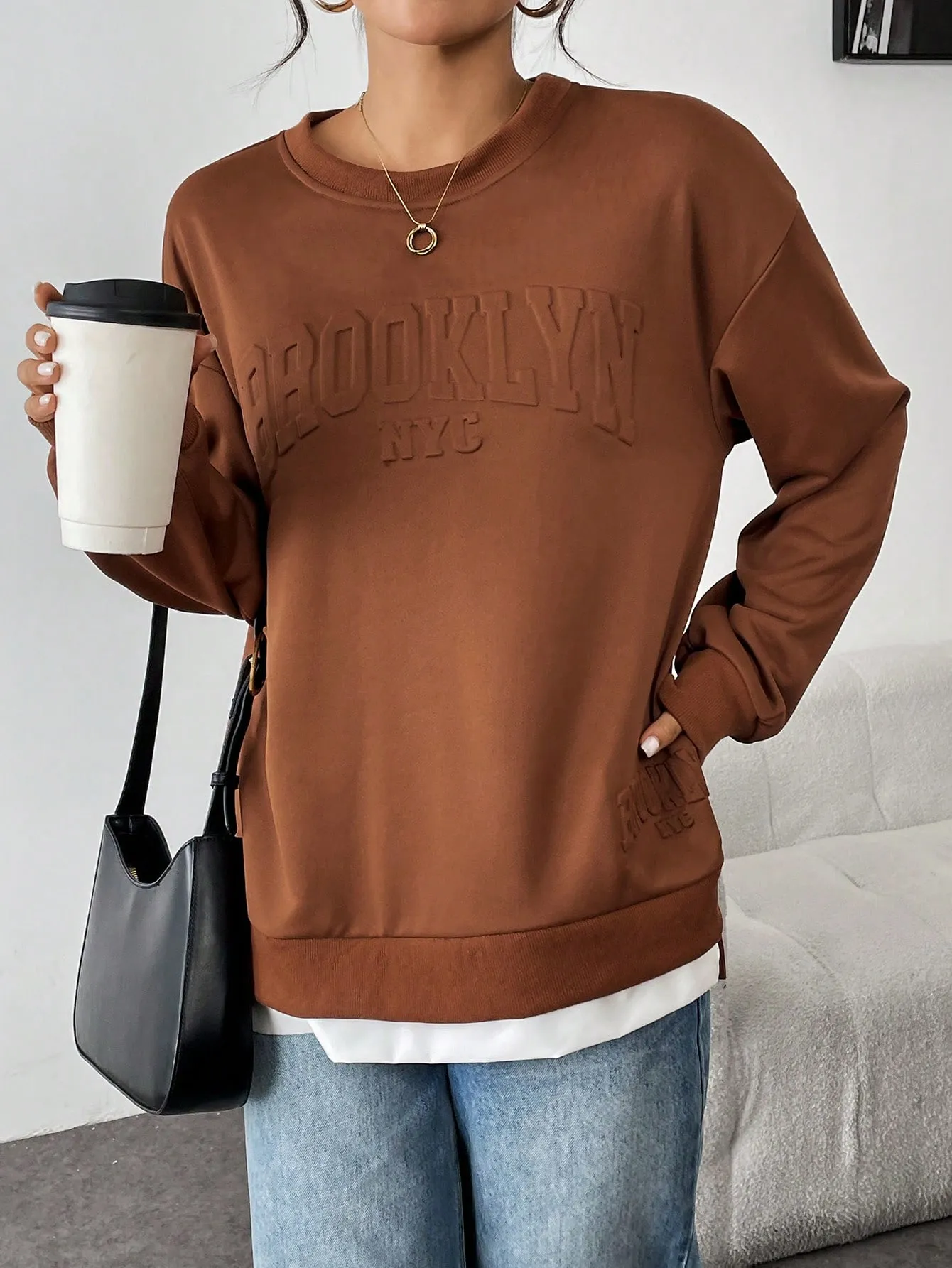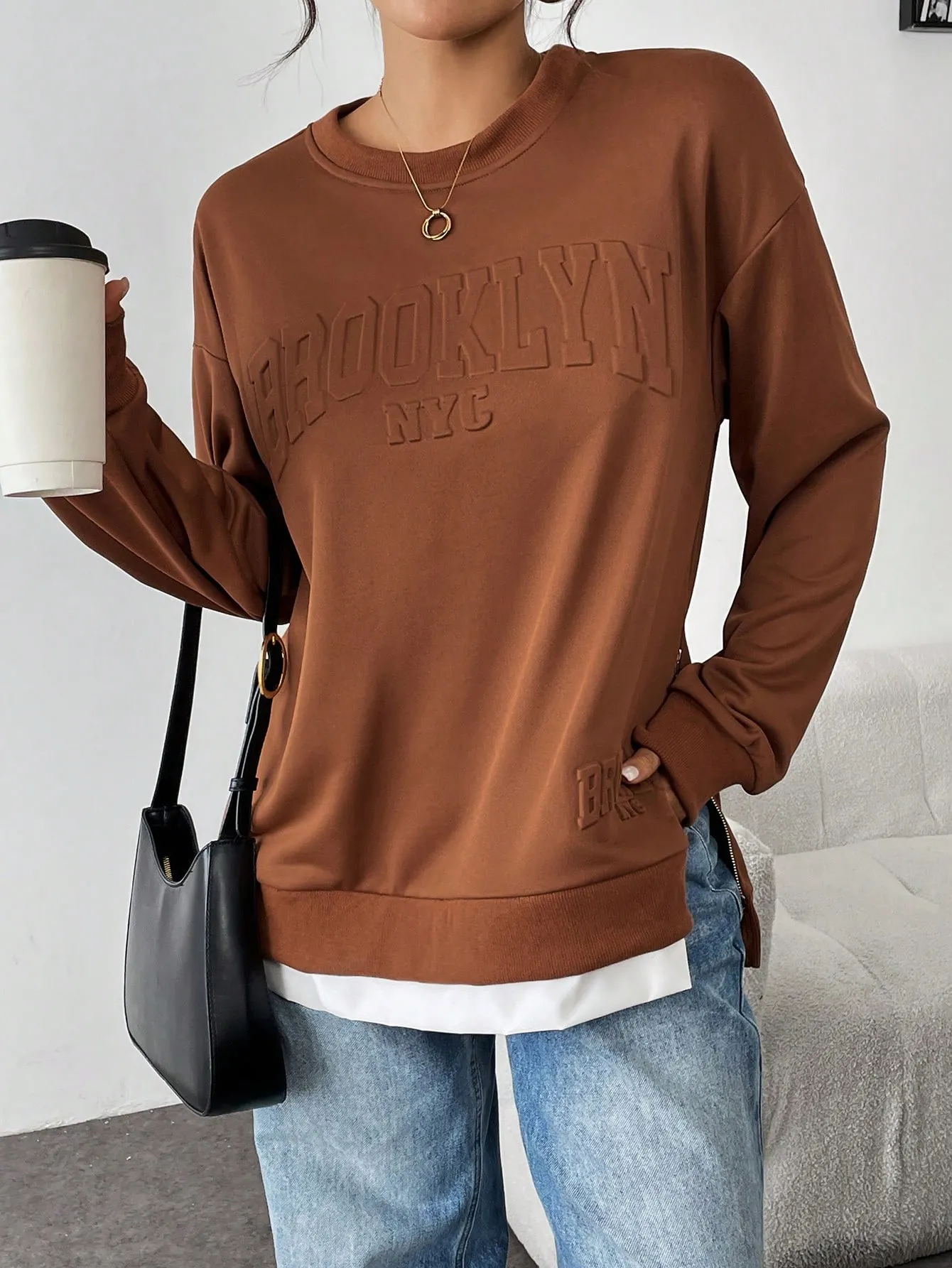 SMY Women’s Fashionable Casual Letter Embossed Hem Slit Zip Up Hoodie