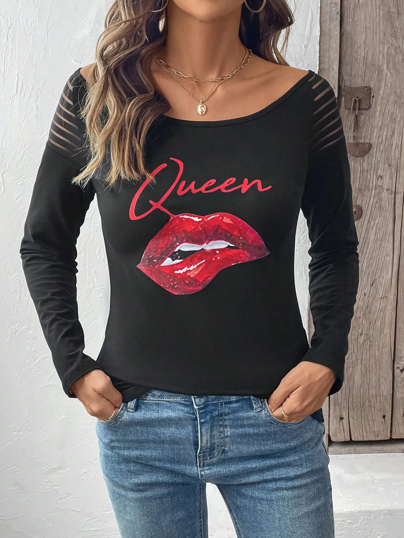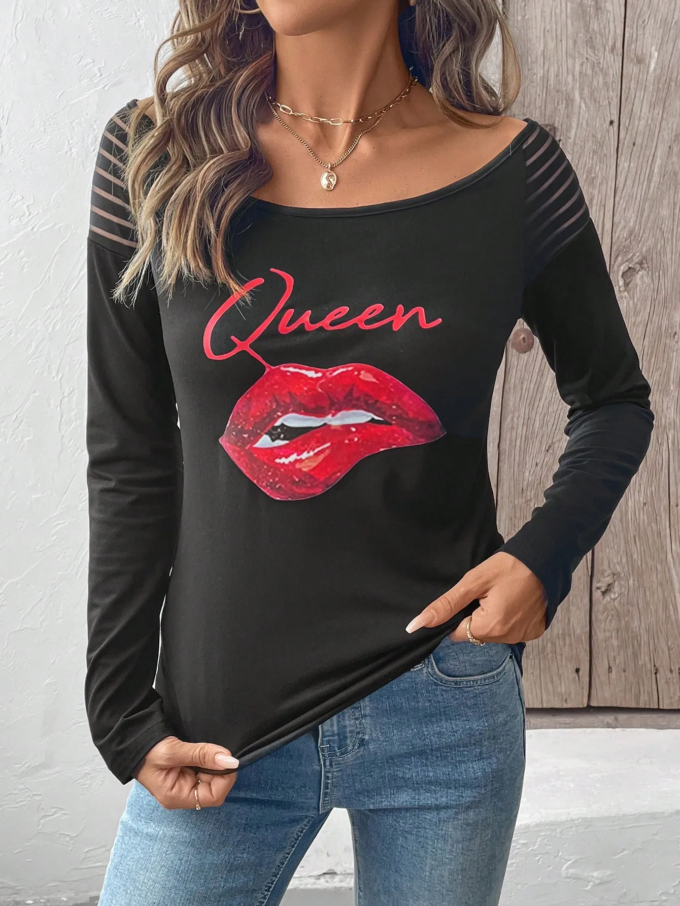 SMY Women’s Fashionable Sexy Red Lips & Letter Print T-Shirt