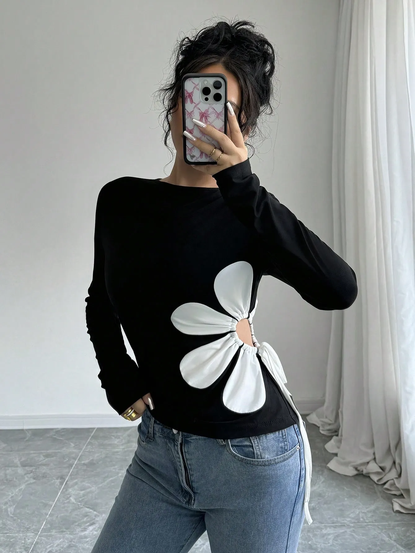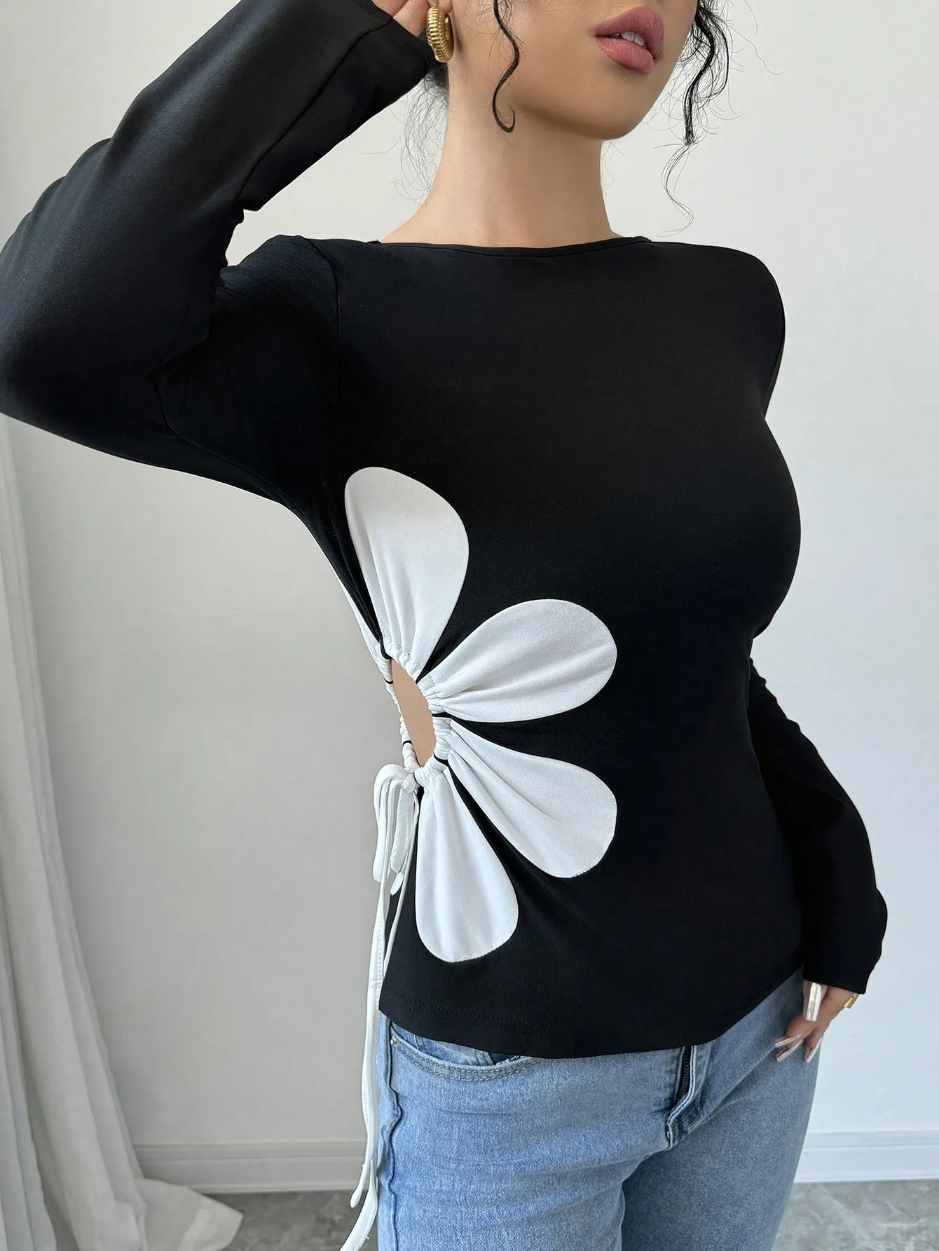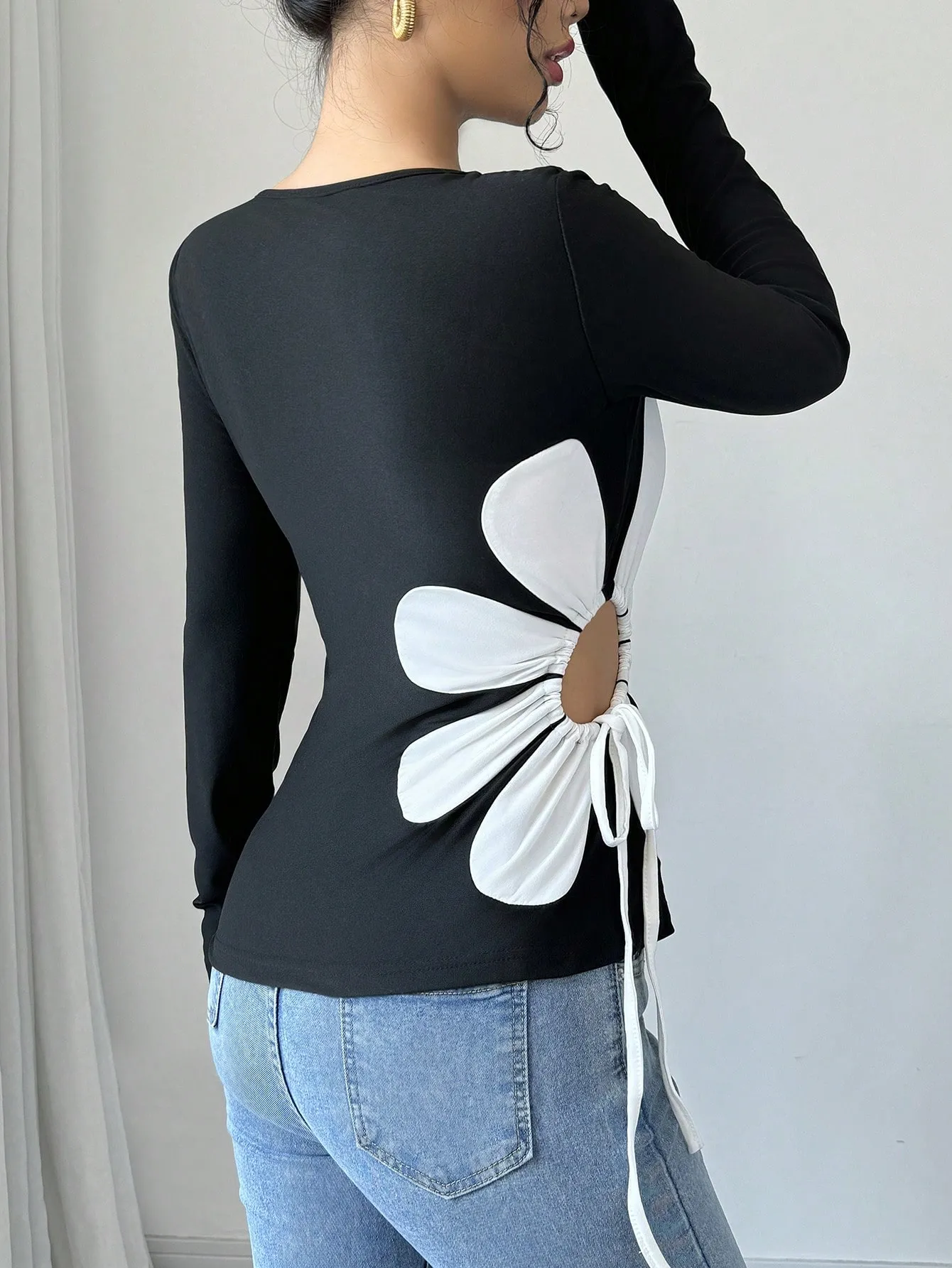 SMY Women’s Fitted Crew Neck Long Sleeve Waist Hollow-Out Drawstring T-Shirt